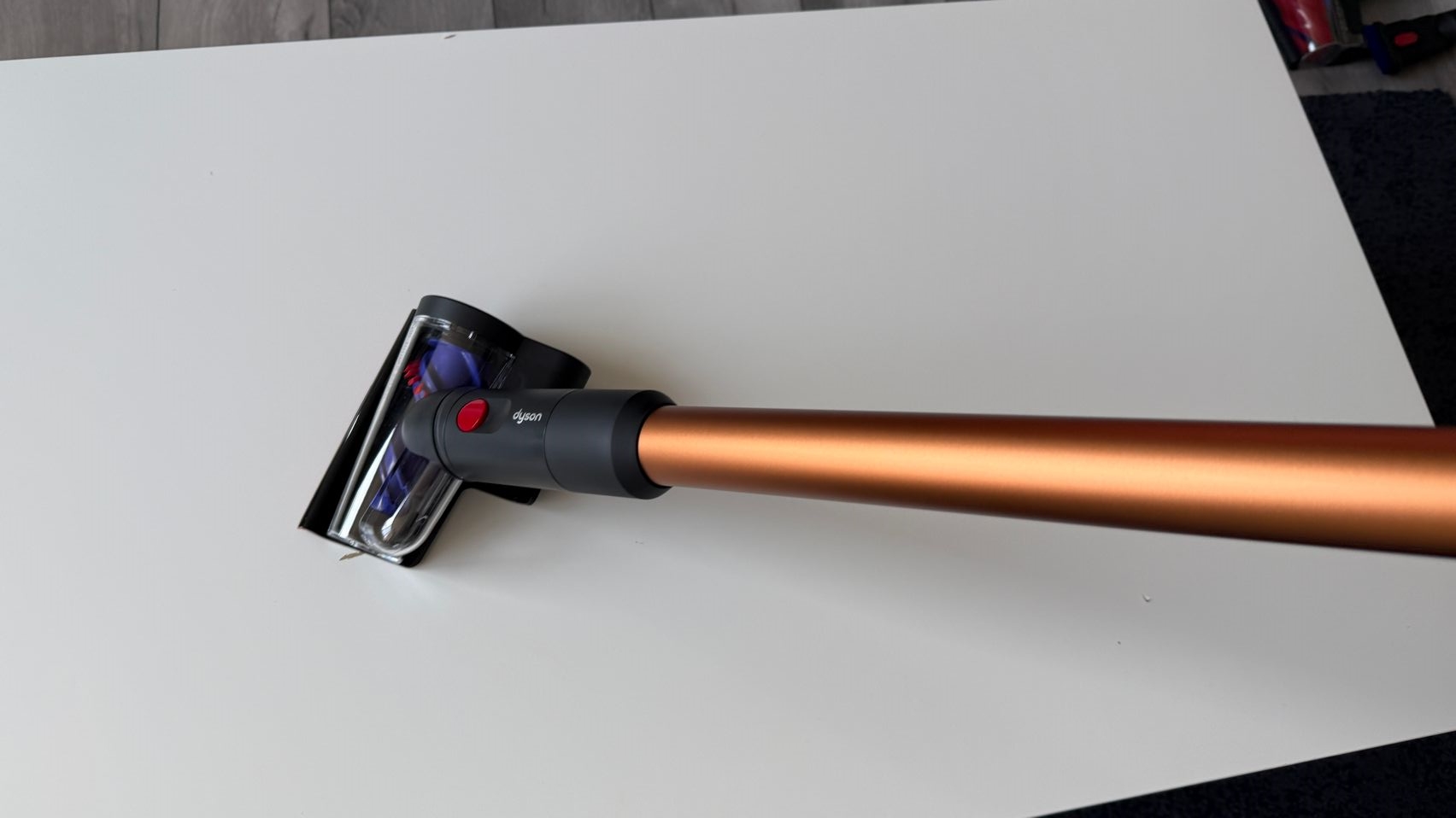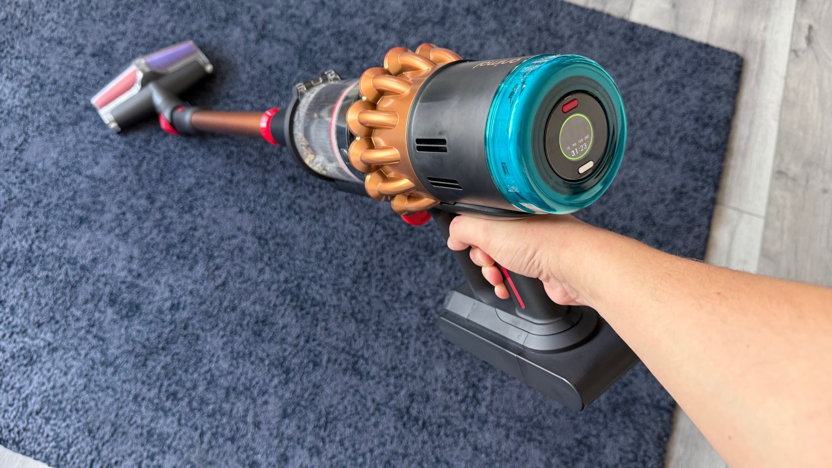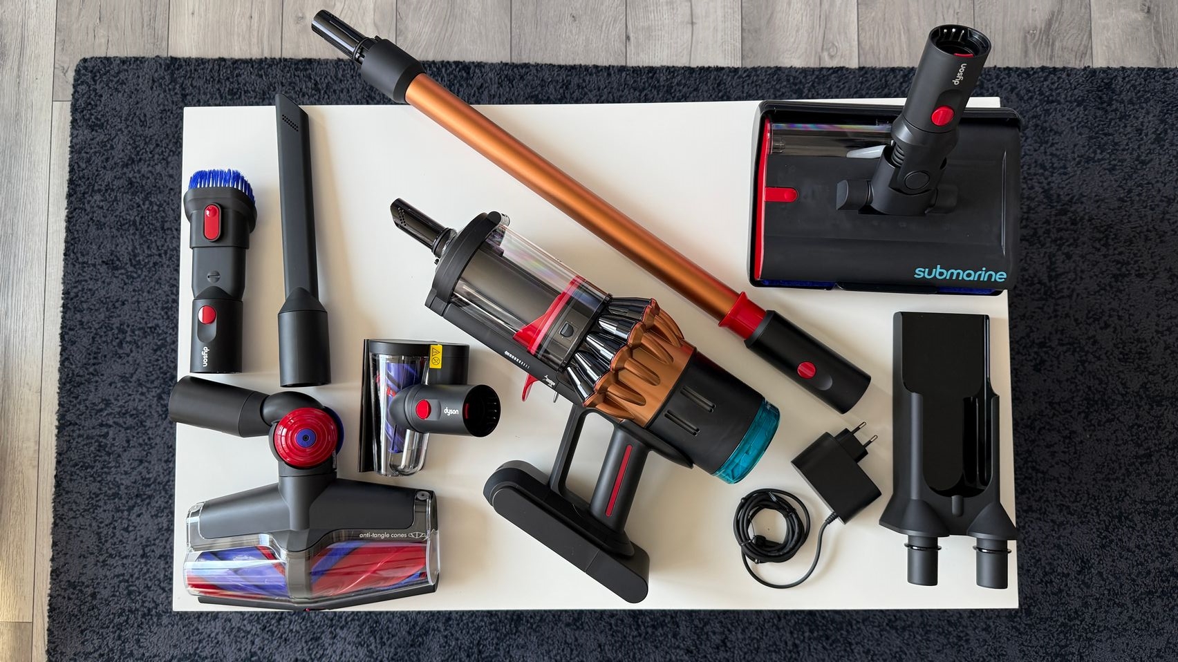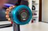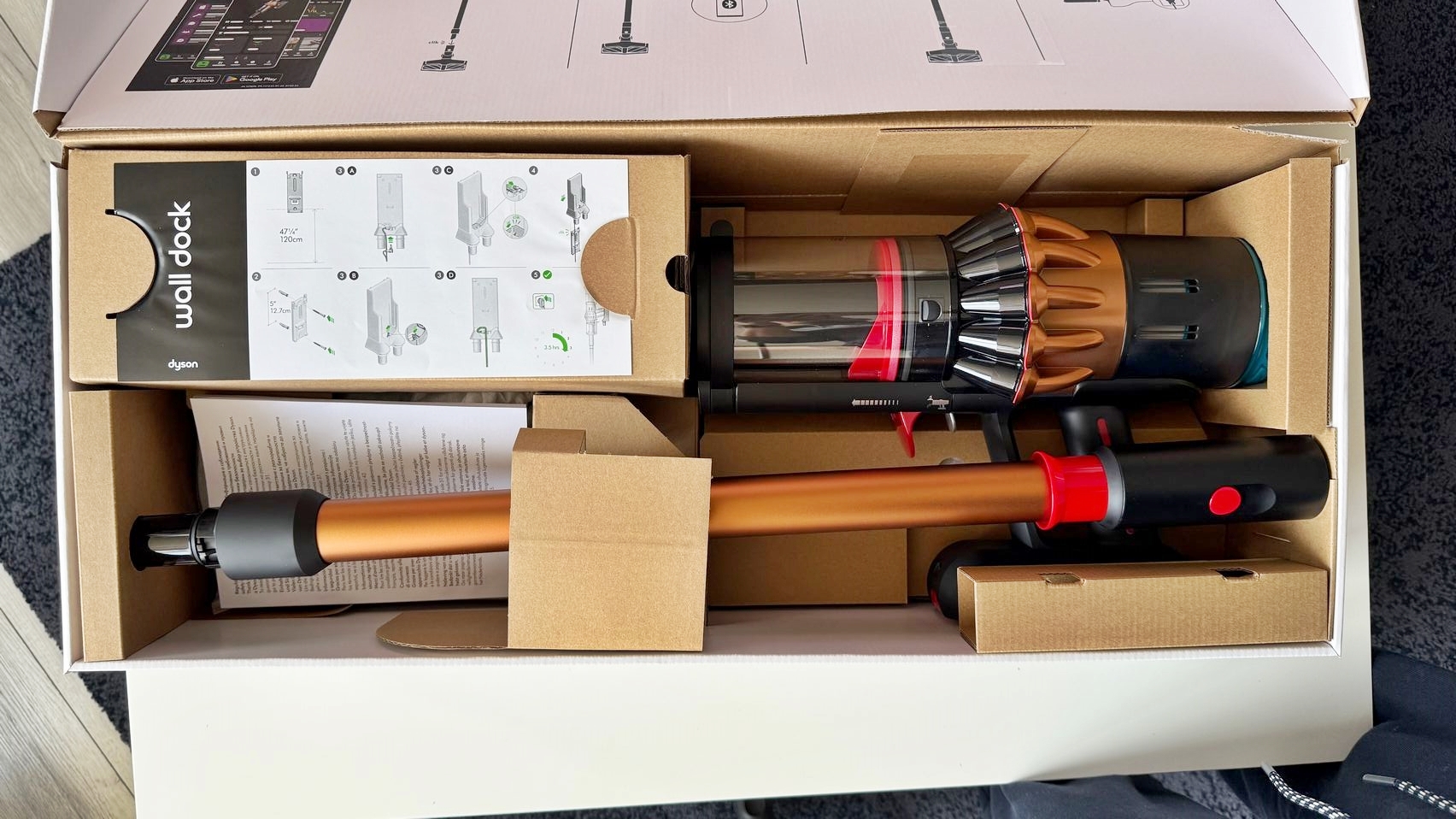 Legat de accesorii, în cutie am dat de soluții de curățare potrivite pentru orice suprafață, de la podele şi covoare până la locuri greu accesibile. Totul este extrem de bine organizat la interior și mi-e teamă că nu voi mai reuși să pun totul cap la cap odată ce trebuie returnat aspiratorul către Dyson. Așa, trecând peste, am găsit aici unitatea central, aspiratorul, greoi la prima impresie și așa spune și lista de dotări, având 3.5 kg. Ca design, arată diferit faţă de rivalii săi, cu o combinaţie de nuanţe vii, ca roşu şi albastru, plus acel tub de culoarea bronzului. Zici ca e din Cyberpunk! Fiind vertical nu trebuie să te mai apleci şi nici să tragi de vreun aspirator cu rotiţe sau corp masiv.