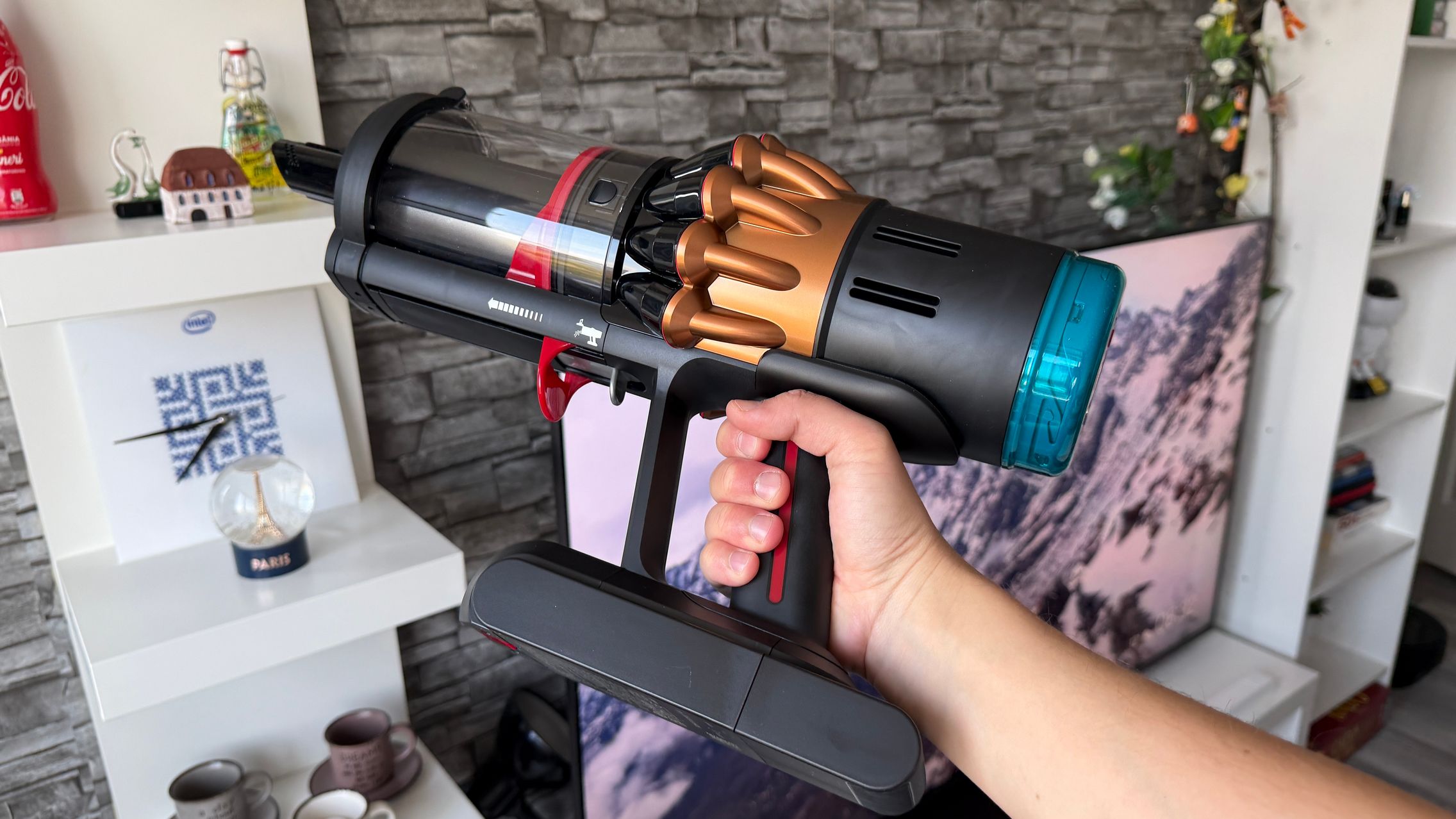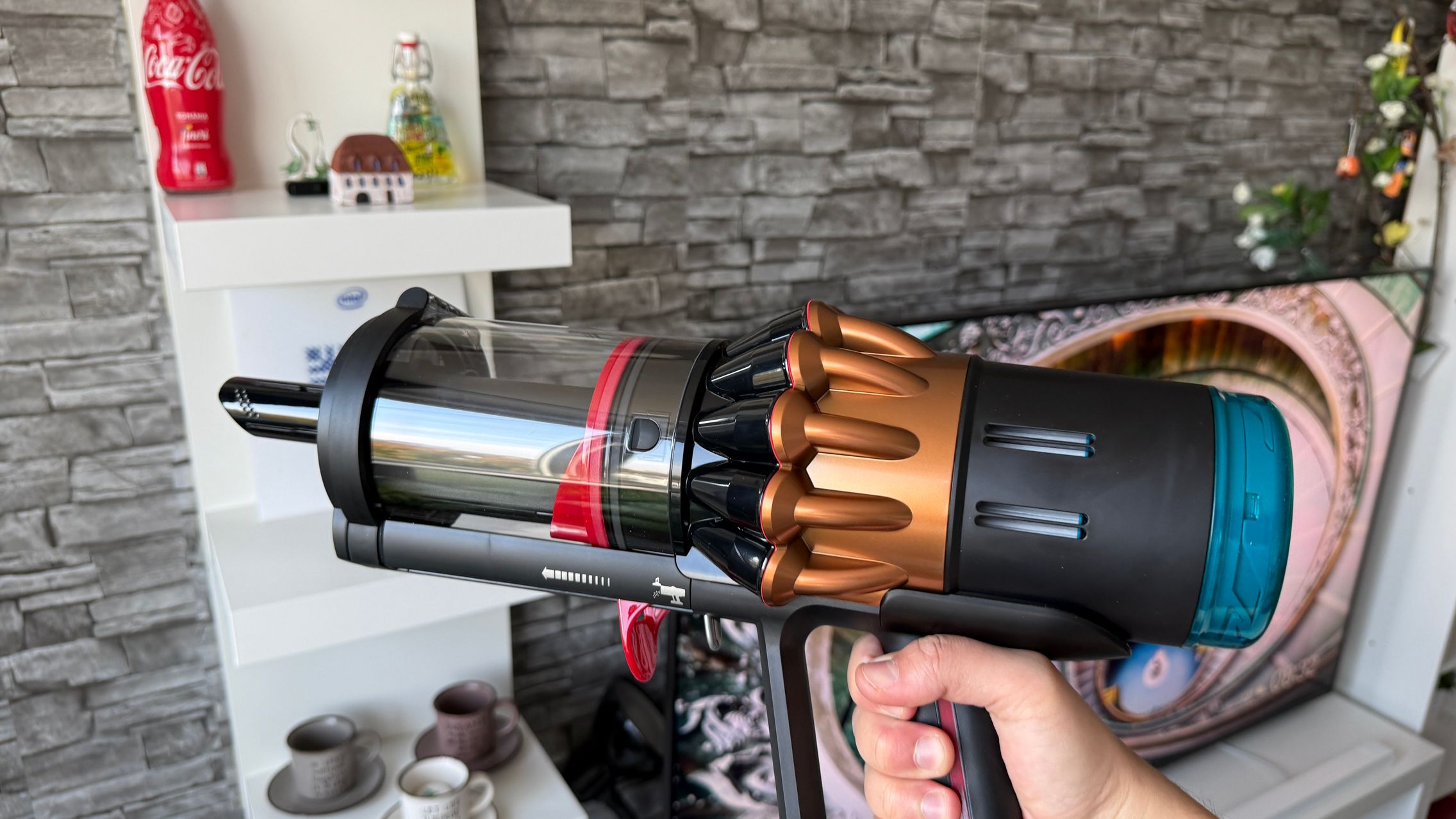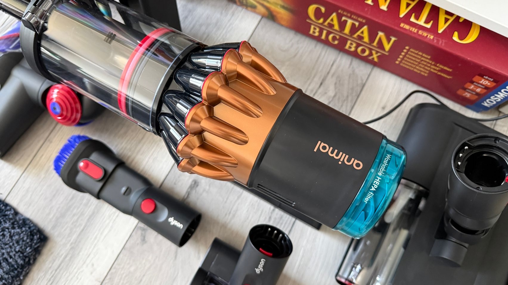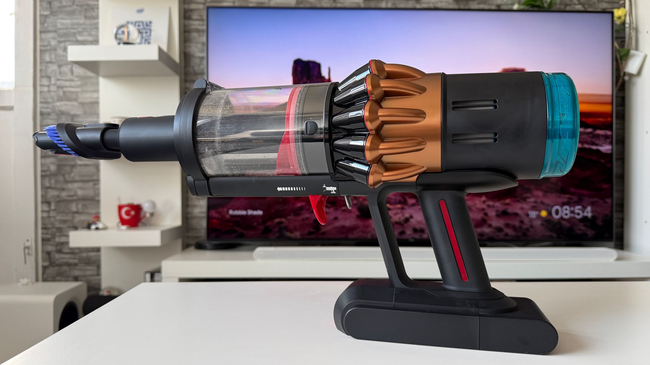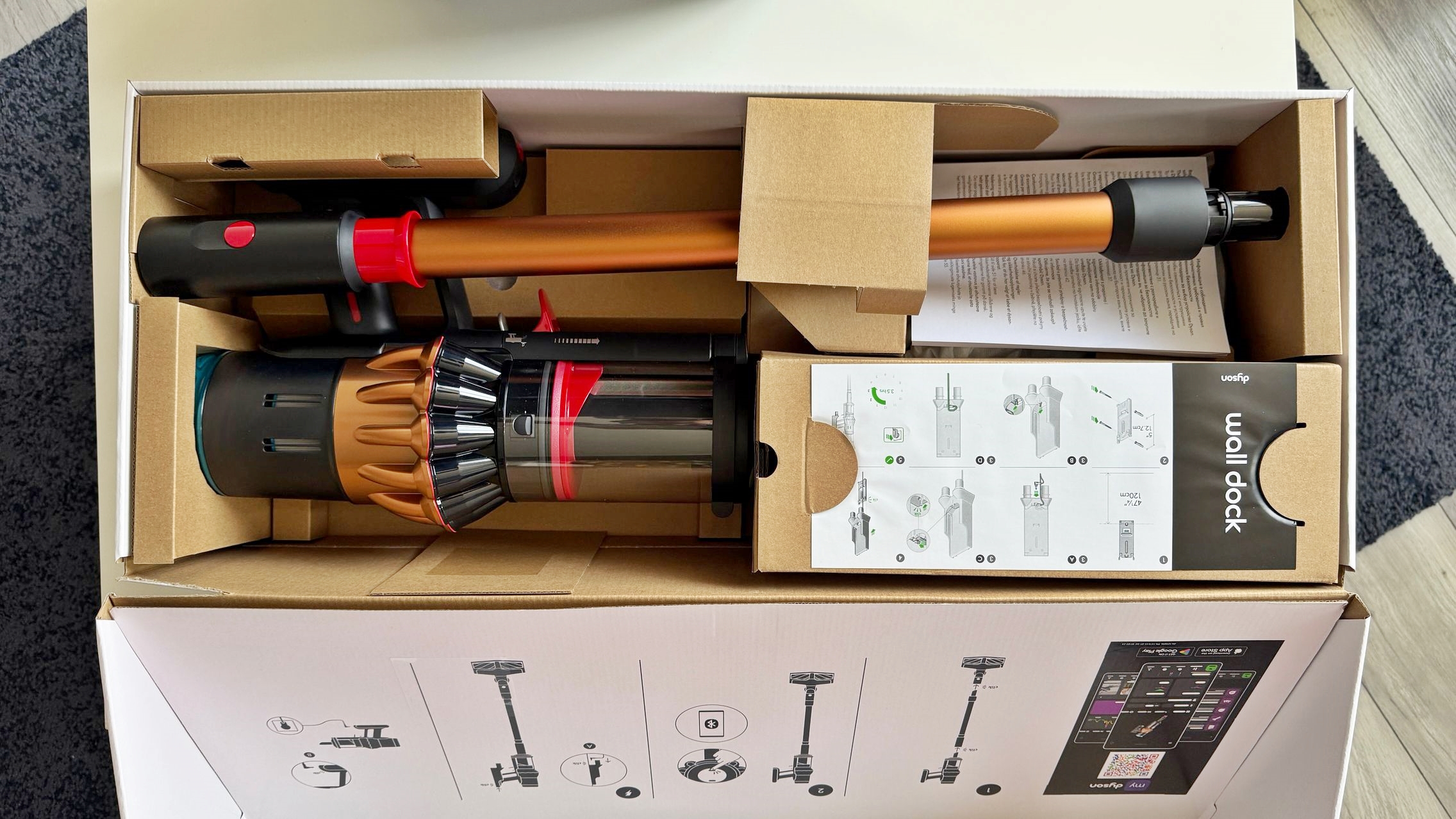 Legat de accesorii, în cutie am dat de soluții de curățare potrivite pentru orice suprafață, de la podele şi covoare până la locuri greu accesibile. Totul este extrem de bine organizat la interior și mi-e teamă că nu voi mai reuși să pun totul cap la cap odată ce trebuie returnat aspiratorul către Dyson. Așa, trecând peste, am găsit aici unitatea central, aspiratorul, greoi la prima impresie și așa spune și lista de dotări, având 3.5 kg. Ca design, arată diferit faţă de rivalii săi, cu o combinaţie de nuanţe vii, ca roşu şi albastru, plus acel tub de culoarea bronzului. Zici ca e din Cyberpunk! Fiind vertical nu trebuie să te mai apleci şi nici să tragi de vreun aspirator cu rotiţe sau corp masiv.