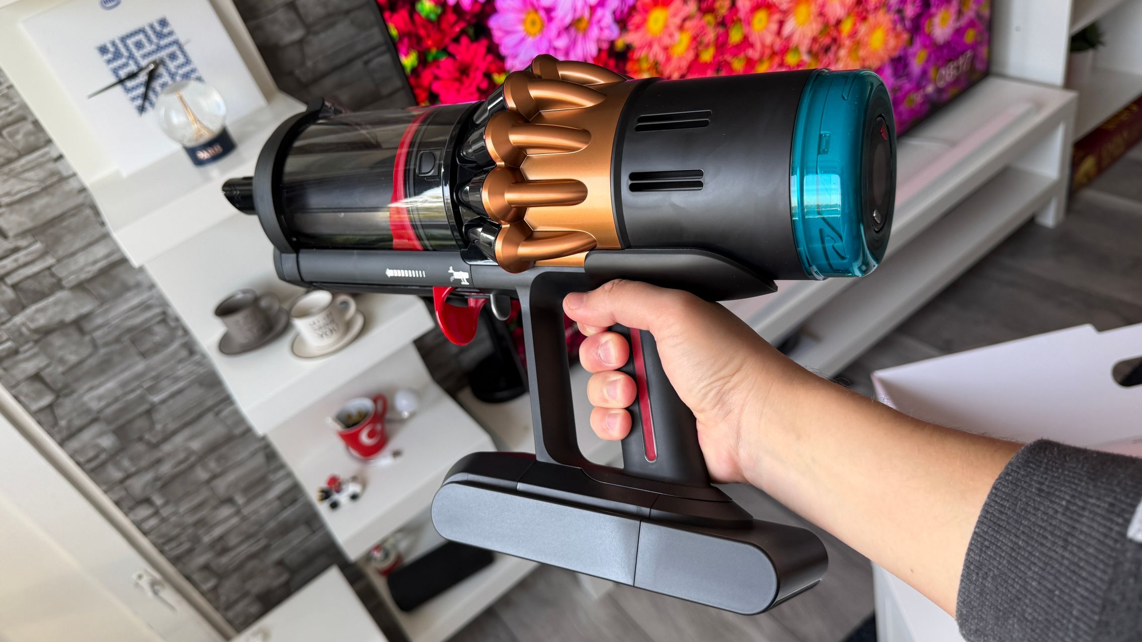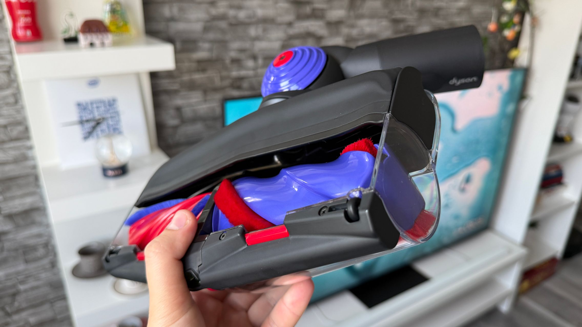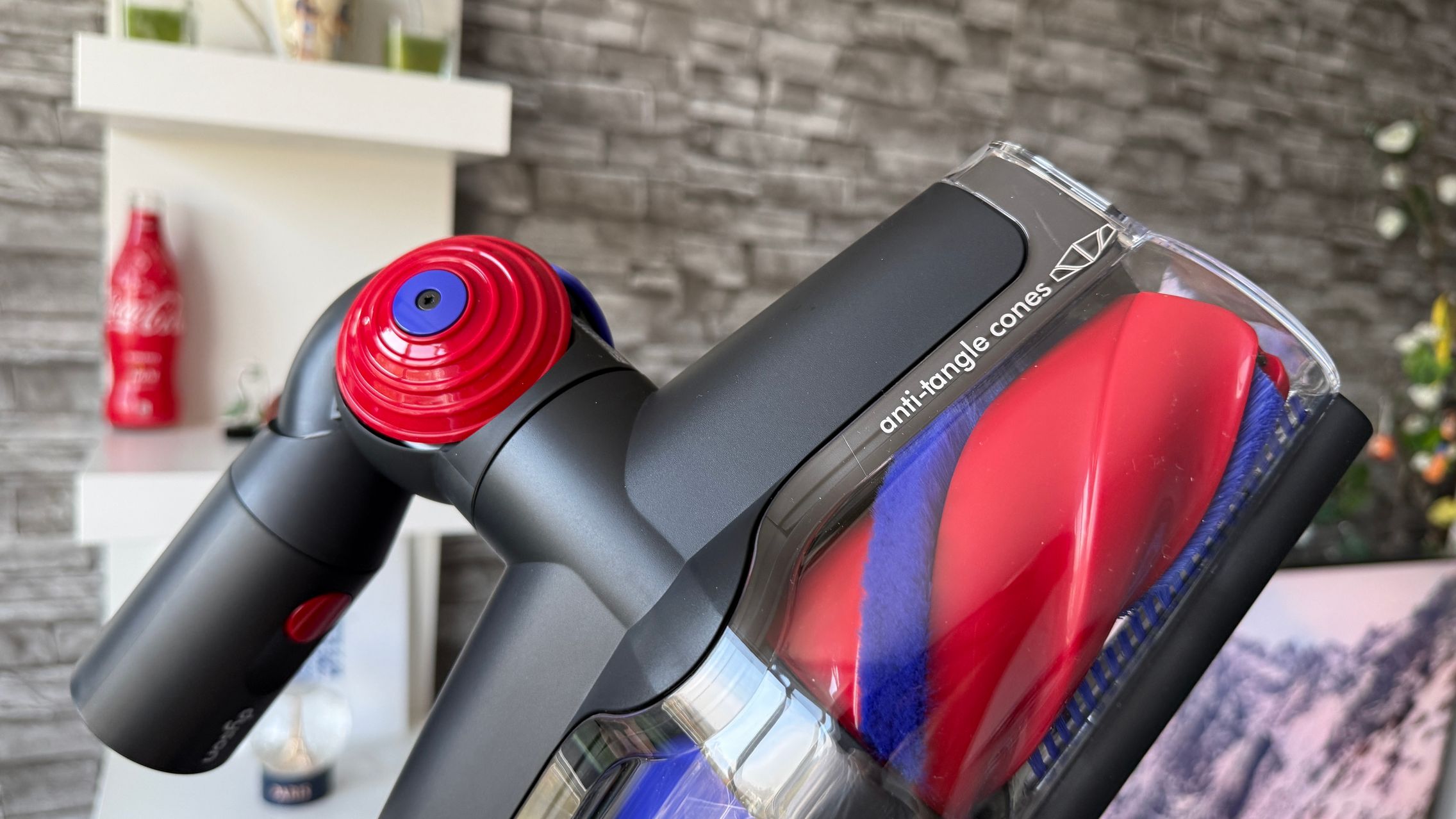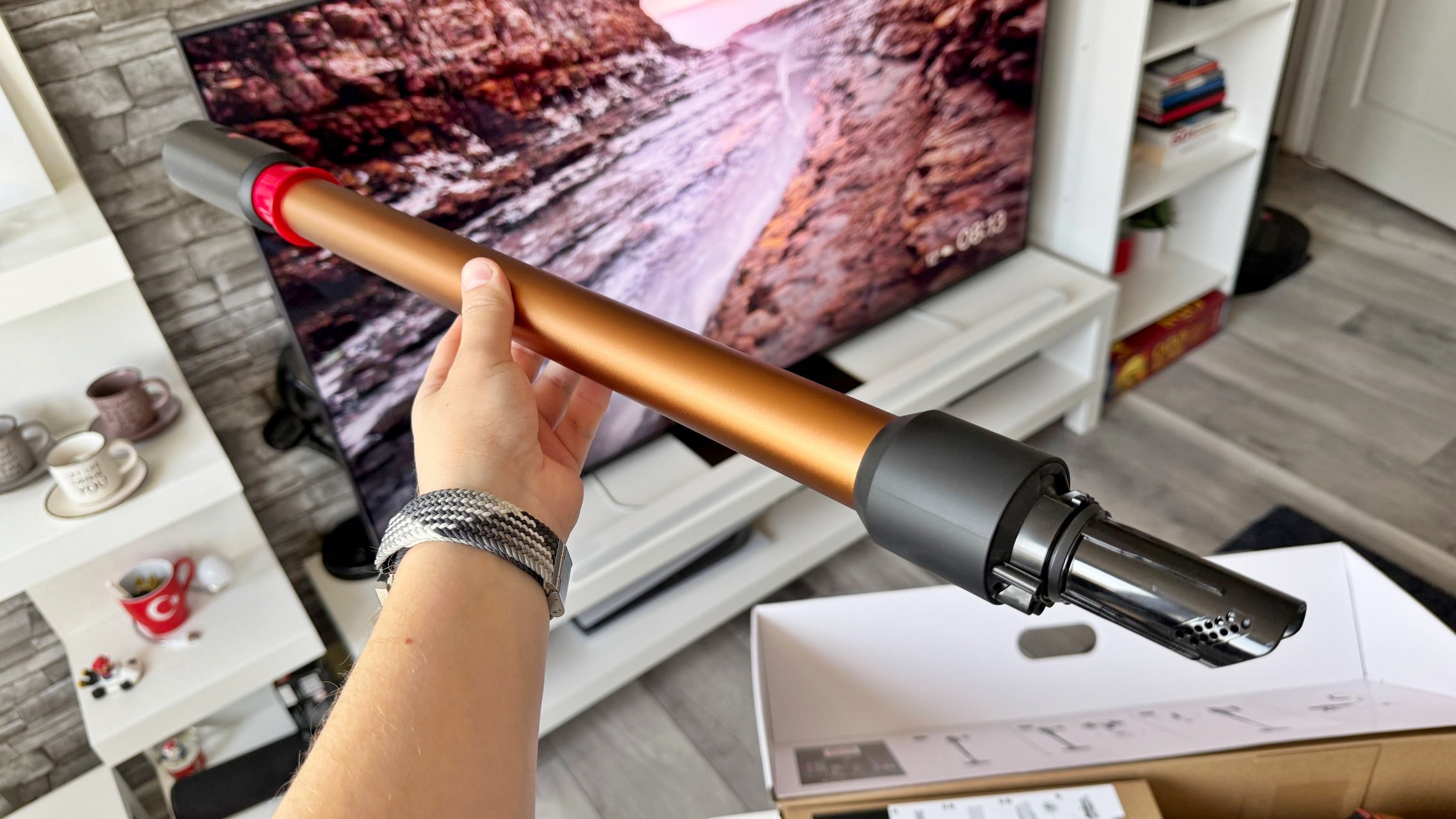 Legat de accesorii, în cutie am dat de soluții de curățare potrivite pentru orice suprafață, de la podele şi covoare până la locuri greu accesibile. Totul este extrem de bine organizat la interior și mi-e teamă că nu voi mai reuși să pun totul cap la cap odată ce trebuie returnat aspiratorul către Dyson. Așa, trecând peste, am găsit aici unitatea central, aspiratorul, greoi la prima impresie și așa spune și lista de dotări, având 3.5 kg. Ca design, arată diferit faţă de rivalii săi, cu o combinaţie de nuanţe vii, ca roşu şi albastru, plus acel tub de culoarea bronzului. Zici ca e din Cyberpunk! Fiind vertical nu trebuie să te mai apleci şi nici să tragi de vreun aspirator cu rotiţe sau corp masiv.