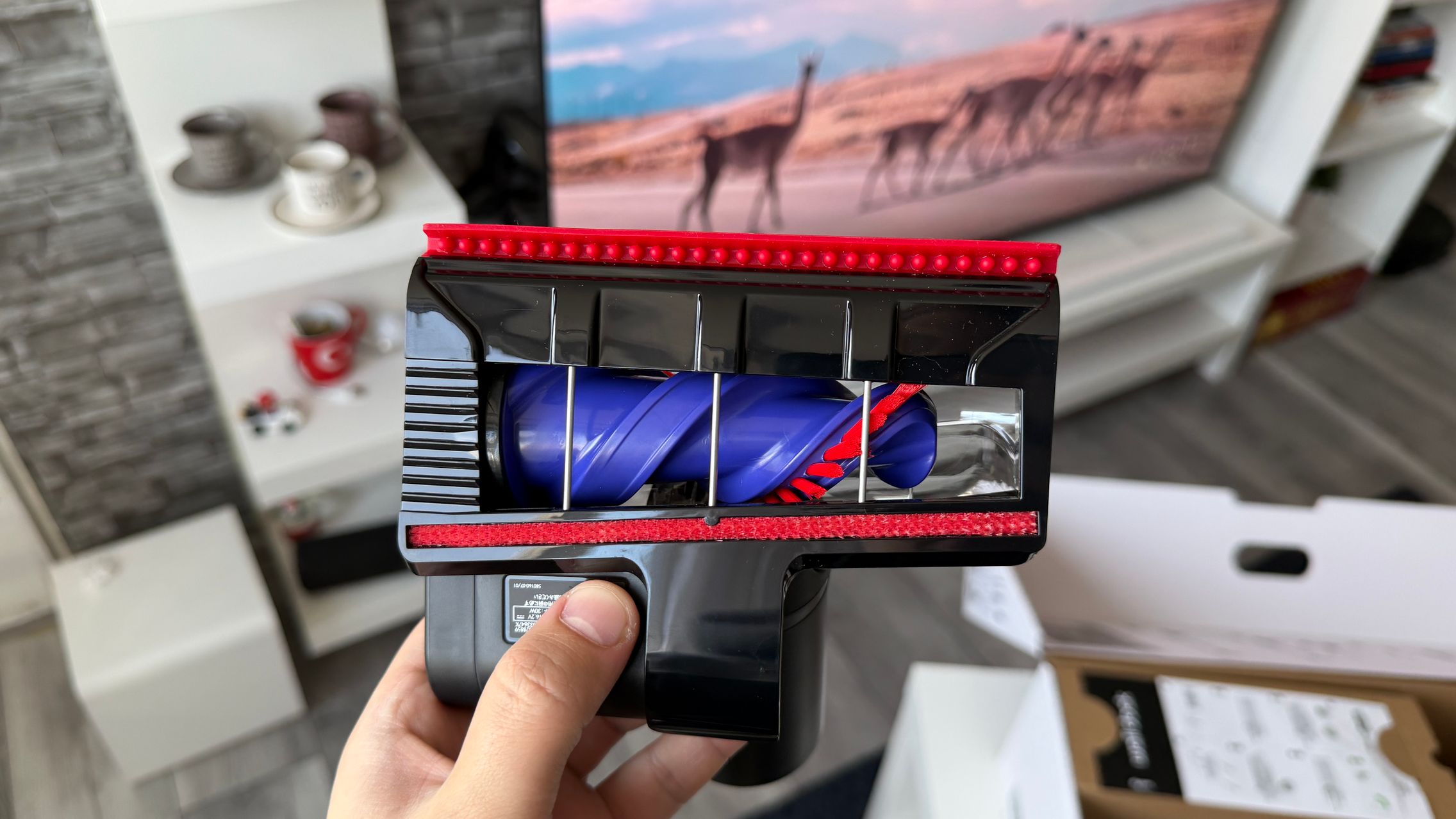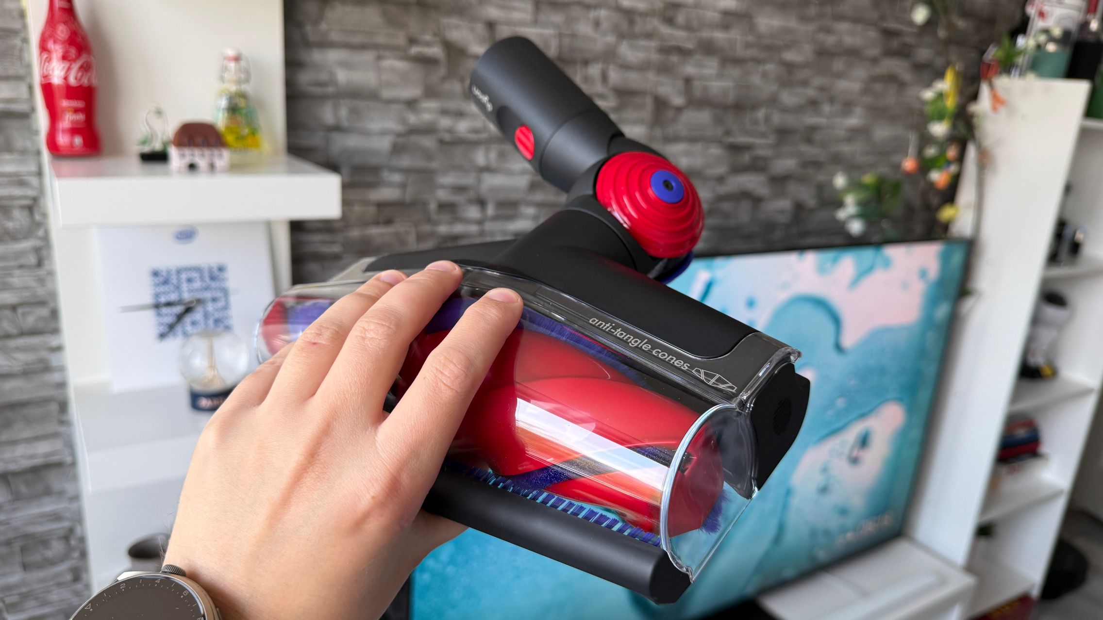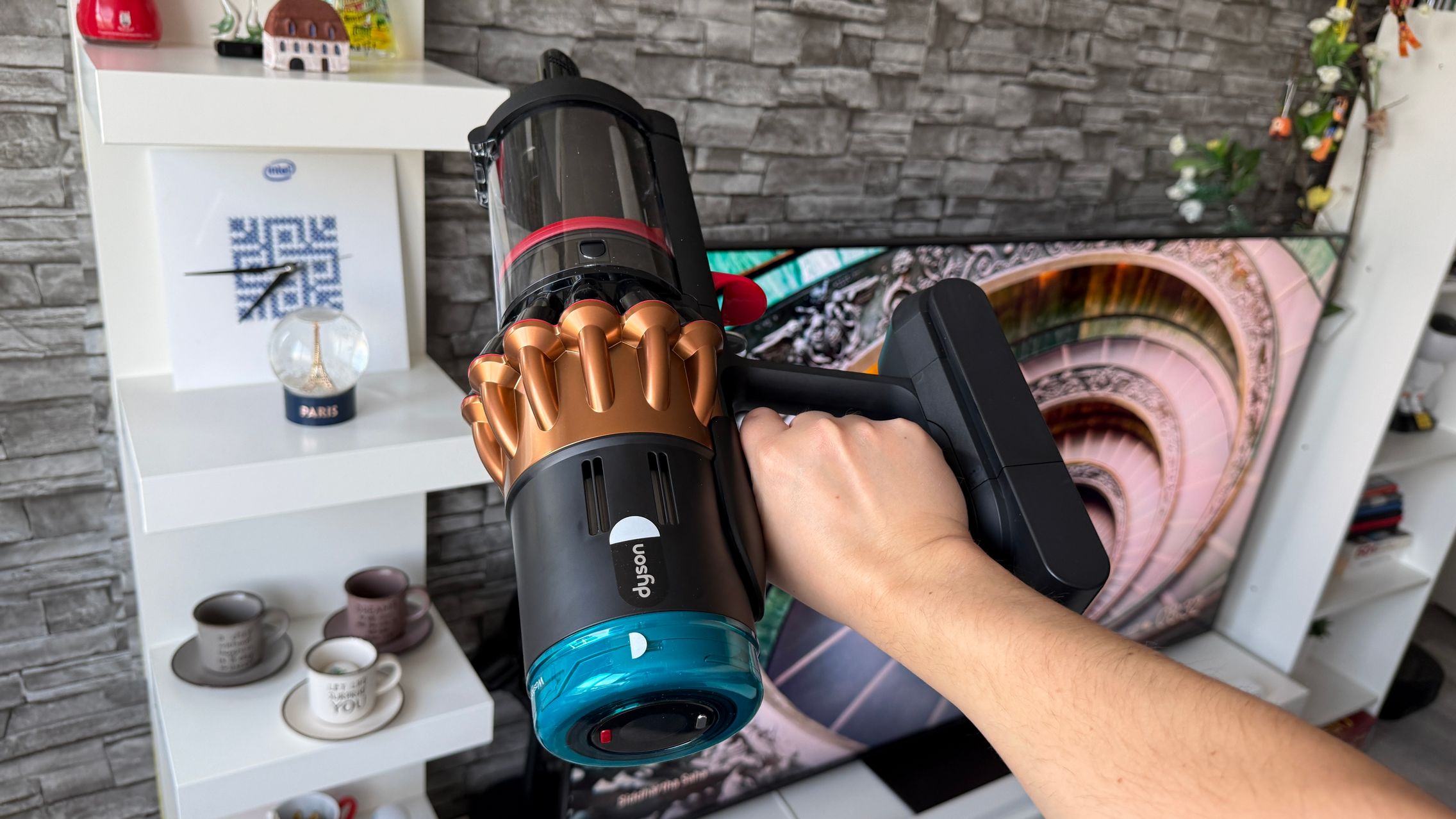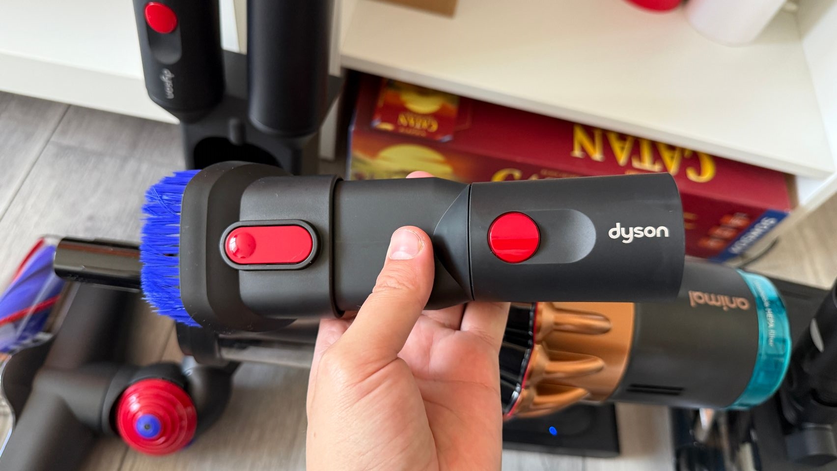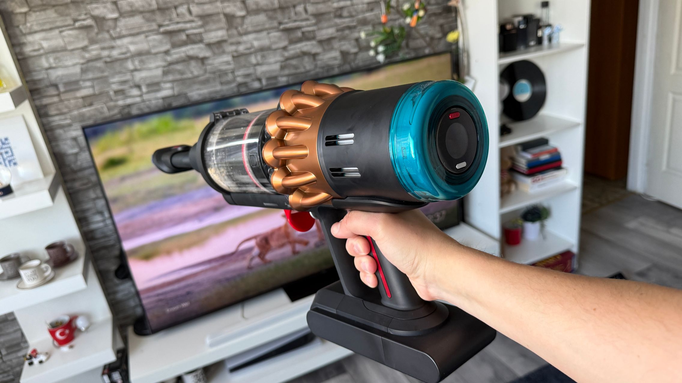 Legat de accesorii, în cutie am dat de soluții de curățare potrivite pentru orice suprafață, de la podele şi covoare până la locuri greu accesibile. Totul este extrem de bine organizat la interior și mi-e teamă că nu voi mai reuși să pun totul cap la cap odată ce trebuie returnat aspiratorul către Dyson. Așa, trecând peste, am găsit aici unitatea central, aspiratorul, greoi la prima impresie și așa spune și lista de dotări, având 3.5 kg. Ca design, arată diferit faţă de rivalii săi, cu o combinaţie de nuanţe vii, ca roşu şi albastru, plus acel tub de culoarea bronzului. Zici ca e din Cyberpunk! Fiind vertical nu trebuie să te mai apleci şi nici să tragi de vreun aspirator cu rotiţe sau corp masiv.
