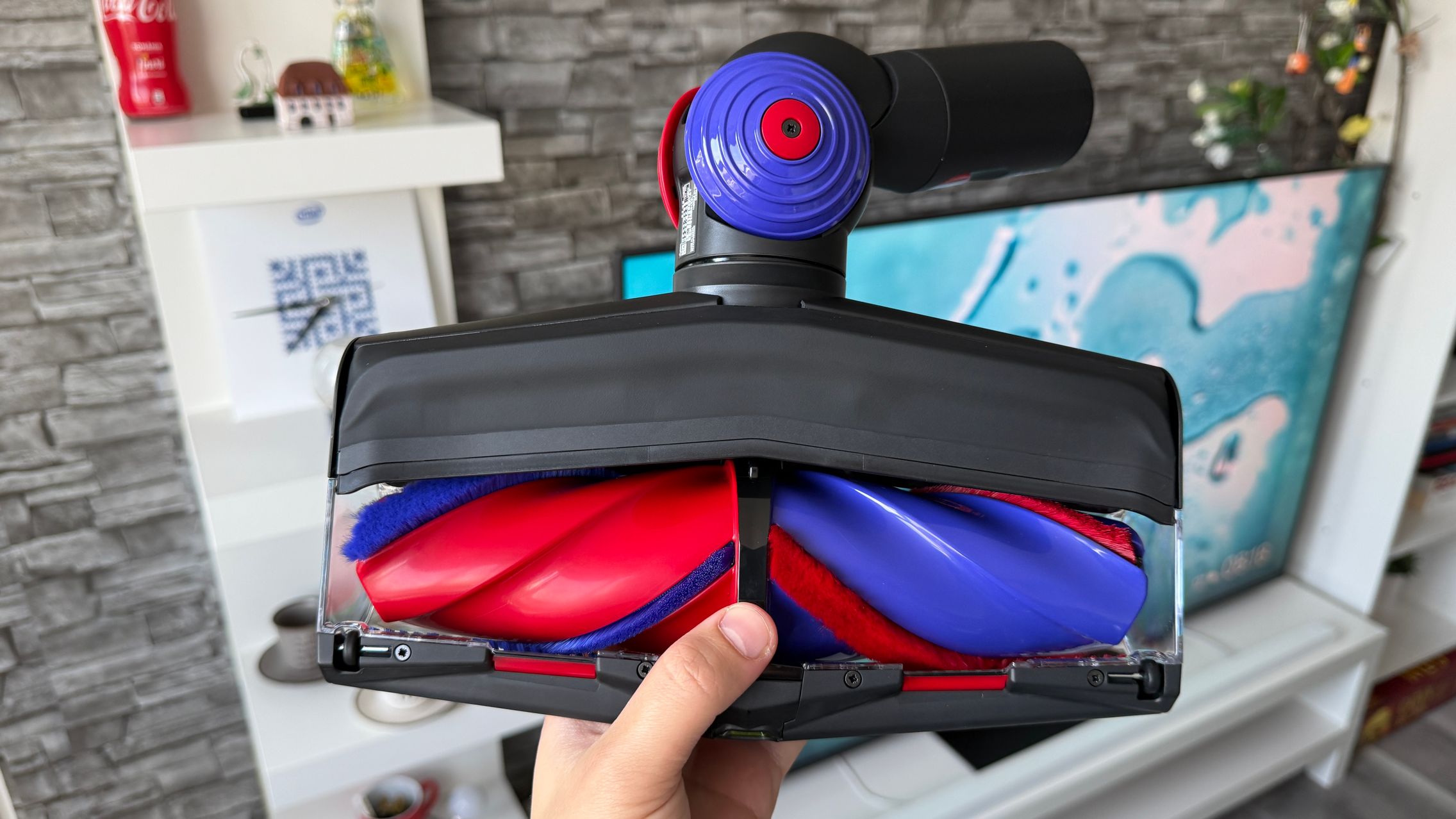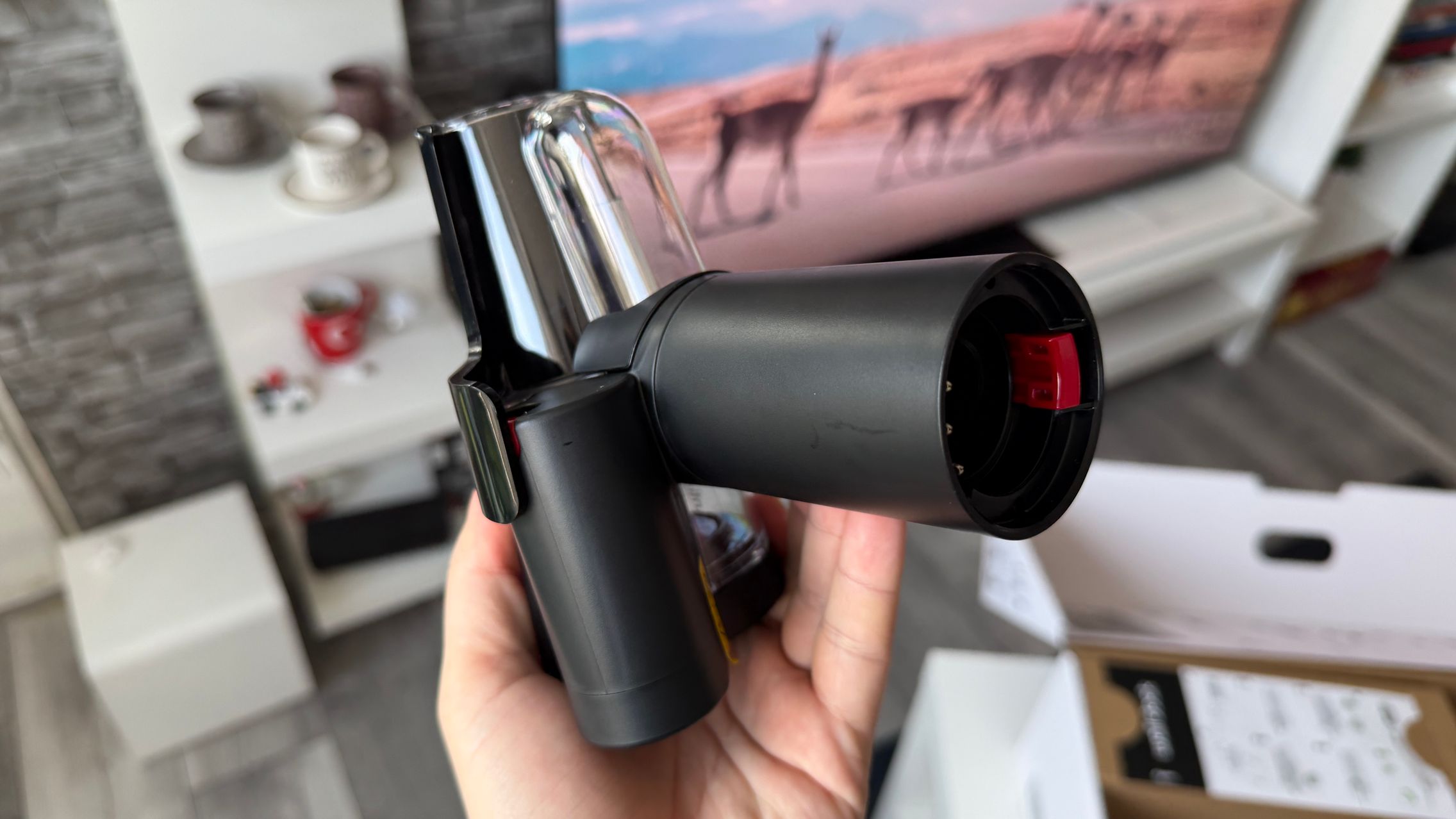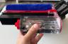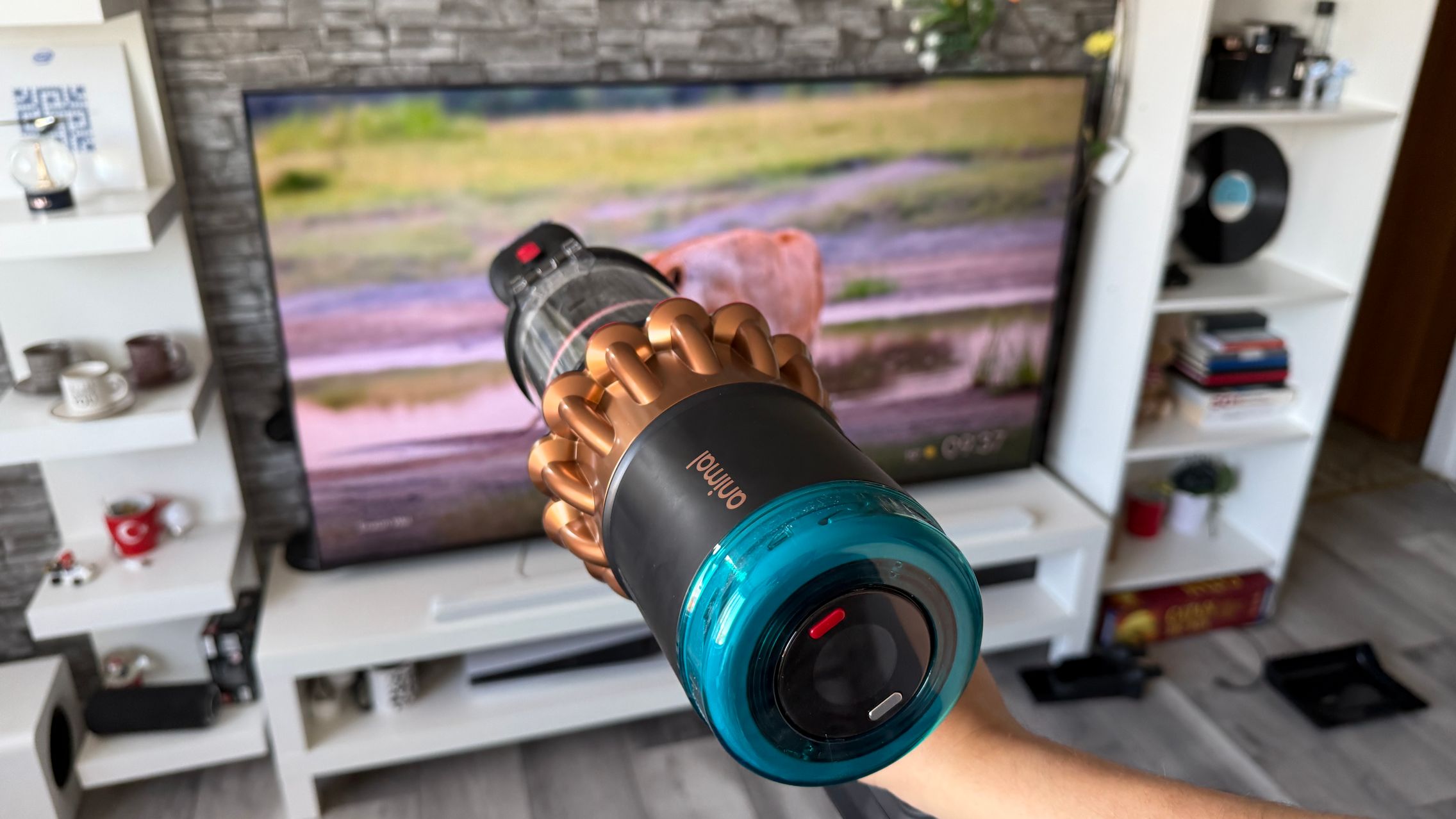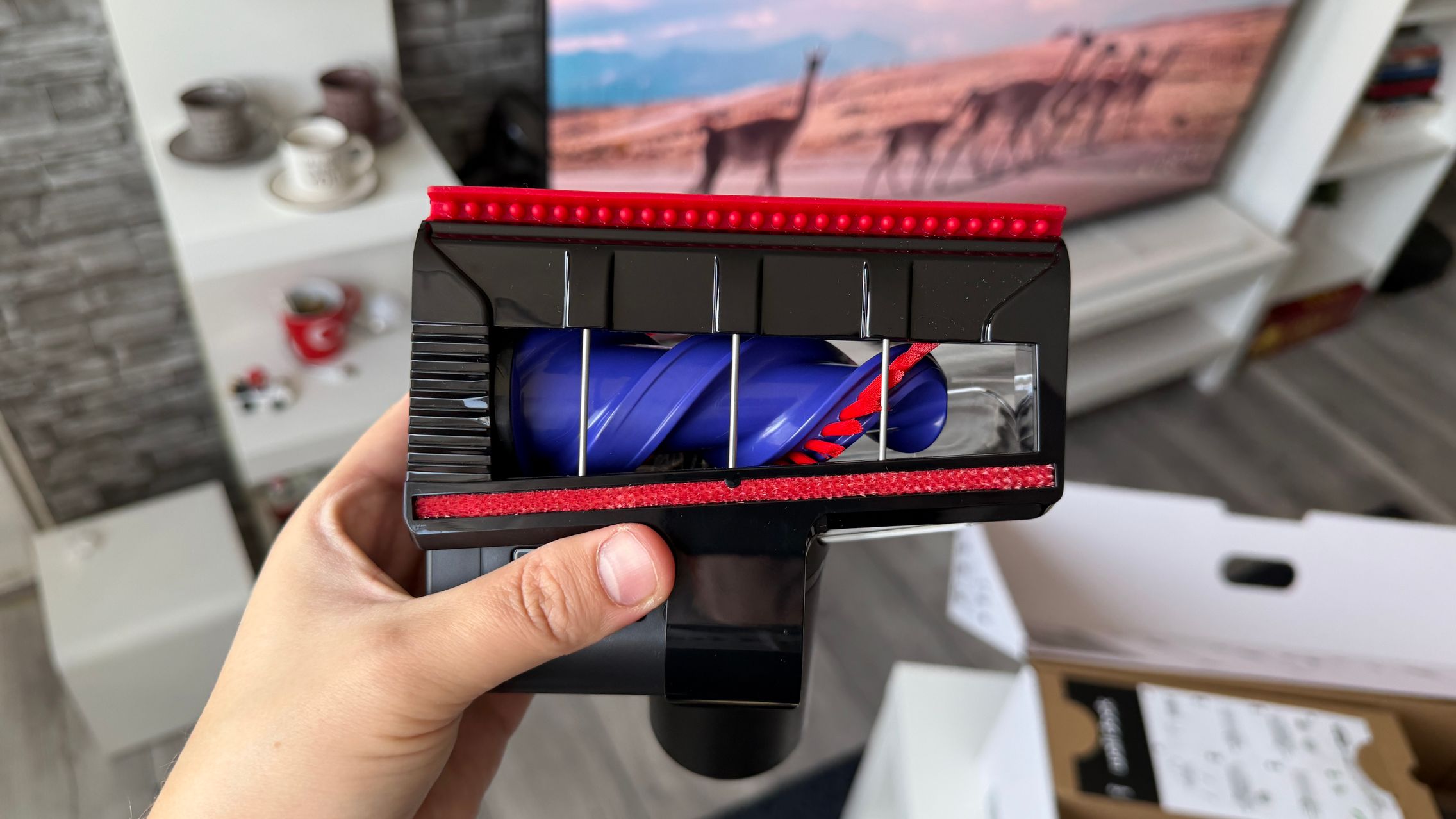 Legat de accesorii, în cutie am dat de soluții de curățare potrivite pentru orice suprafață, de la podele şi covoare până la locuri greu accesibile. Totul este extrem de bine organizat la interior și mi-e teamă că nu voi mai reuși să pun totul cap la cap odată ce trebuie returnat aspiratorul către Dyson. Așa, trecând peste, am găsit aici unitatea central, aspiratorul, greoi la prima impresie și așa spune și lista de dotări, având 3.5 kg. Ca design, arată diferit faţă de rivalii săi, cu o combinaţie de nuanţe vii, ca roşu şi albastru, plus acel tub de culoarea bronzului. Zici ca e din Cyberpunk! Fiind vertical nu trebuie să te mai apleci şi nici să tragi de vreun aspirator cu rotiţe sau corp masiv.