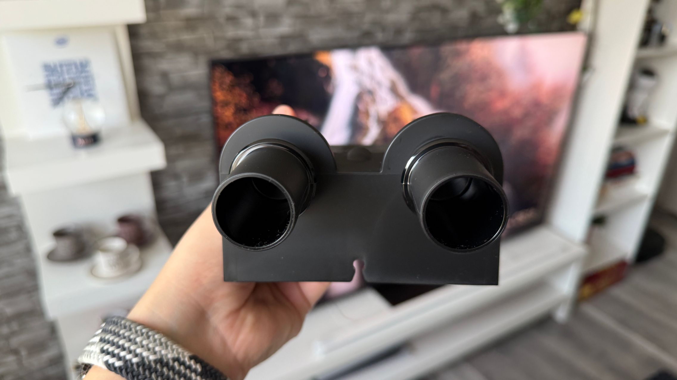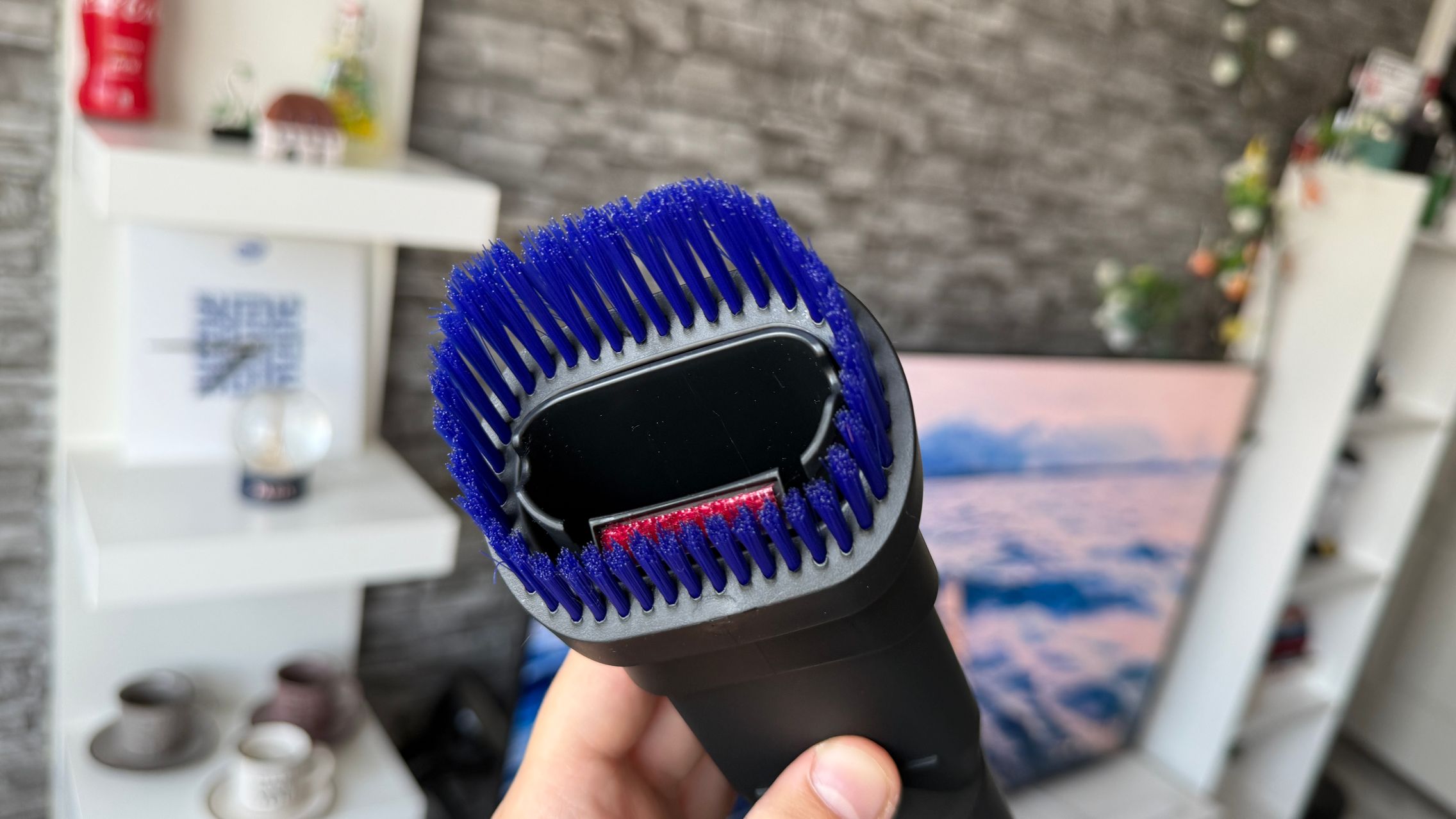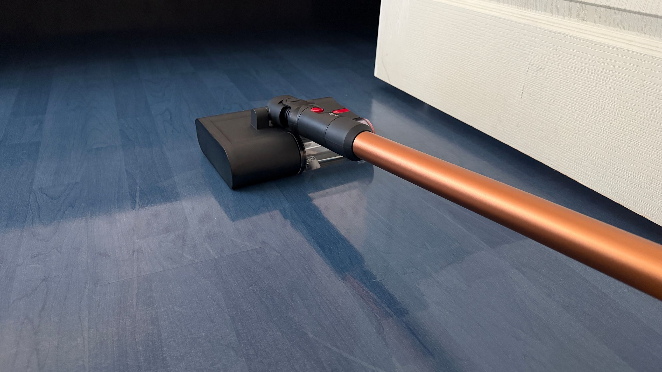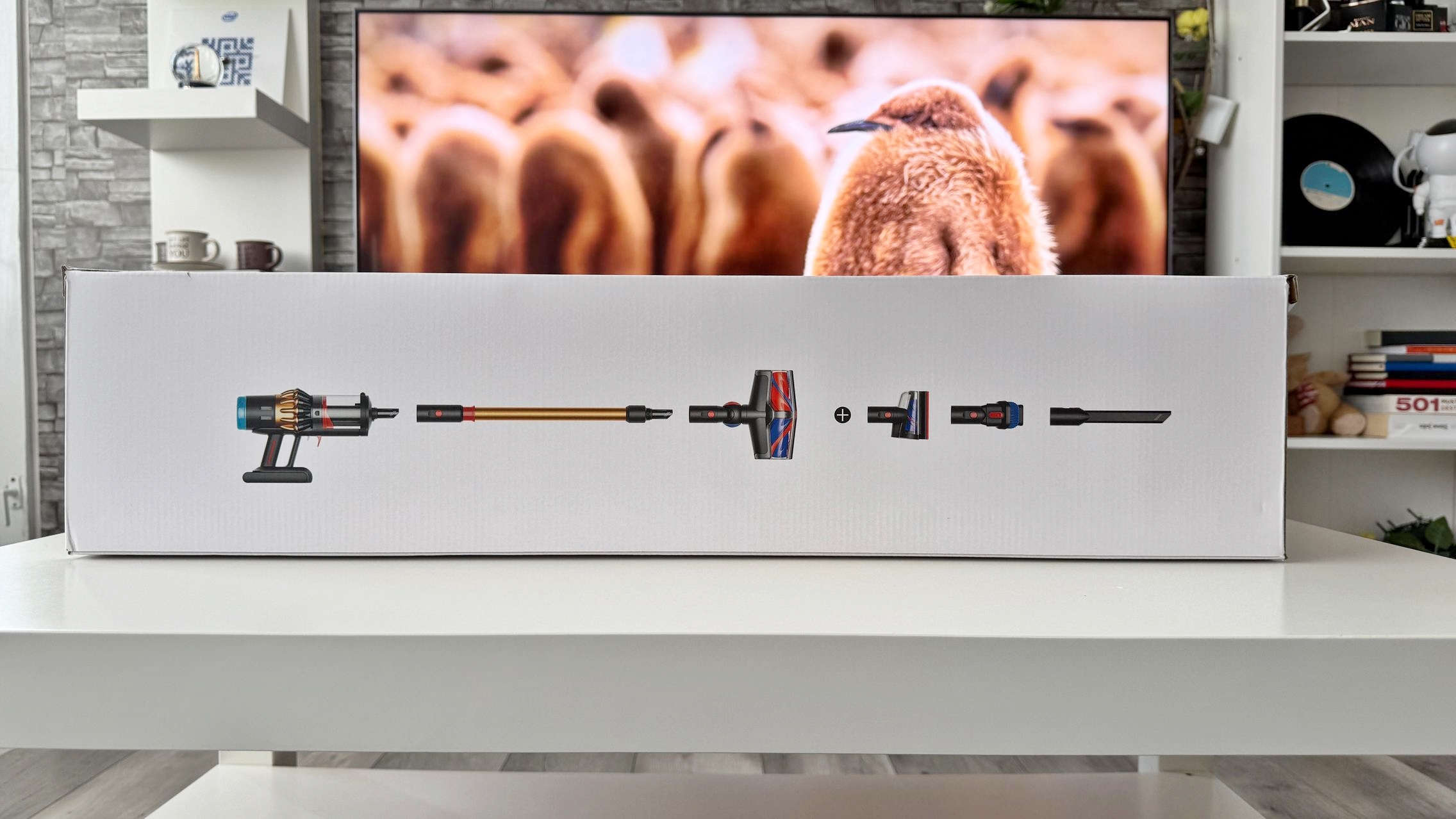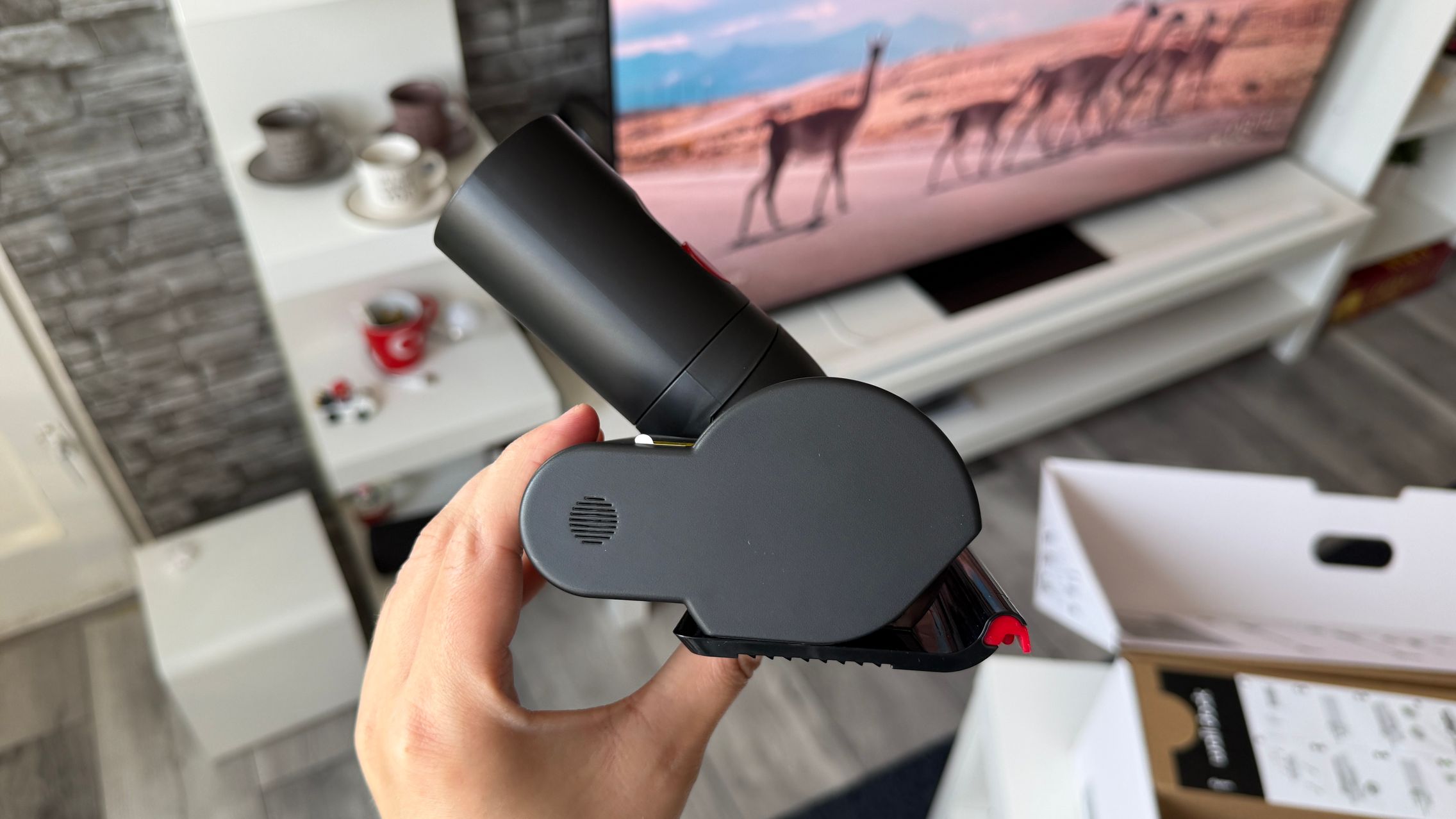 Legat de accesorii, în cutie am dat de soluții de curățare potrivite pentru orice suprafață, de la podele şi covoare până la locuri greu accesibile. Totul este extrem de bine organizat la interior și mi-e teamă că nu voi mai reuși să pun totul cap la cap odată ce trebuie returnat aspiratorul către Dyson. Așa, trecând peste, am găsit aici unitatea central, aspiratorul, greoi la prima impresie și așa spune și lista de dotări, având 3.5 kg. Ca design, arată diferit faţă de rivalii săi, cu o combinaţie de nuanţe vii, ca roşu şi albastru, plus acel tub de culoarea bronzului. Zici ca e din Cyberpunk! Fiind vertical nu trebuie să te mai apleci şi nici să tragi de vreun aspirator cu rotiţe sau corp masiv.