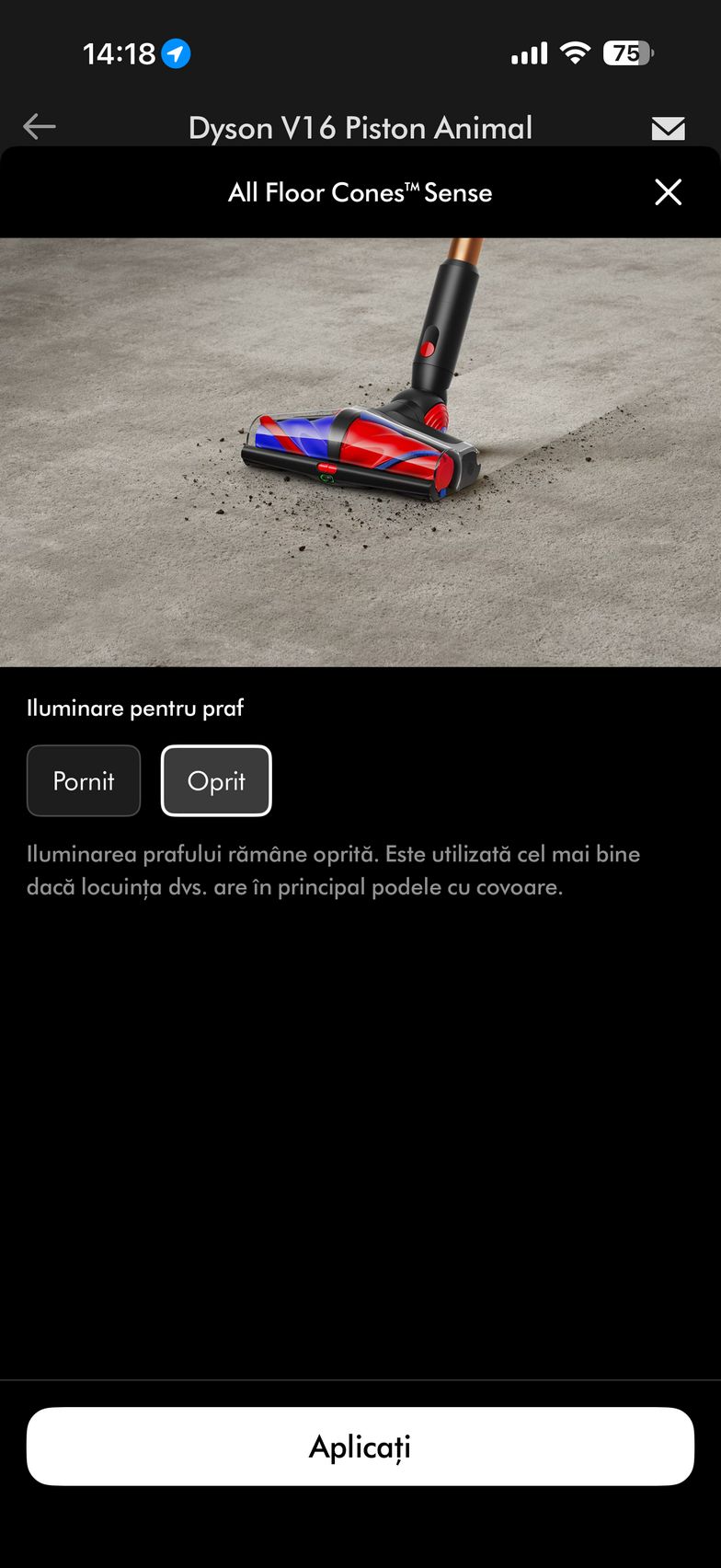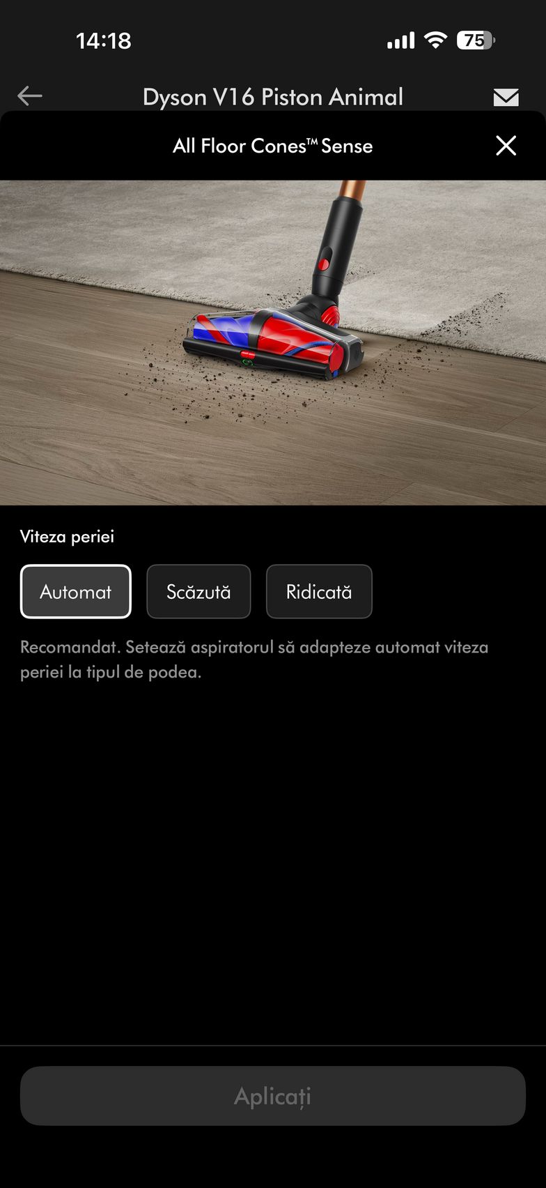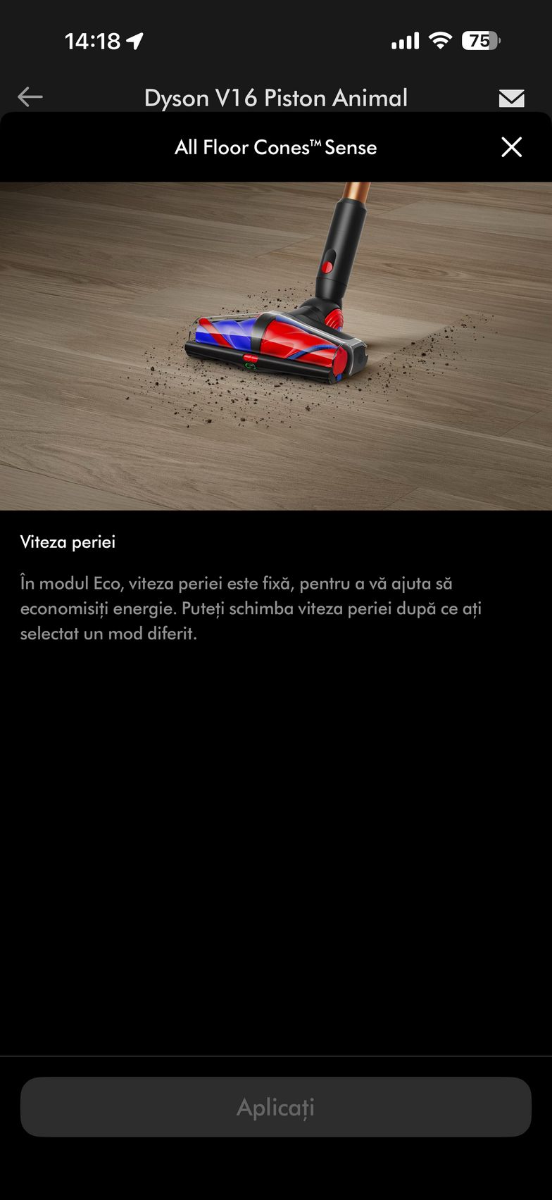 Şi dacă tot am ajuns la zona smart, exista şi aplicaţia MyDyson pentru Android şi iOS, cu care poţi controla nivelul de umezire al rolelor, direct de pe telefon. Vei adapta umezeala, hidratarea lor în funcţie de pete şi murdărie.