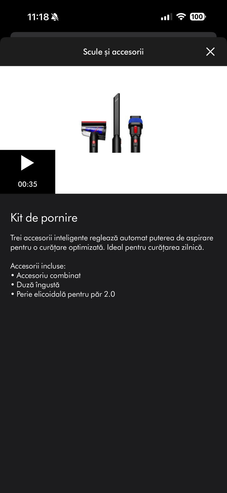 - Accesorii: stație andocare și încărcare, încărcător, accesoriu pentru spații înguste