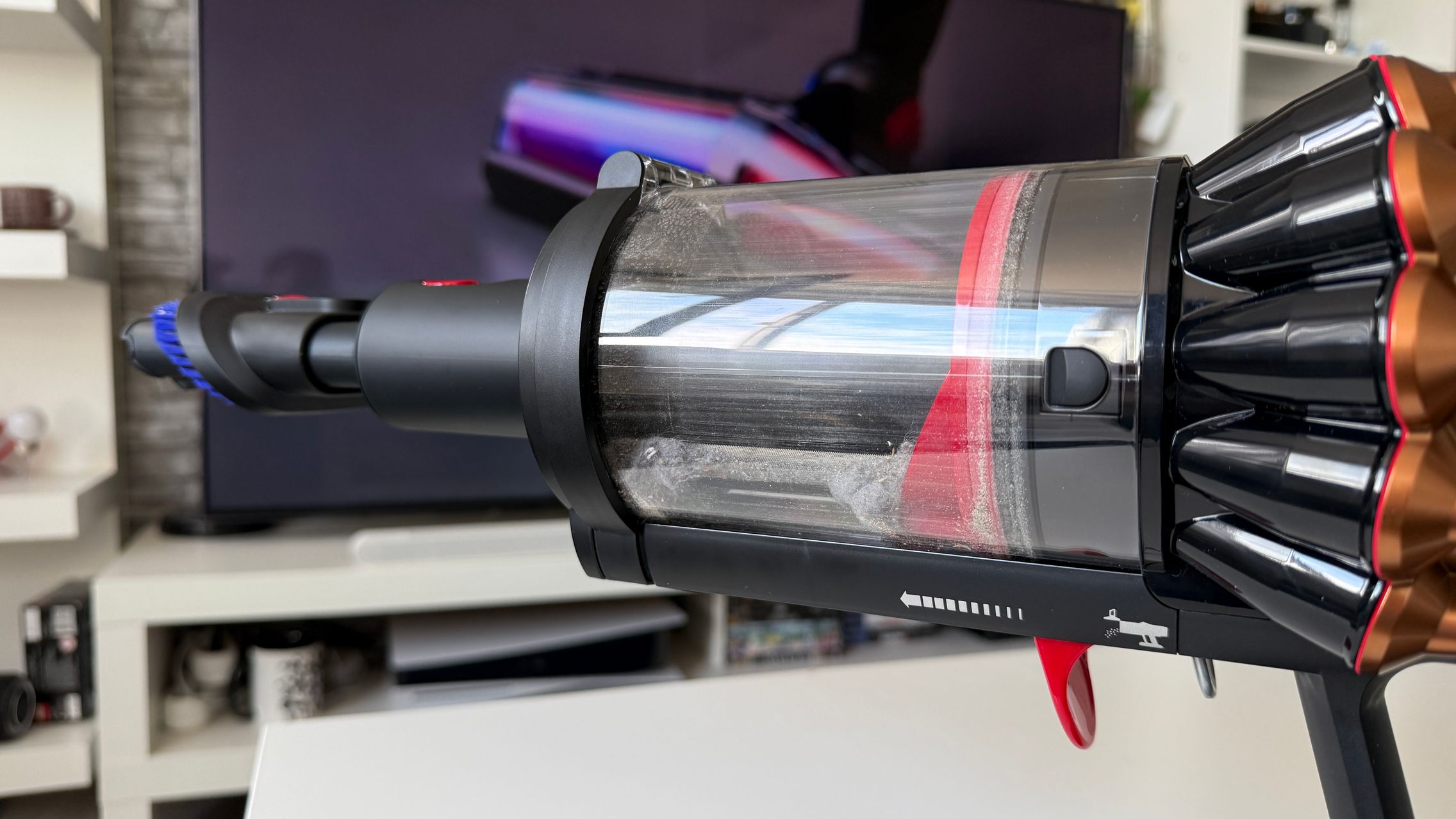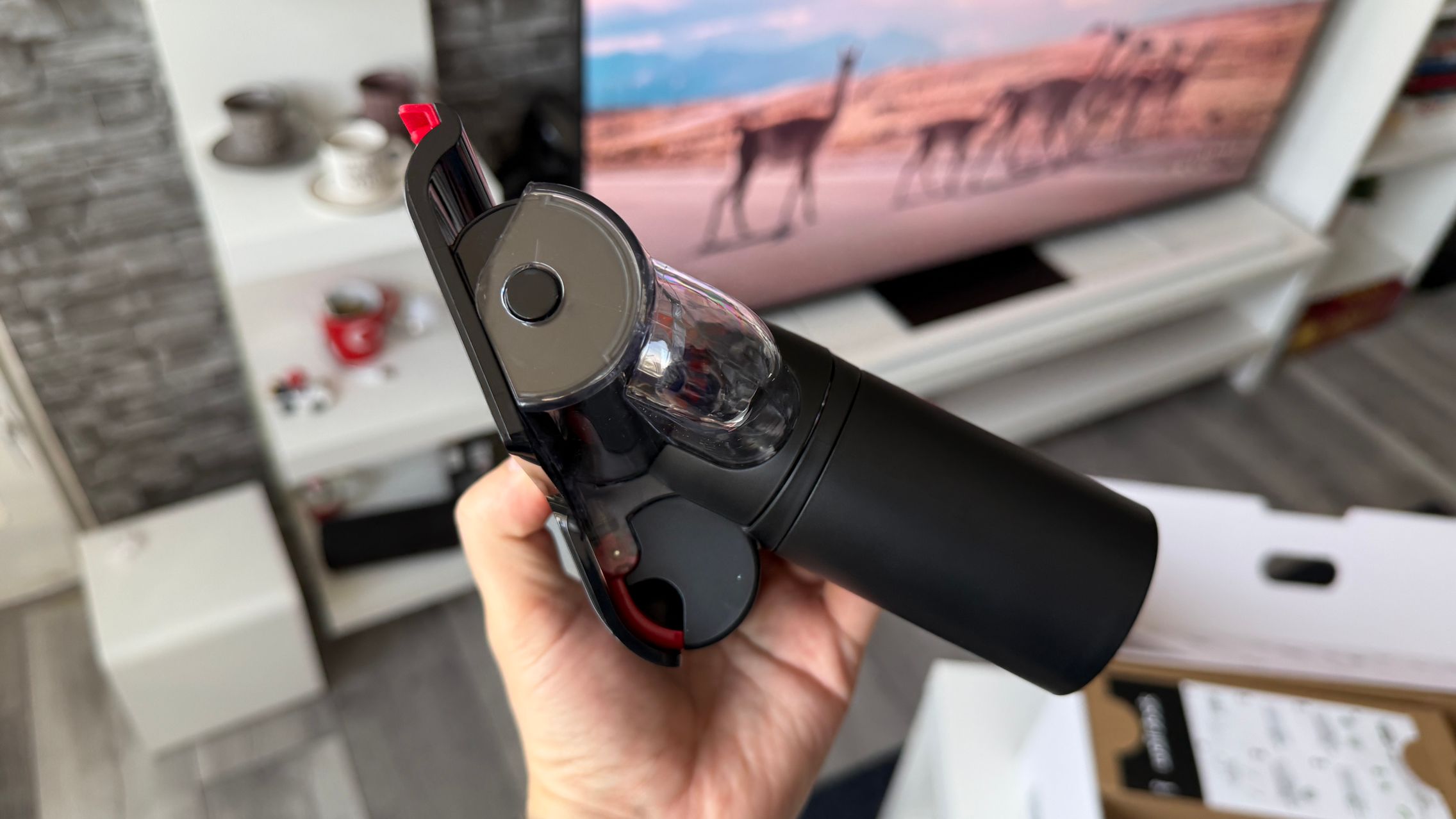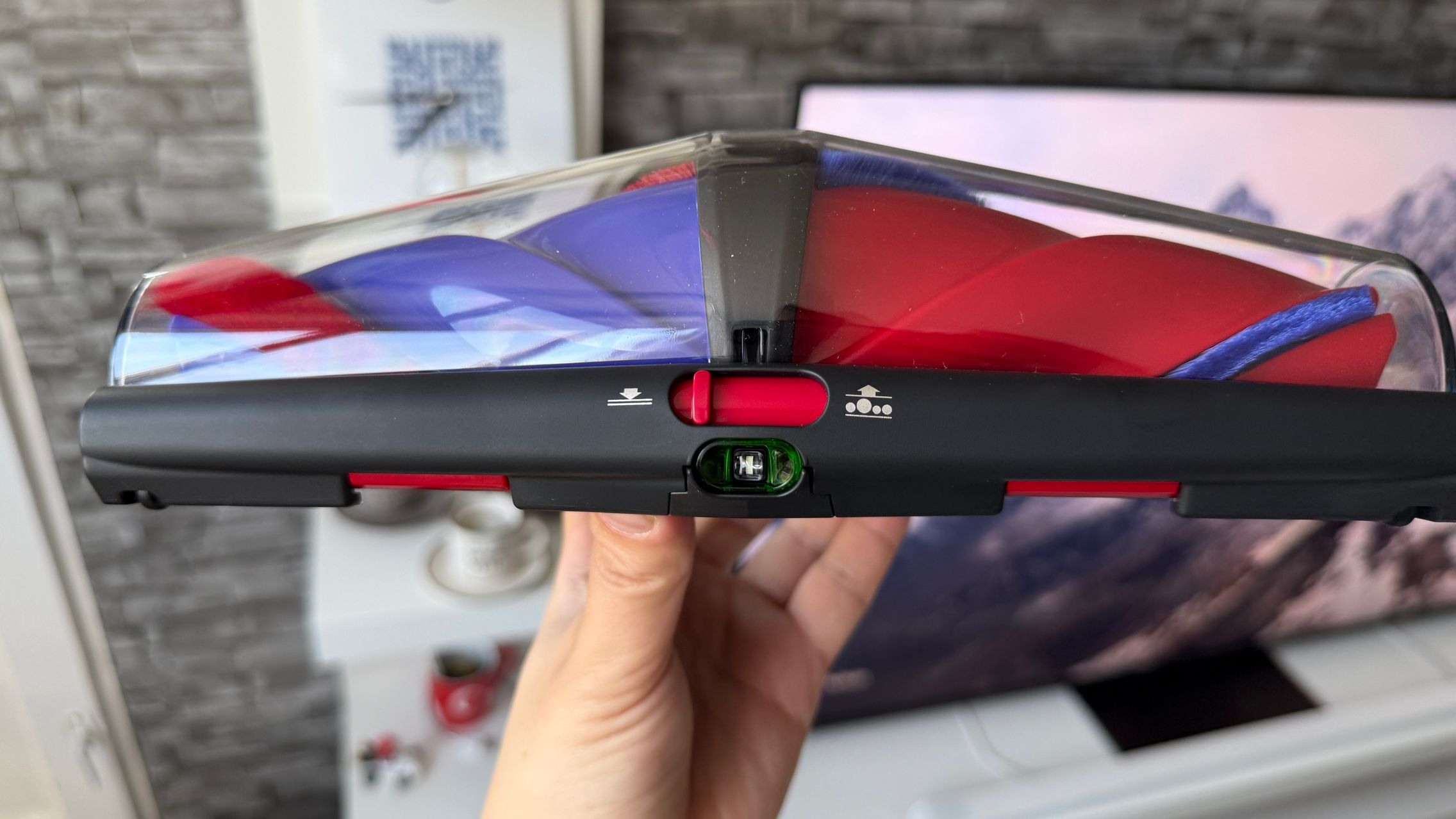 Legat de aspirator este și rezervorul de praf de 1.3 - 1.35 litri și am văzut aici și două trăgaciuri ca de armă, de la care de obicei la alte modele verticale se pornește aspirarea, doar că aici unul este pentru a presa praful (cel roșu), iar celălalt este pentru a elibera capacul și goli praful. În zona sa superioară stă un micuț ecran pe care vezi puterea de aspirare (Eco, Auto, Boost) sau gradul de umezire a mopului, cât și câte particule de anumite dimensiuni detectează senzorii, ca să ştii cât de murdară e casa de fapt. Vezi și autonomia disponibilă în funcție de modul de rulare.