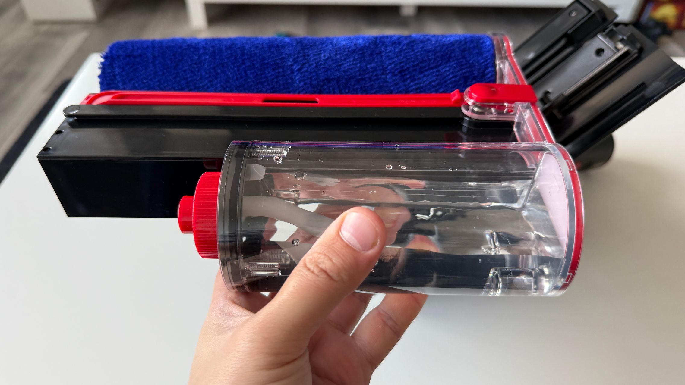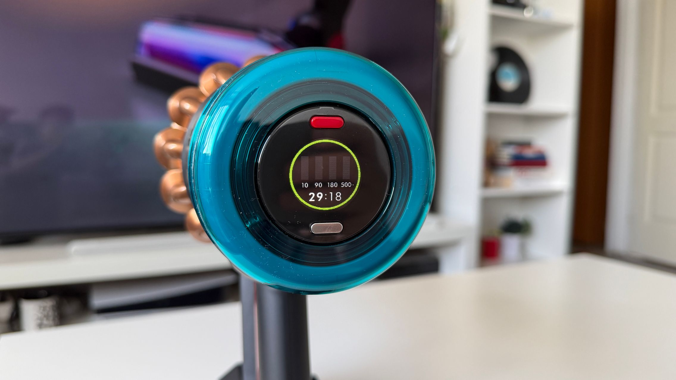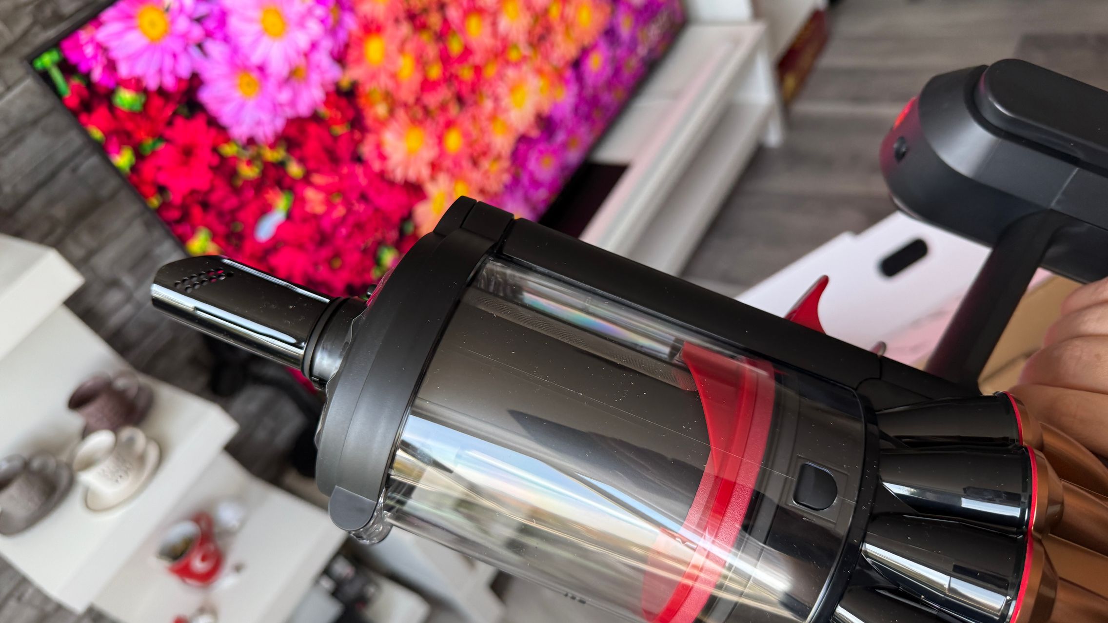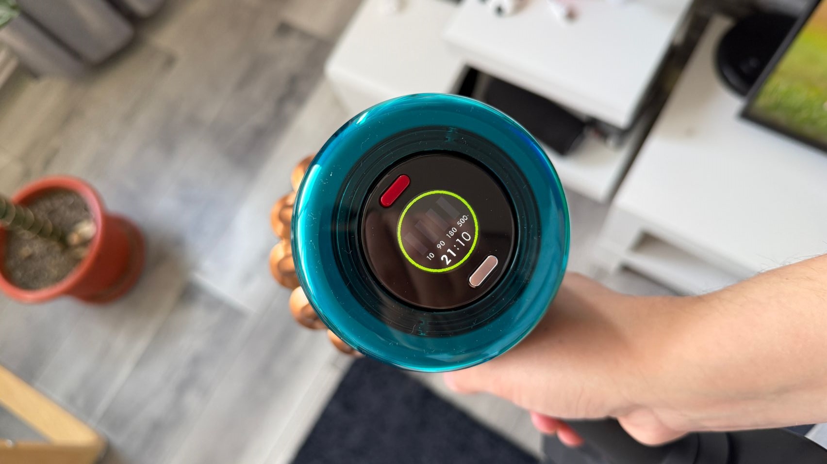 Legat de aspirator este și rezervorul de praf de 1.3 - 1.35 litri și am văzut aici și două trăgaciuri ca de armă, de la care de obicei la alte modele verticale se pornește aspirarea, doar că aici unul este pentru a presa praful (cel roșu), iar celălalt este pentru a elibera capacul și goli praful. În zona sa superioară stă un micuț ecran pe care vezi puterea de aspirare (Eco, Auto, Boost) sau gradul de umezire a mopului, cât și câte particule de anumite dimensiuni detectează senzorii, ca să ştii cât de murdară e casa de fapt. Vezi și autonomia disponibilă în funcție de modul de rulare.