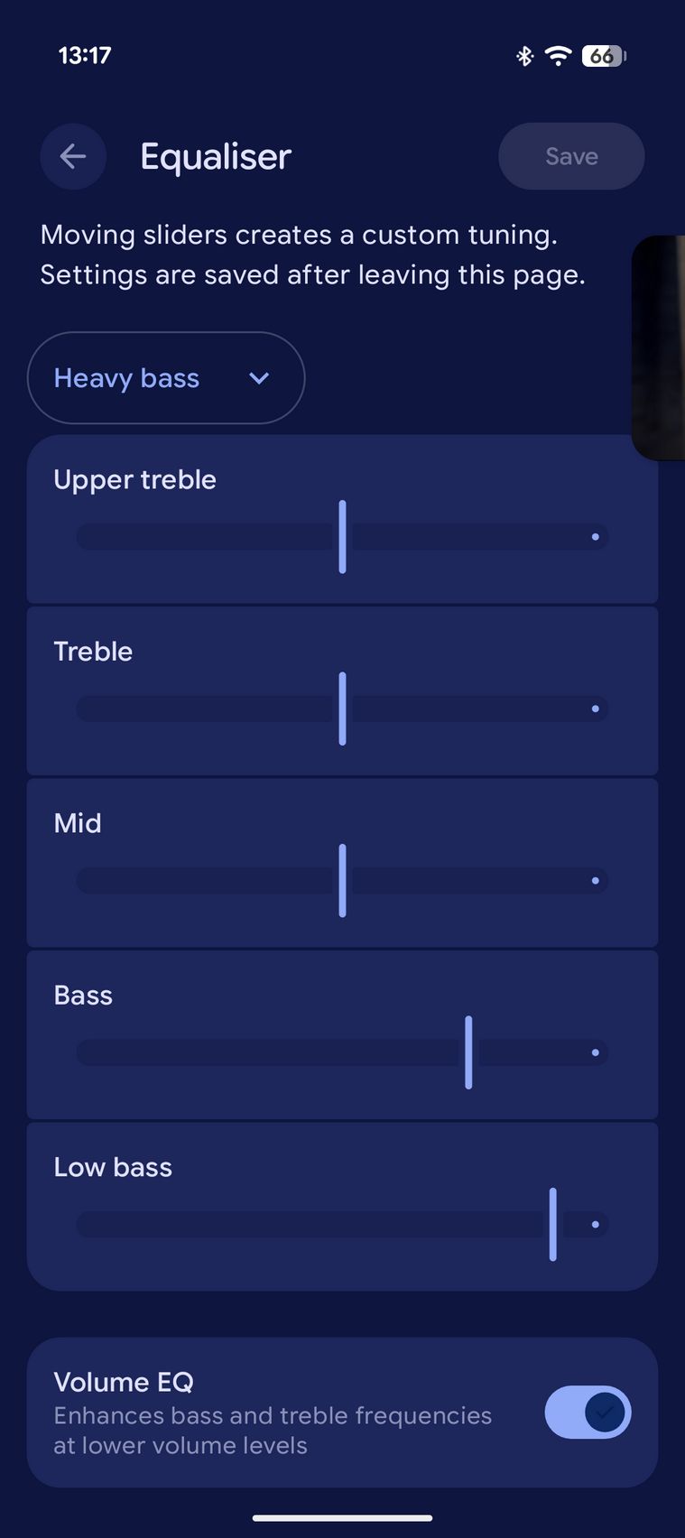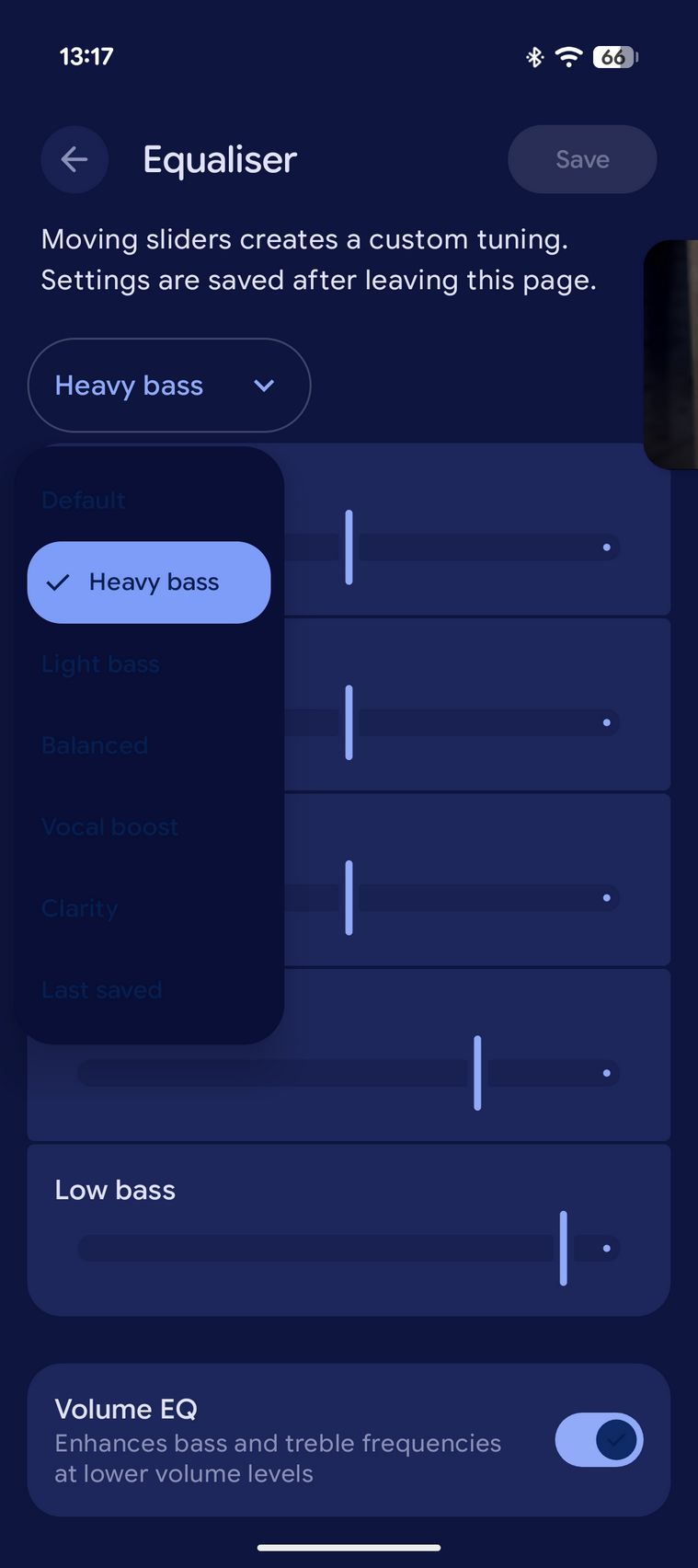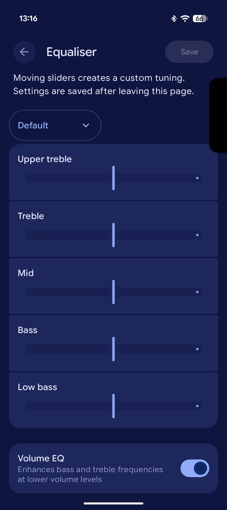 Și mai jos e zona Sound unde am bifat Spatial Audio și de unde am verificat și dacă am ales dopuri potrivite pentru ca ANC-ul să fie eficient. Urmează egalizatorul cu opțiuni Default, Heavy Bass, Light Bass, Balanced, Vocal Boost, Clarity, Last Saved. Se poate crea și unul custom.