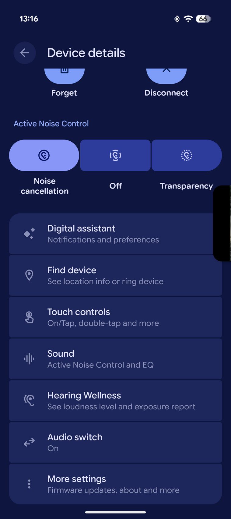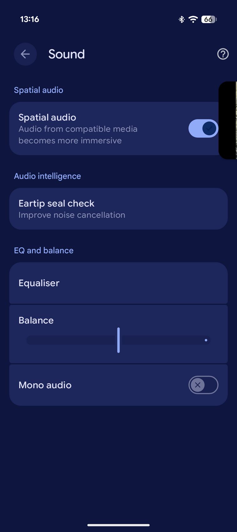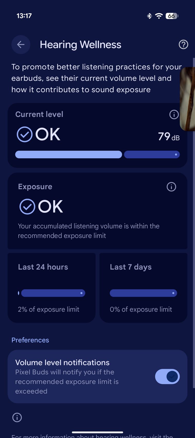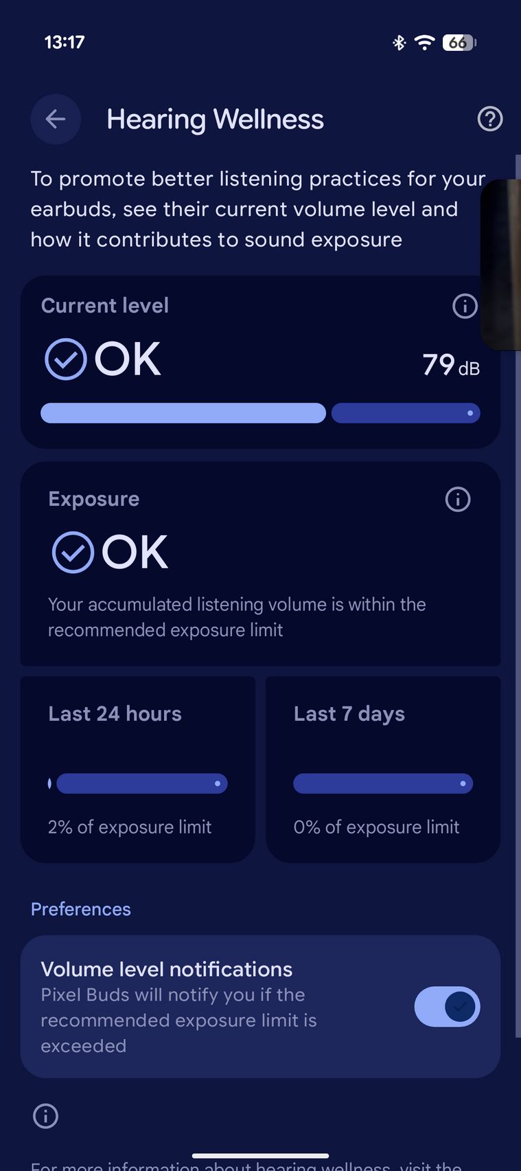 Foarte utilă zona de Wellness audio, ceva ce aș vrea să văd pe mai toate căștile. Este un layer de unde poți verifica expunerea la volum, plus nivelul curent de dB. Pixel Buds 2a vor da și notificări dacă se depășește limita de expunere zilnică, astfel că știi când e momentul să faci o pauză de la căști și muzică.