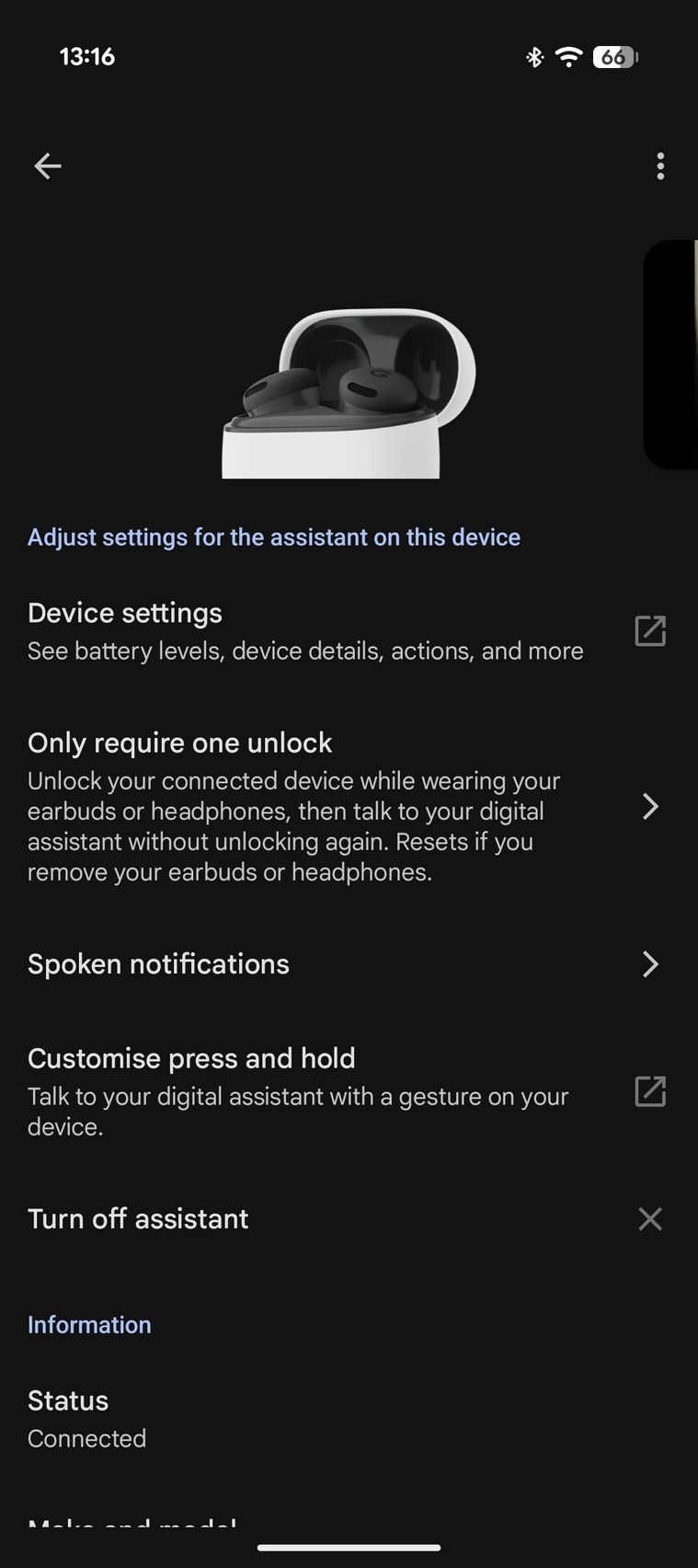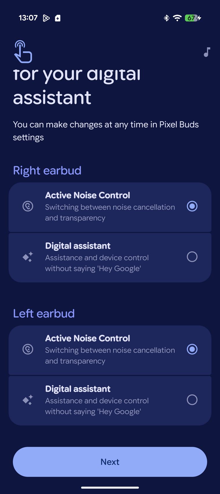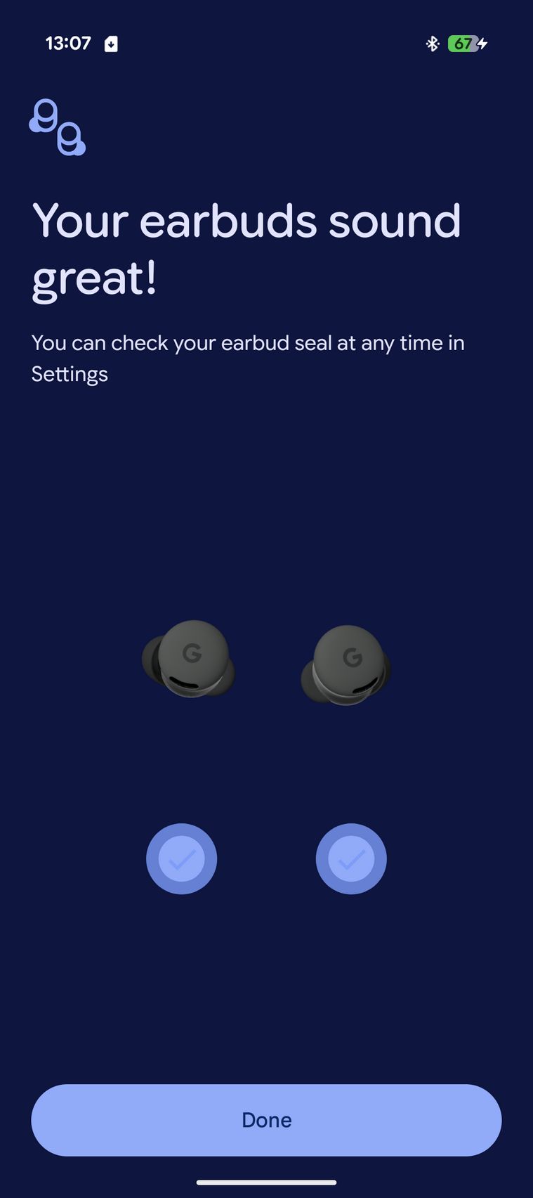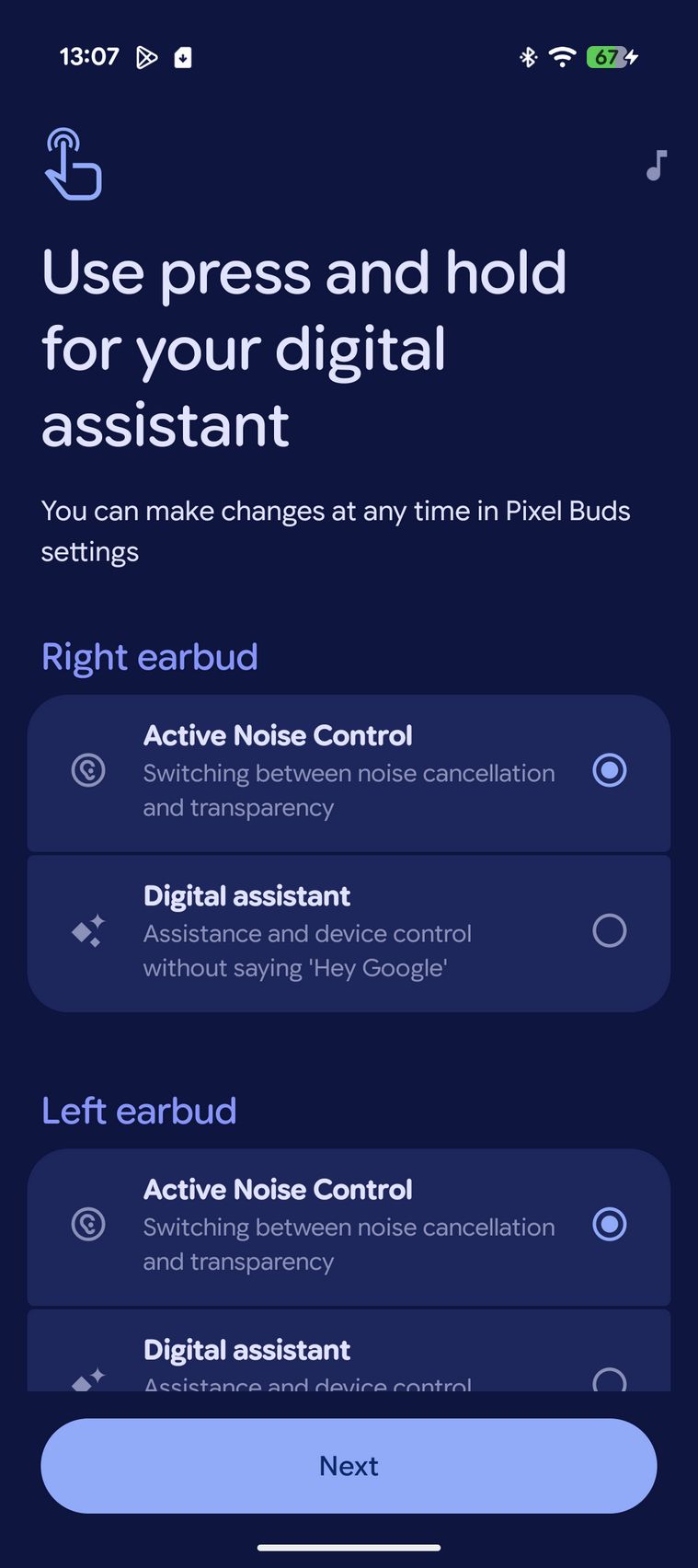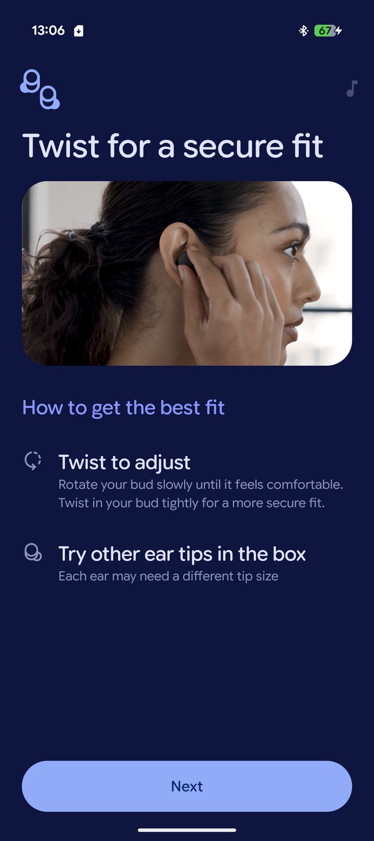 Aplicația de bază este Buds și eu am găsit-o pe smartphone-ul Pixel 10. Setup-ul s-a realizat imediat ce telefonul a detectat căștile și mi-a plăcut că am avut un ghid vizual pentru cum trebuie purtate corect căștile, cu un gest de rotire după ce sunt fixate în ureche. În interfața aplicației am găsit informații despre bateria căștilor (stânga, dreapta) și a tocului.
