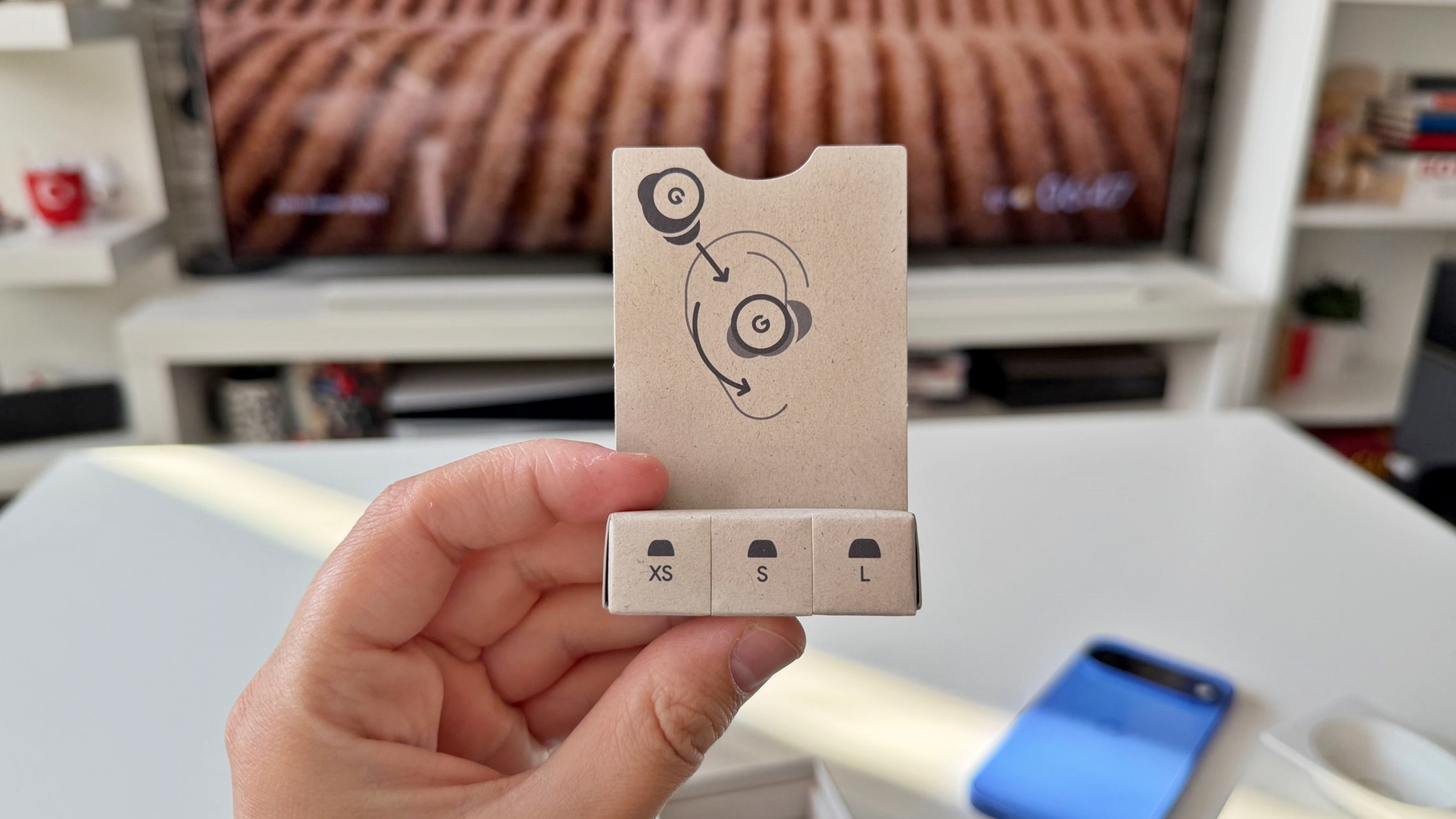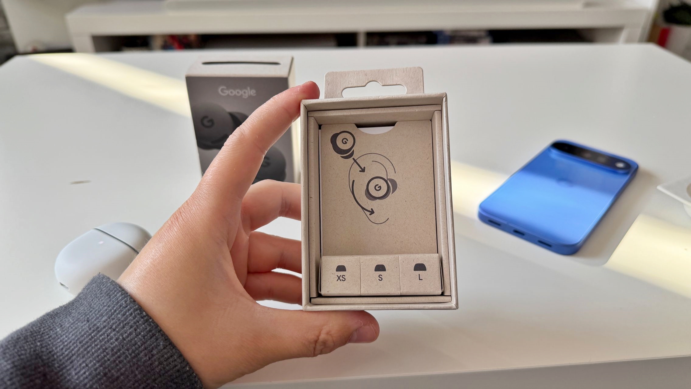 Cutia în care au sosit căștile este minimalistă la fel ca toate pachetele retail asociate produselor Google Pixel. Are acea nuanță de carton reciclat și cutia se deschide ca un sertar. Am descoperit la interior tocul de încărcare/transport, alături de manualele de utilizare și extra 3 perechi de dopuri din silicon pe mărimile XS, S, L.