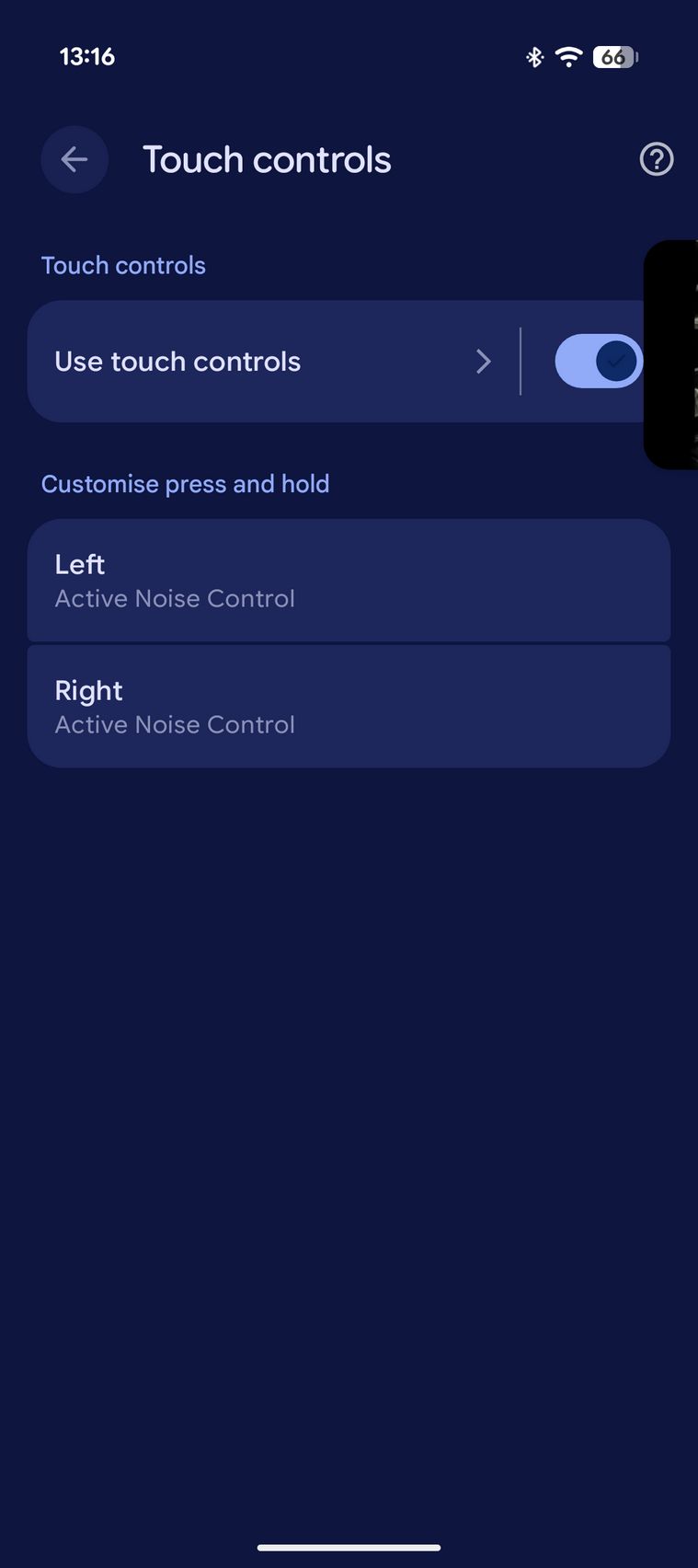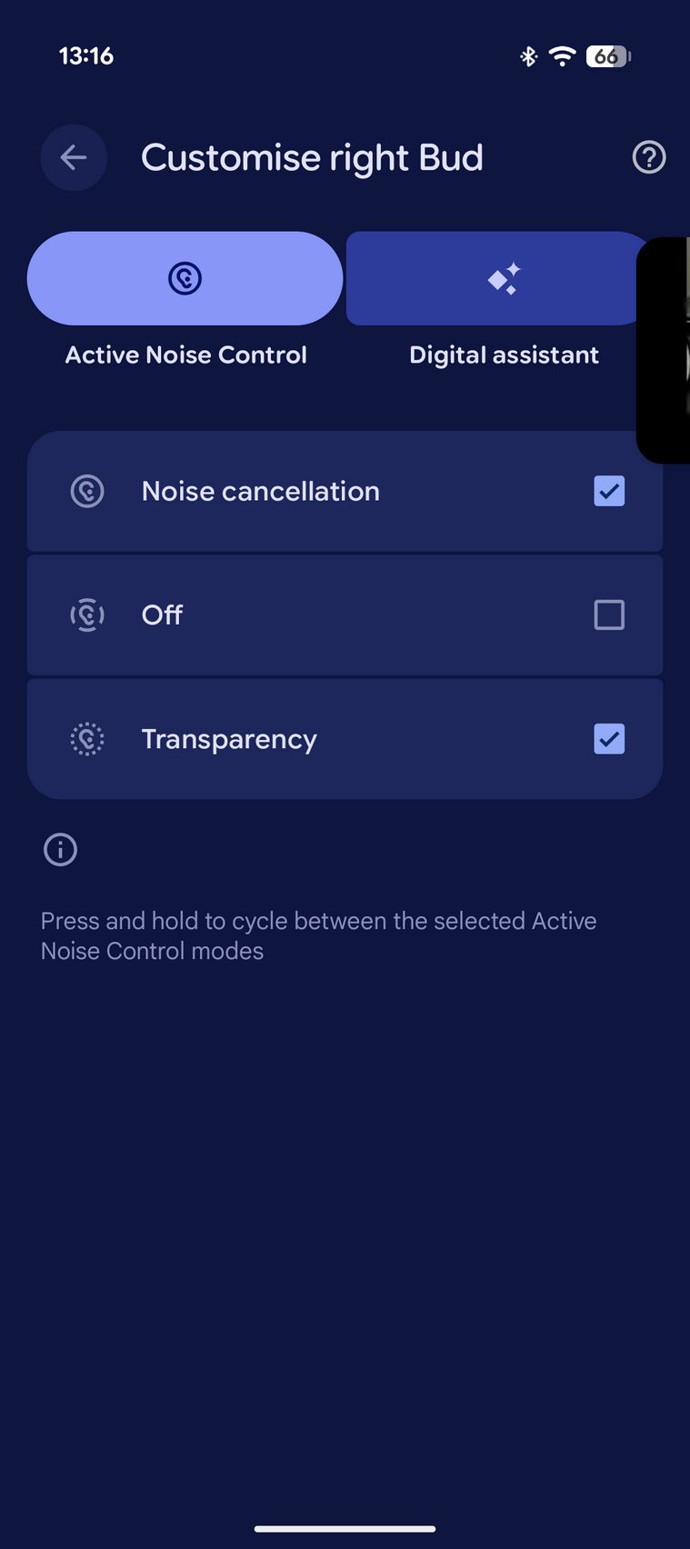 Mai jos sunt opțiunile de ANC cu activ, oprit sau transparency. Urmează setări pentru Asistent Digital, Find Device și comenzi tactile care pot fi customizate: