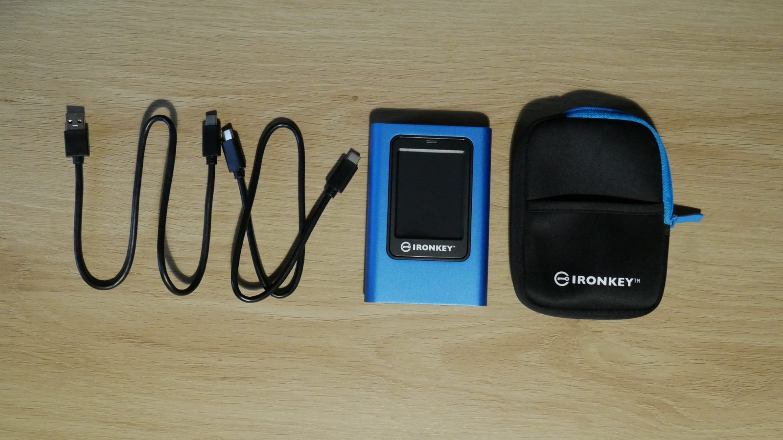 Pachetul vine cu două cabluri de transfer și cu un fel de husă din neopren pentru protecție care arată foarte fain. Cele două cabluri sunt USB 3.2 de la USB C la C și de la USB C la A, asta ca să aveți toate variantele la îndemână. Ambele se pot stoca în buzunarul de pe husă de transport. Ce e nou și unic pe acest SSD este partea de criptare cu protocol FIPS 197 pe 256-bits pentru protecție împotriva unor dispozitive cu viruși sau malware sau chiar împotriva unor așa-numite BadUSB dacă cineva va vrea răul… digital.