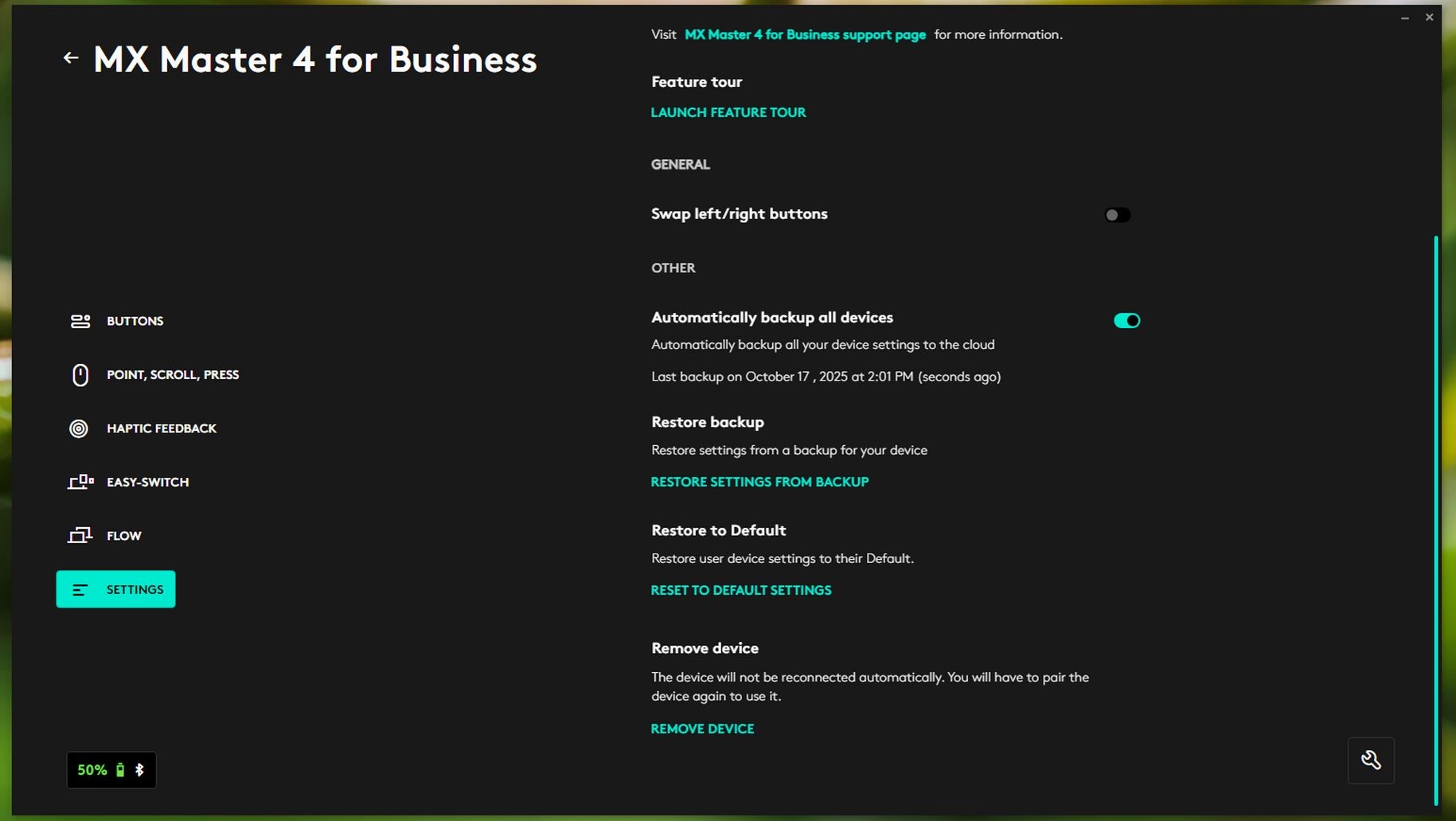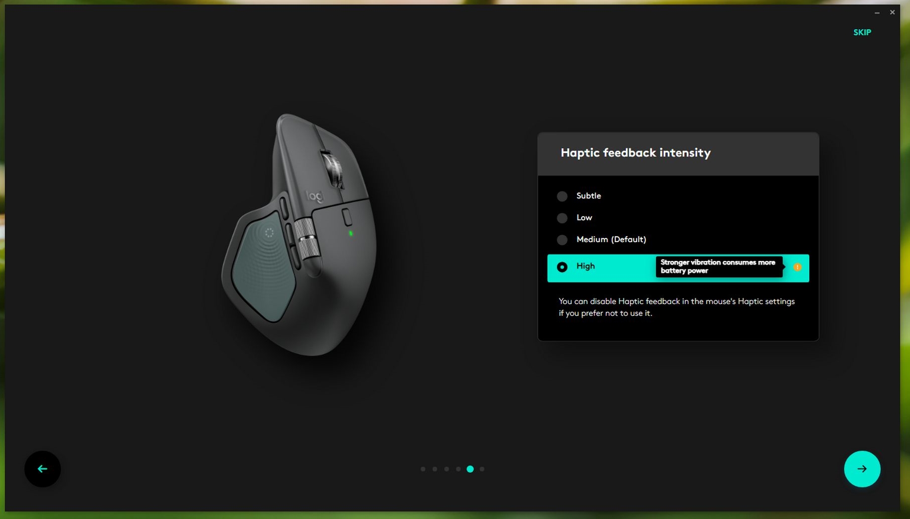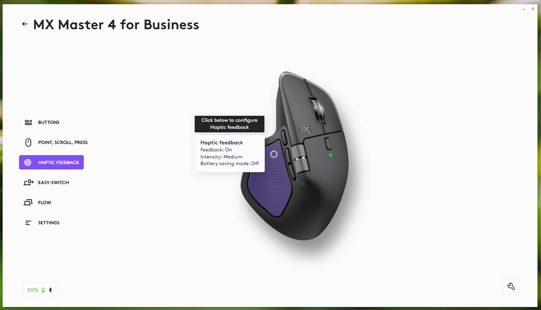 Marea noutate față de generația trebuie să fie feedback-ul haptic pe care Logitech l-a gândit pentru a aduce un plus de imersivitate și precizie în fluxul de lucru și asta se remarcă. Aș menționa aici că răspunsul prin vibrații intră în scenă doar la anumite acțiuni și notificări, ajustări. Totul se customizează din aplicația Logi Options+. Aici am reglat cât de sesizabil să fie nivelul de vibrație, cu opțiuni precum Subtle, Low, Medium sau High.