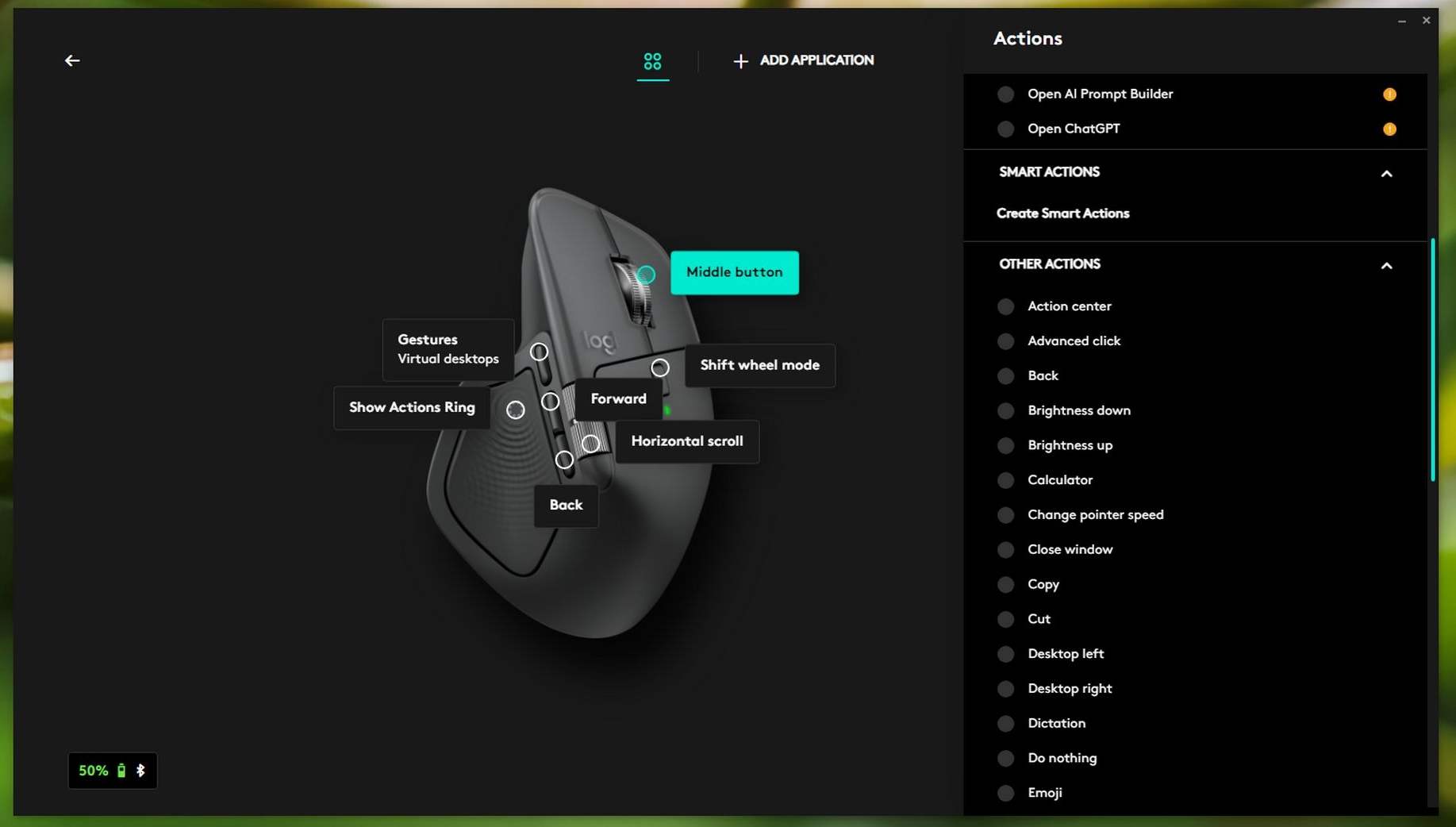 Este sesizabil și feedback-ul haptic și la switch-ul între desktop-uri și între ecrane, ceva care funcționează ca un soi de alertă încât să știi că ai ajuns unde trebuie pentru că și eu mă mai pierd în muncă și mi-a fost mai ușor să știu că am Photoshop deschis pe al doilea desktop. Văd că pot schimba și acțiunea de la apăsarea butonului de jos, în loc de Actions Ring să mă ducă la AI Actions (deschide ChatGPT) de exemplu.