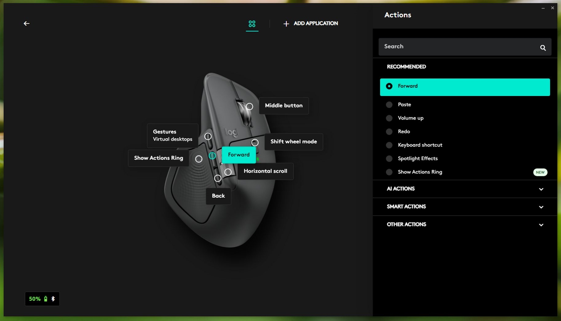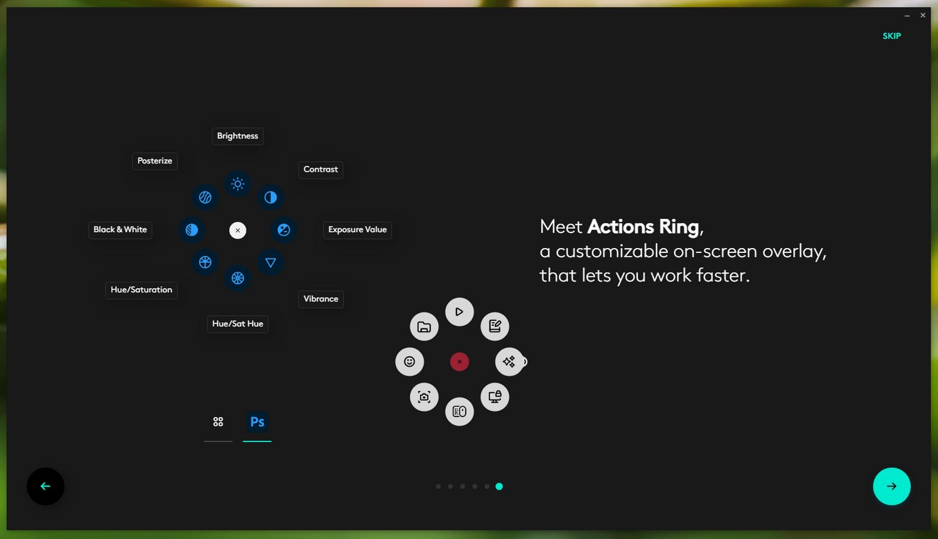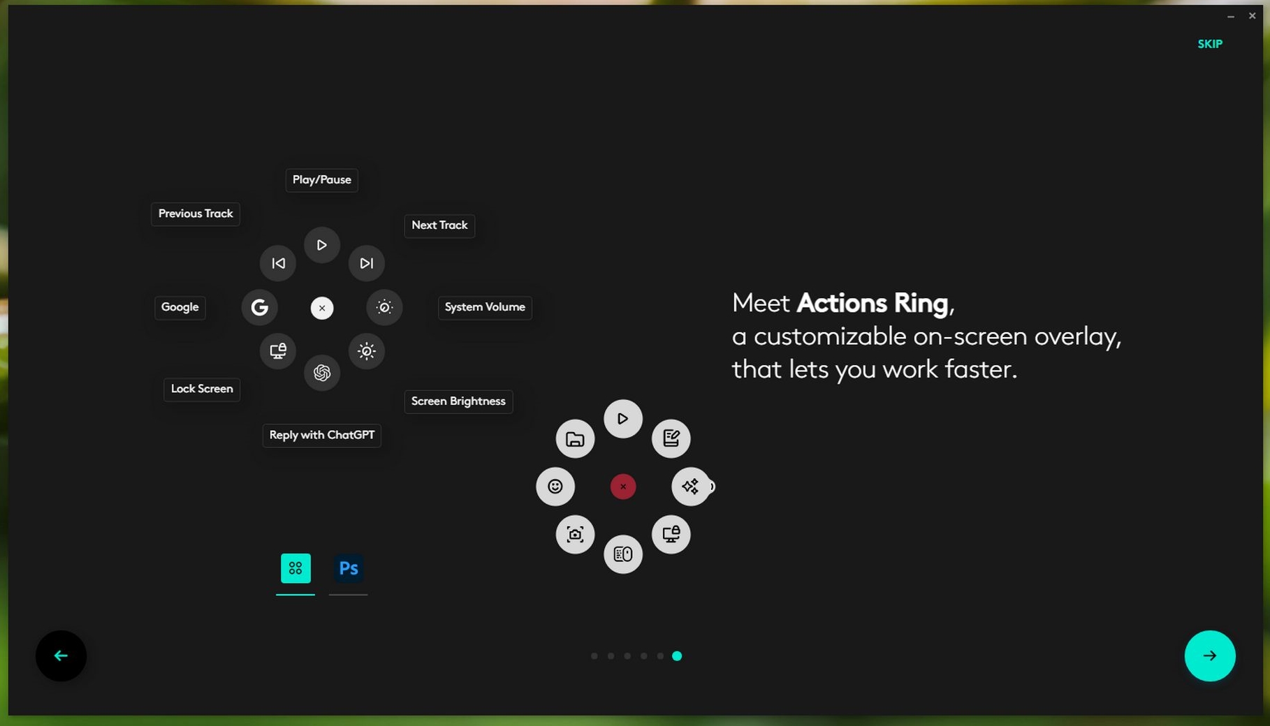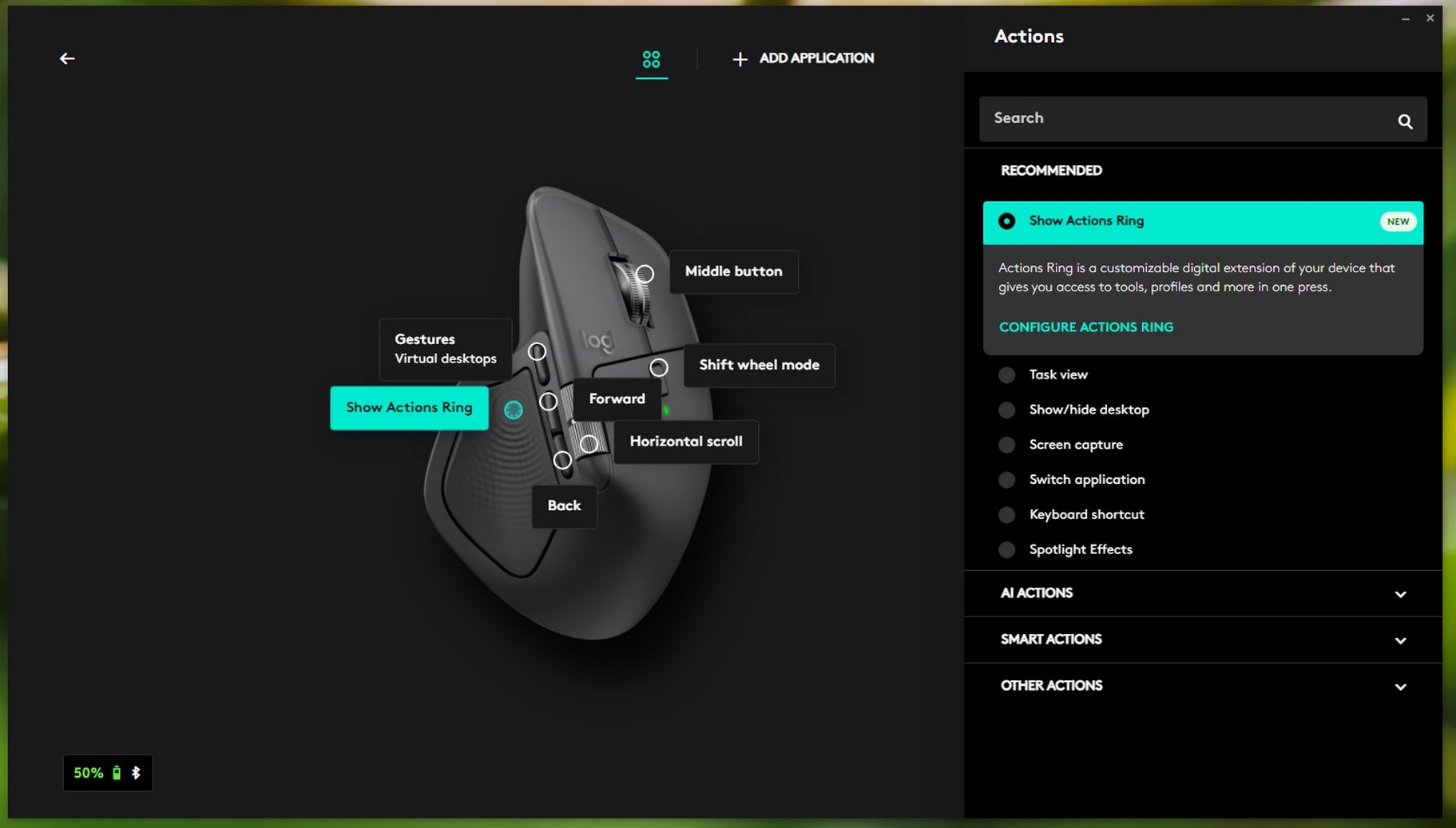 Vibrează și la trecerea printre opțiunile deschise în inel iar pentru aplicații precum Zoom, Photoshop am instalat un pluging care să activeze feedback-ul haptic. Am accesat Actions Ring și mi-am setat din interfața aplicației Logitech ce tool-uri să am la dispoziție de exemplu în Photoshop sau Adobe Premiere, fiind oferite câteva pachete de comenzi rapide plus posibilitatea de a crea un "inel" personalizat.