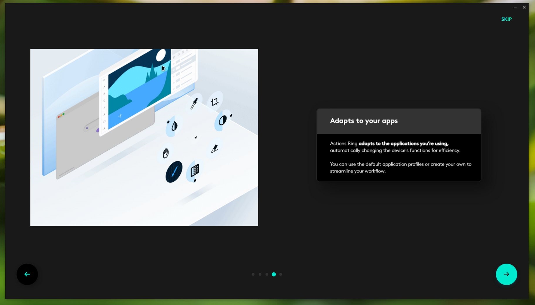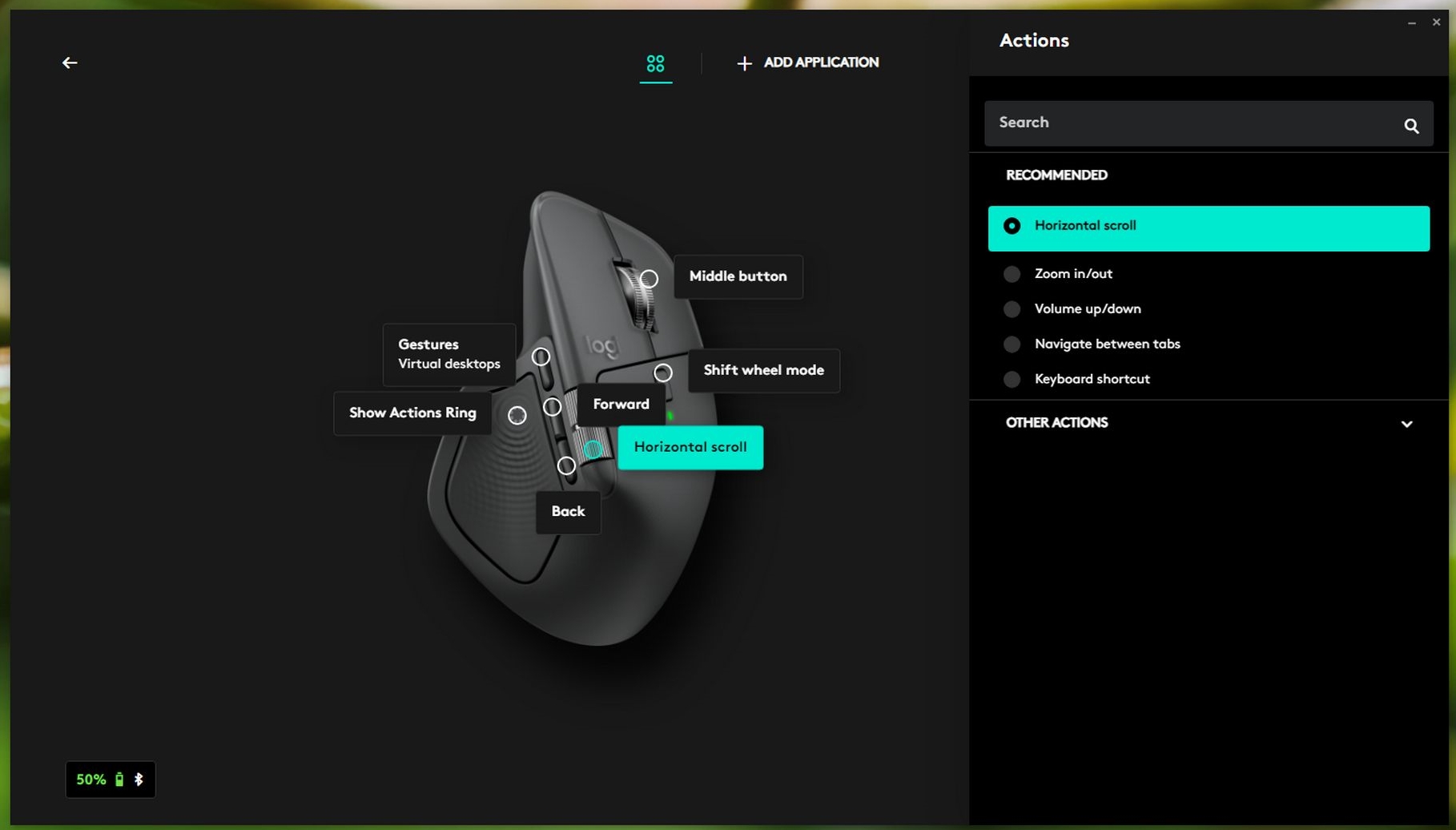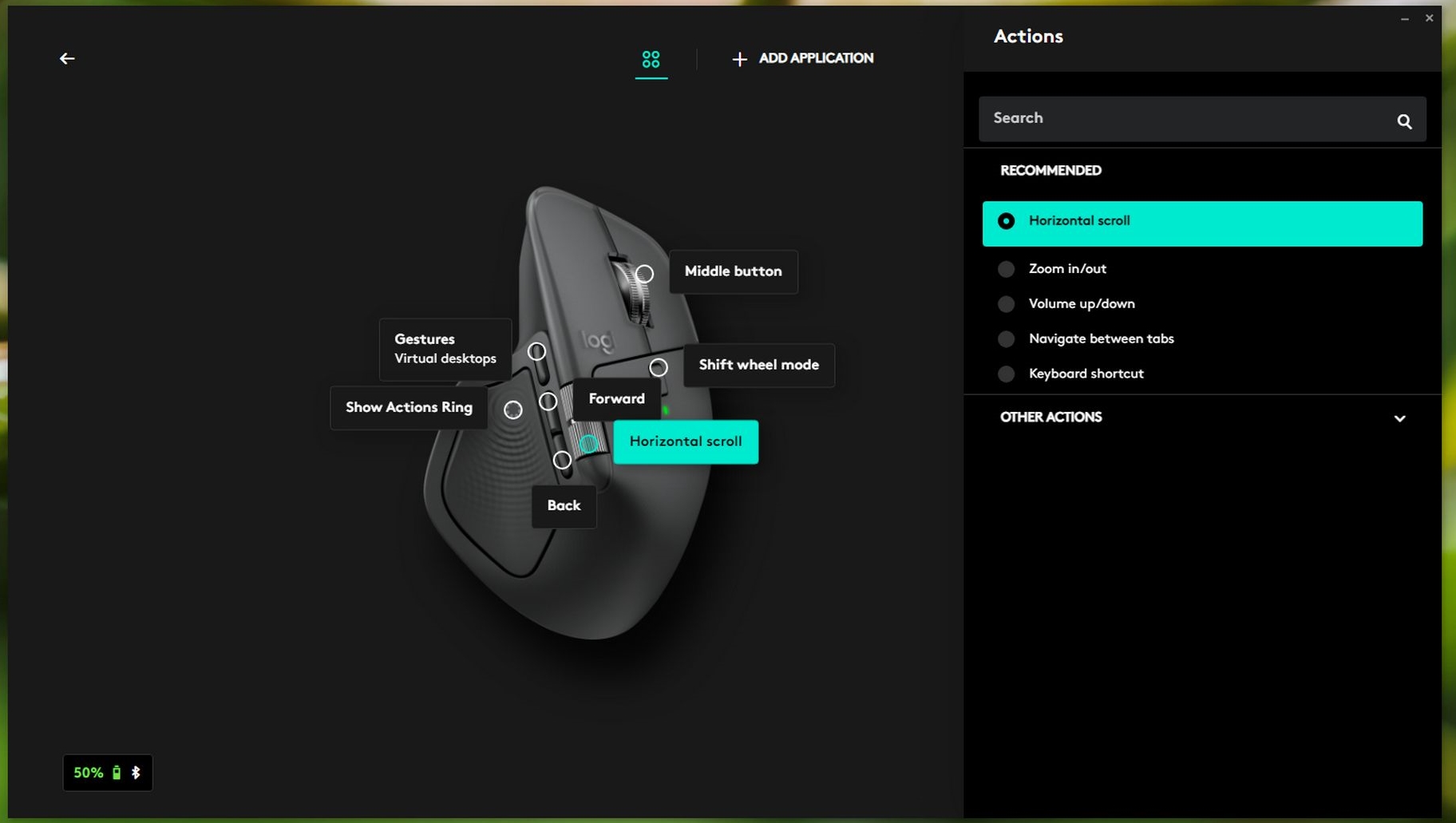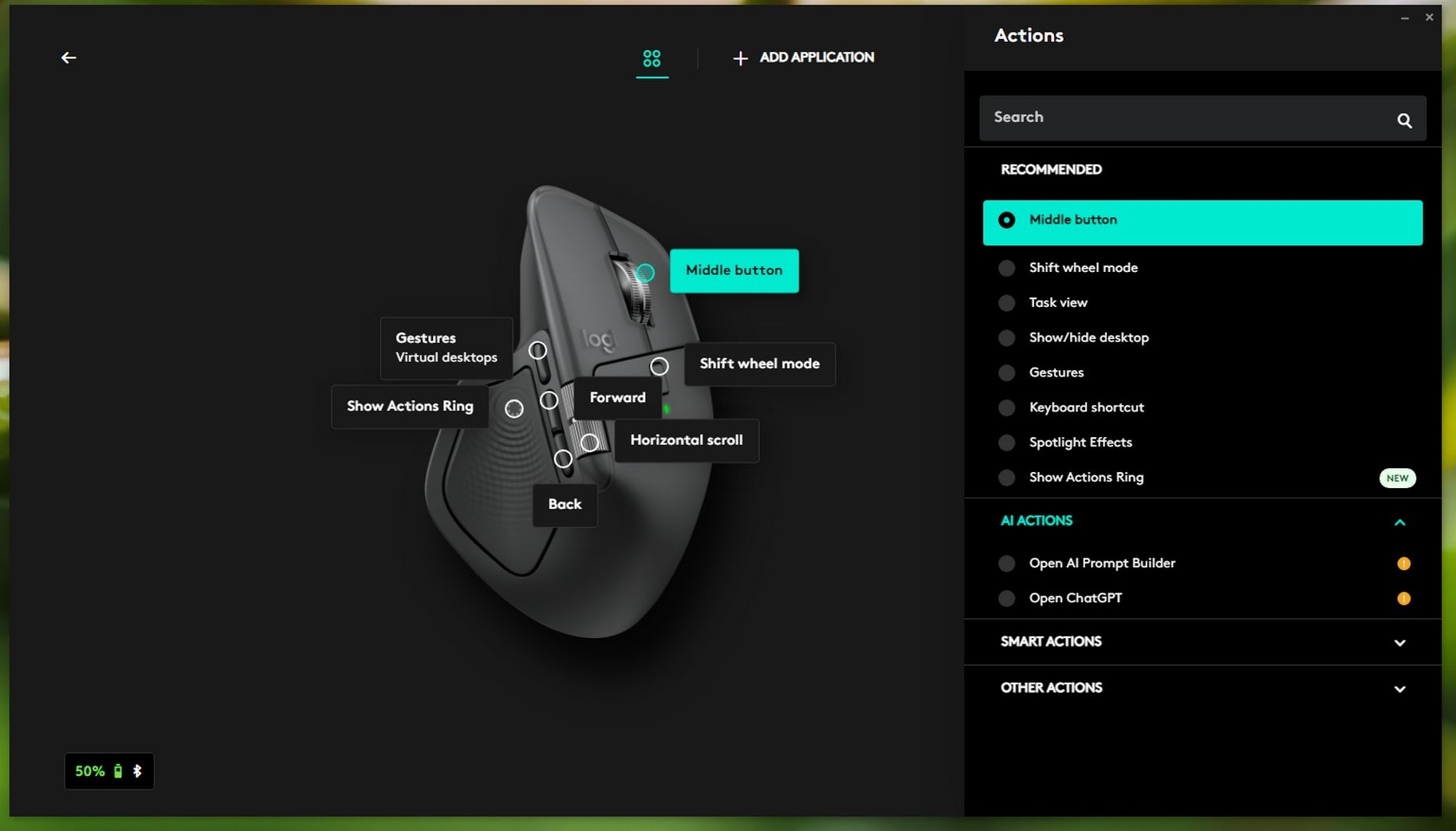 Vibrează și la trecerea printre opțiunile deschise în inel iar pentru aplicații precum Zoom, Photoshop am instalat un pluging care să activeze feedback-ul haptic. Am accesat Actions Ring și mi-am setat din interfața aplicației Logitech ce tool-uri să am la dispoziție de exemplu în Photoshop sau Adobe Premiere, fiind oferite câteva pachete de comenzi rapide plus posibilitatea de a crea un "inel" personalizat.