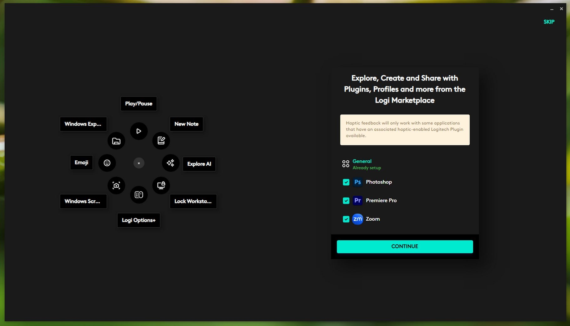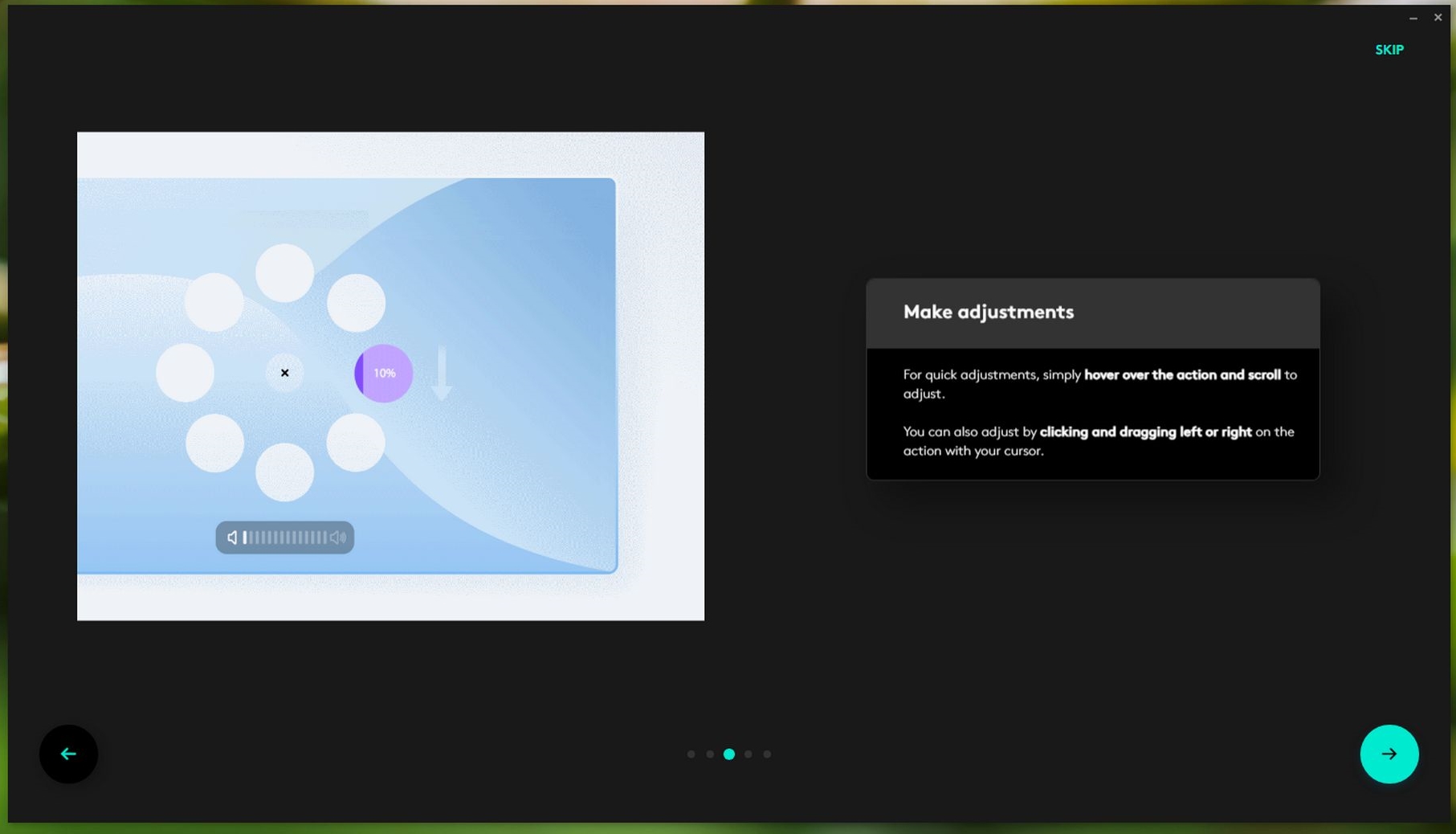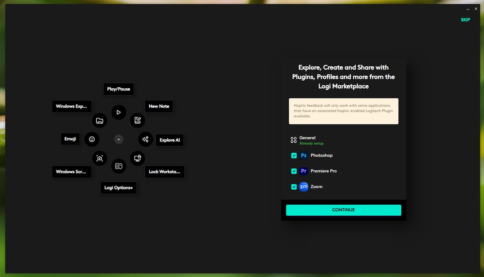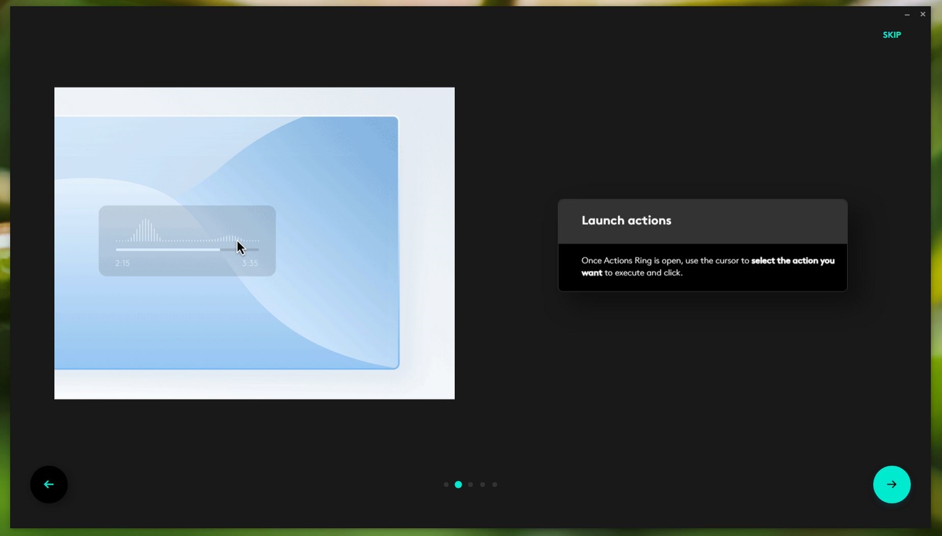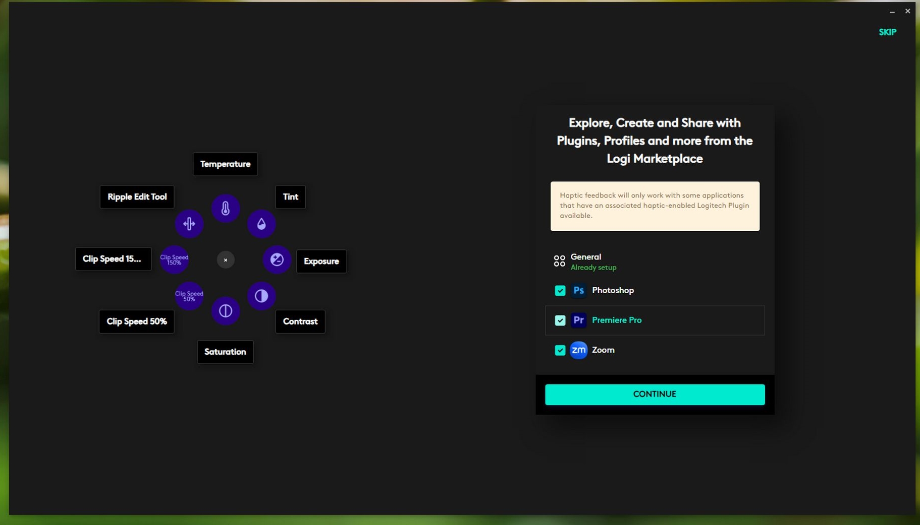 Vibrează și la trecerea printre opțiunile deschise în inel iar pentru aplicații precum Zoom, Photoshop am instalat un pluging care să activeze feedback-ul haptic. Am accesat Actions Ring și mi-am setat din interfața aplicației Logitech ce tool-uri să am la dispoziție de exemplu în Photoshop sau Adobe Premiere, fiind oferite câteva pachete de comenzi rapide plus posibilitatea de a crea un "inel" personalizat.