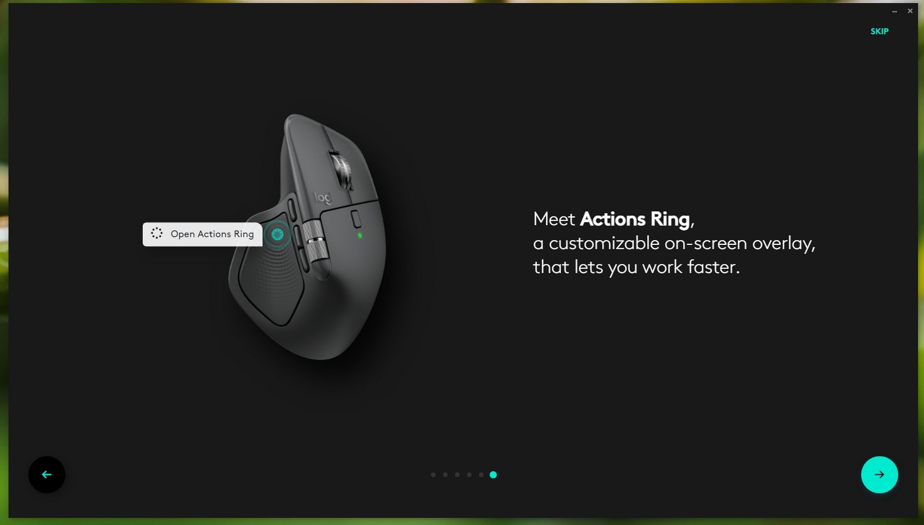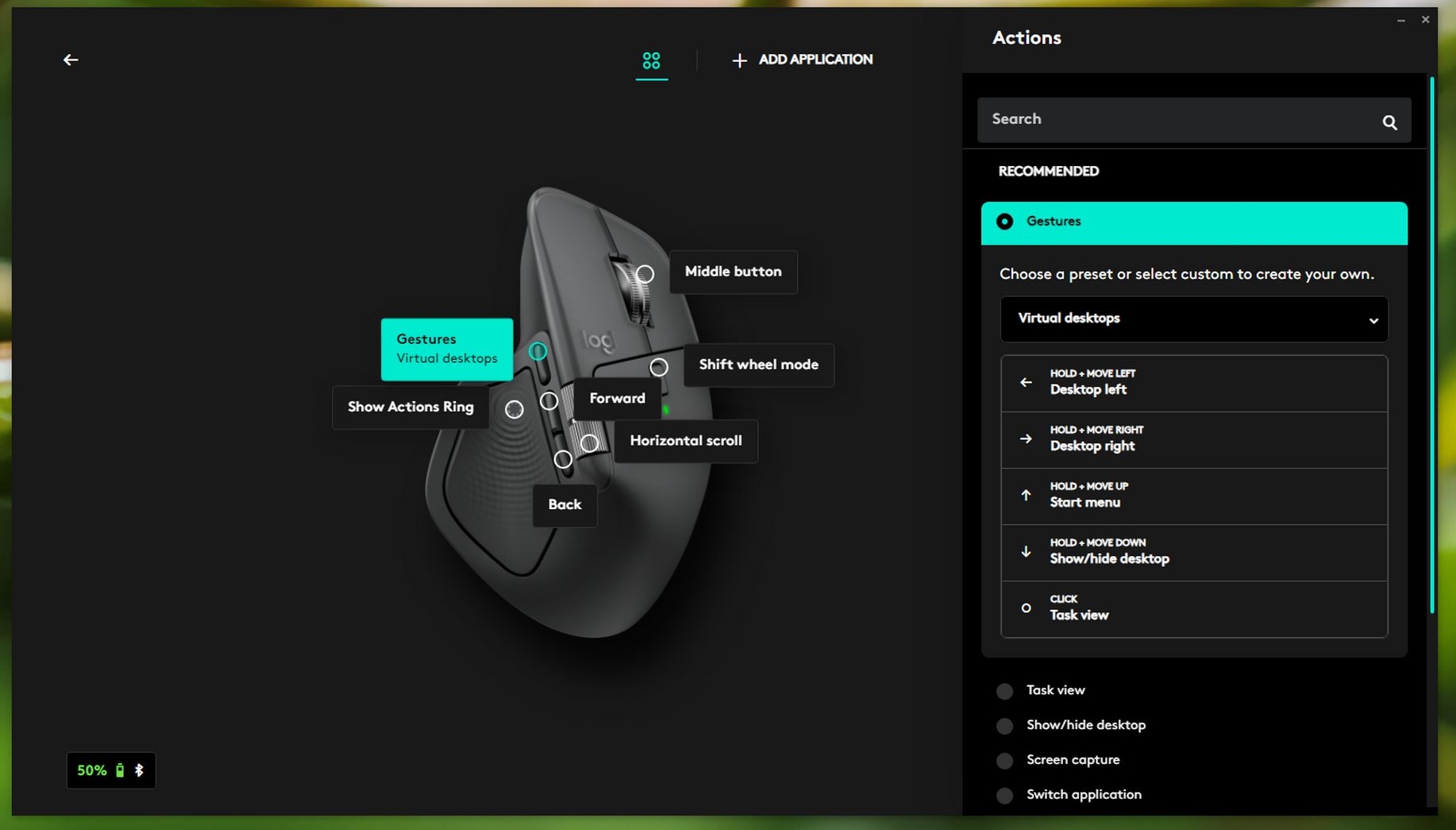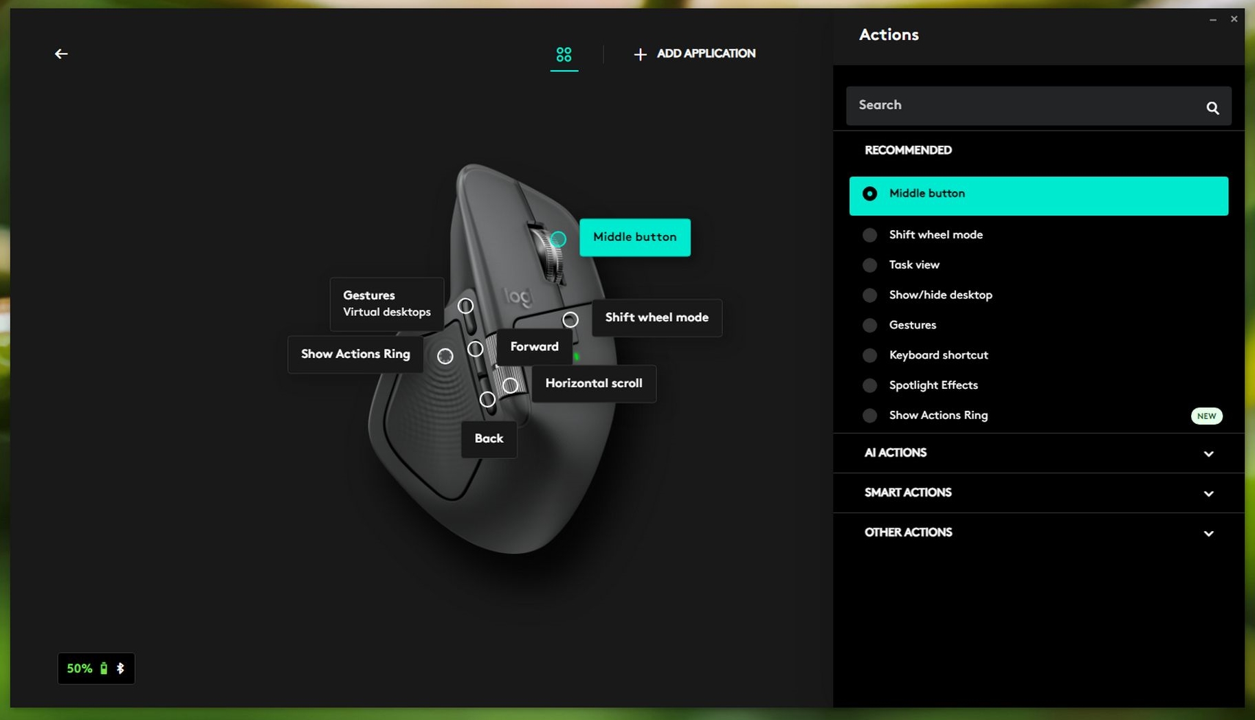 Se poate și dezactiva complet la nevoie. Am avut feedback haptic la apăsarea butonului pe care se odihnește degetul mare, numit Actions Ring cu referire la inelul de opțiuni pe care îl oferă la apăsare. Sunt implicate aici și shortcut-urile Actions Rings care economisesc 33% din timp, pentru că se pot accesa mai rapid tool-urile necesare direct de pe mouse. Logitech spune că se reduce semnificativ timpul pentru că nu mai stai să tot cauți prin meniuri tool-ul dorit. Se reduc și mișcările mouse-ului cu până la 63%.