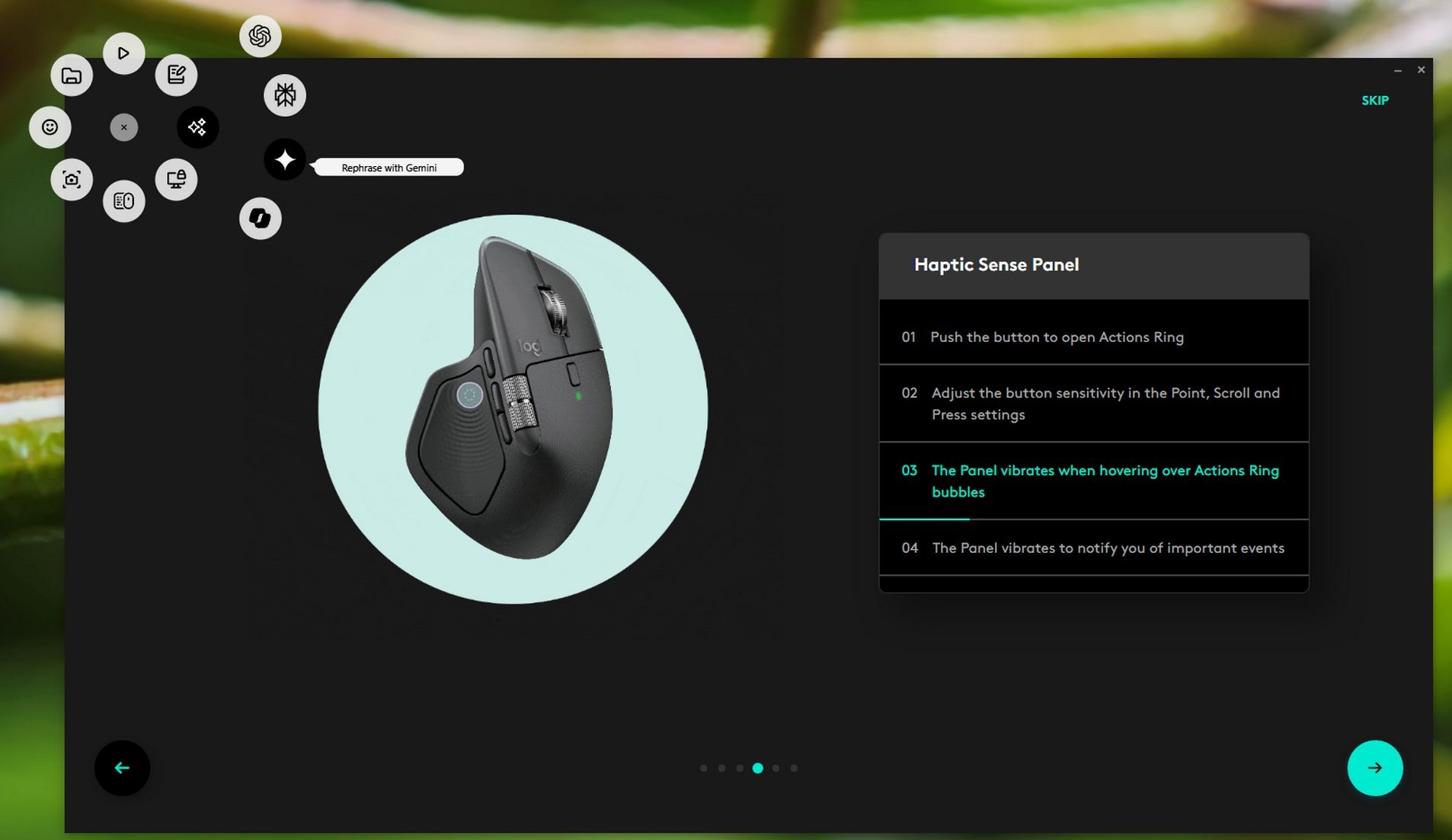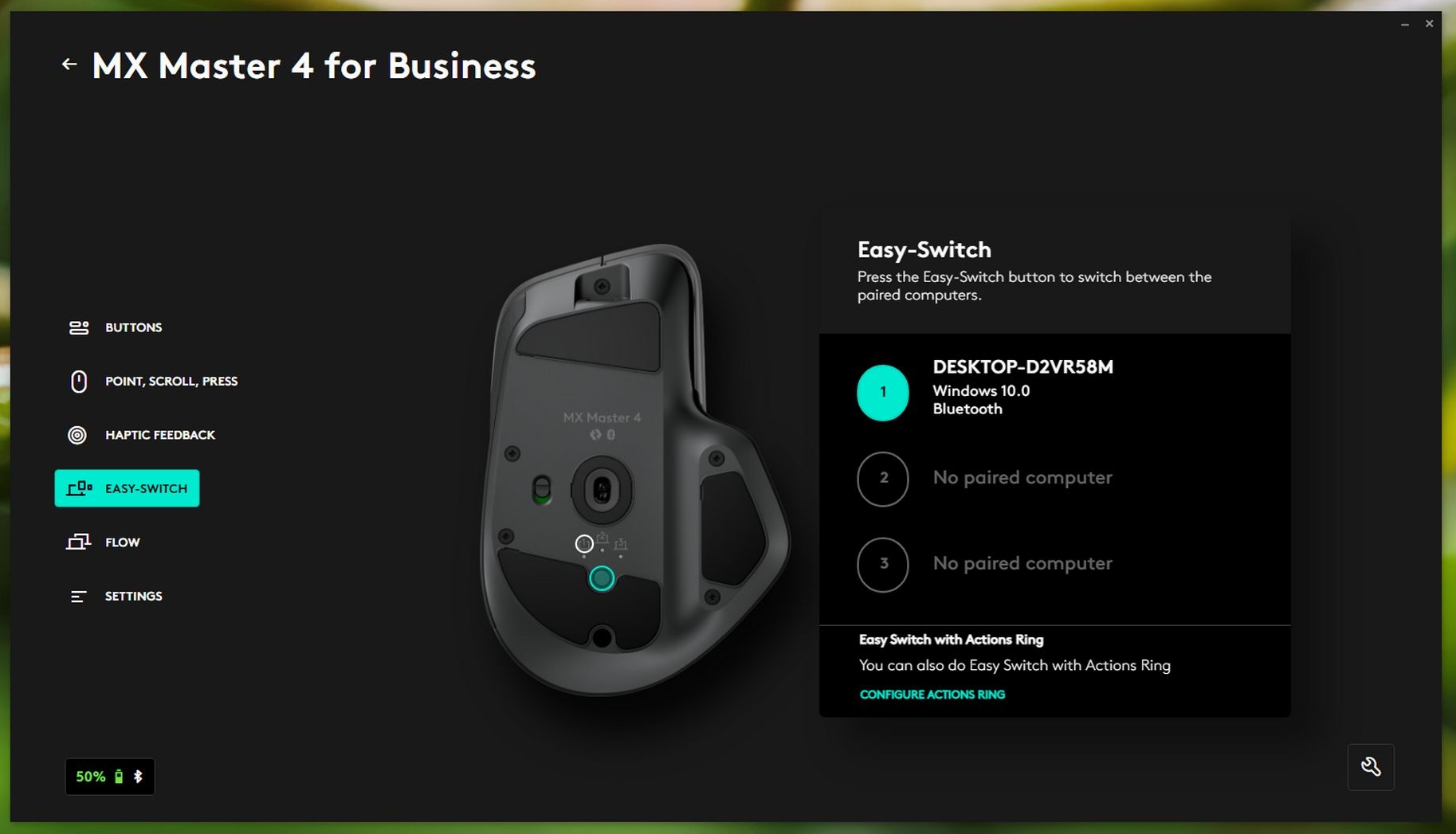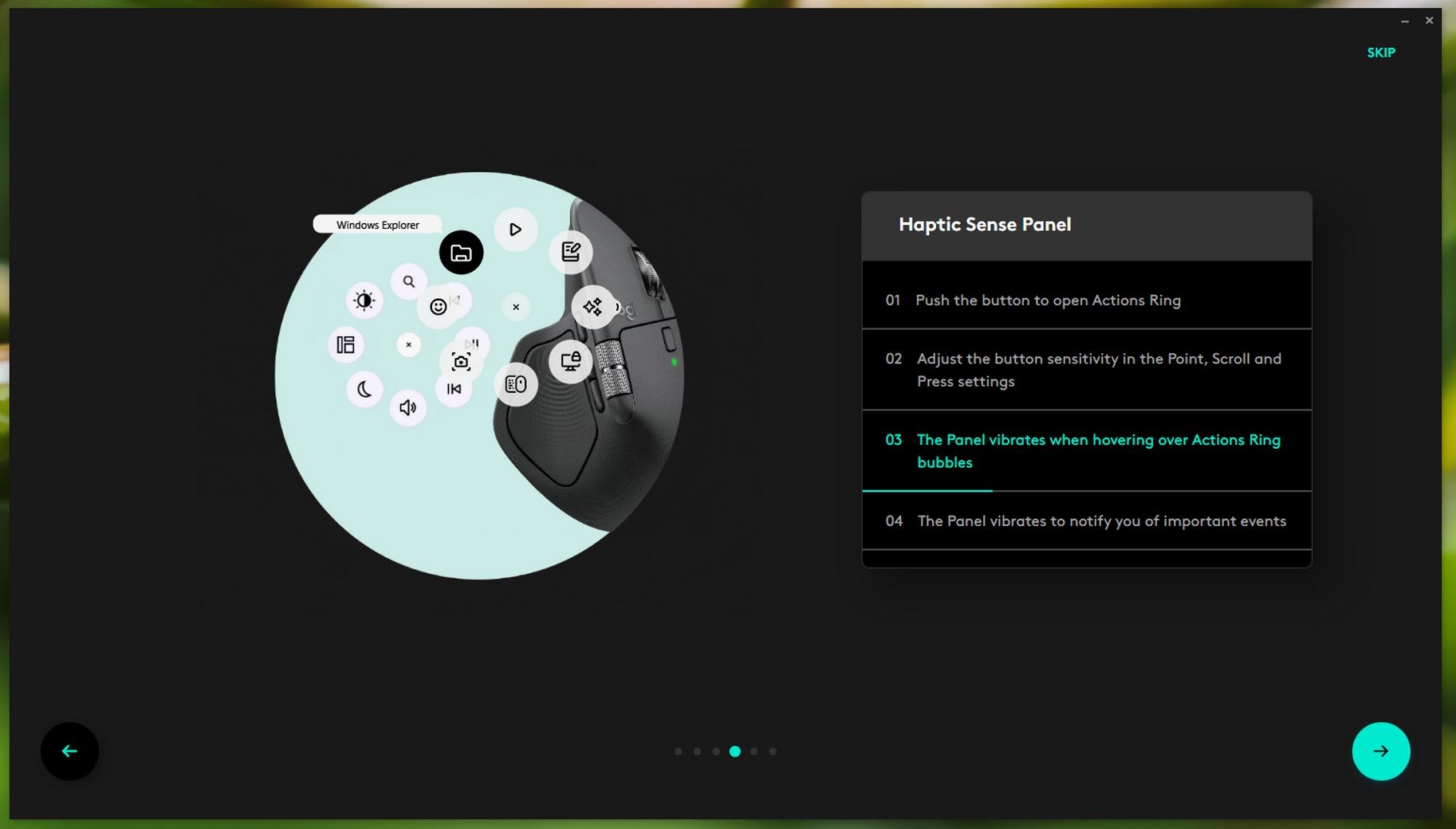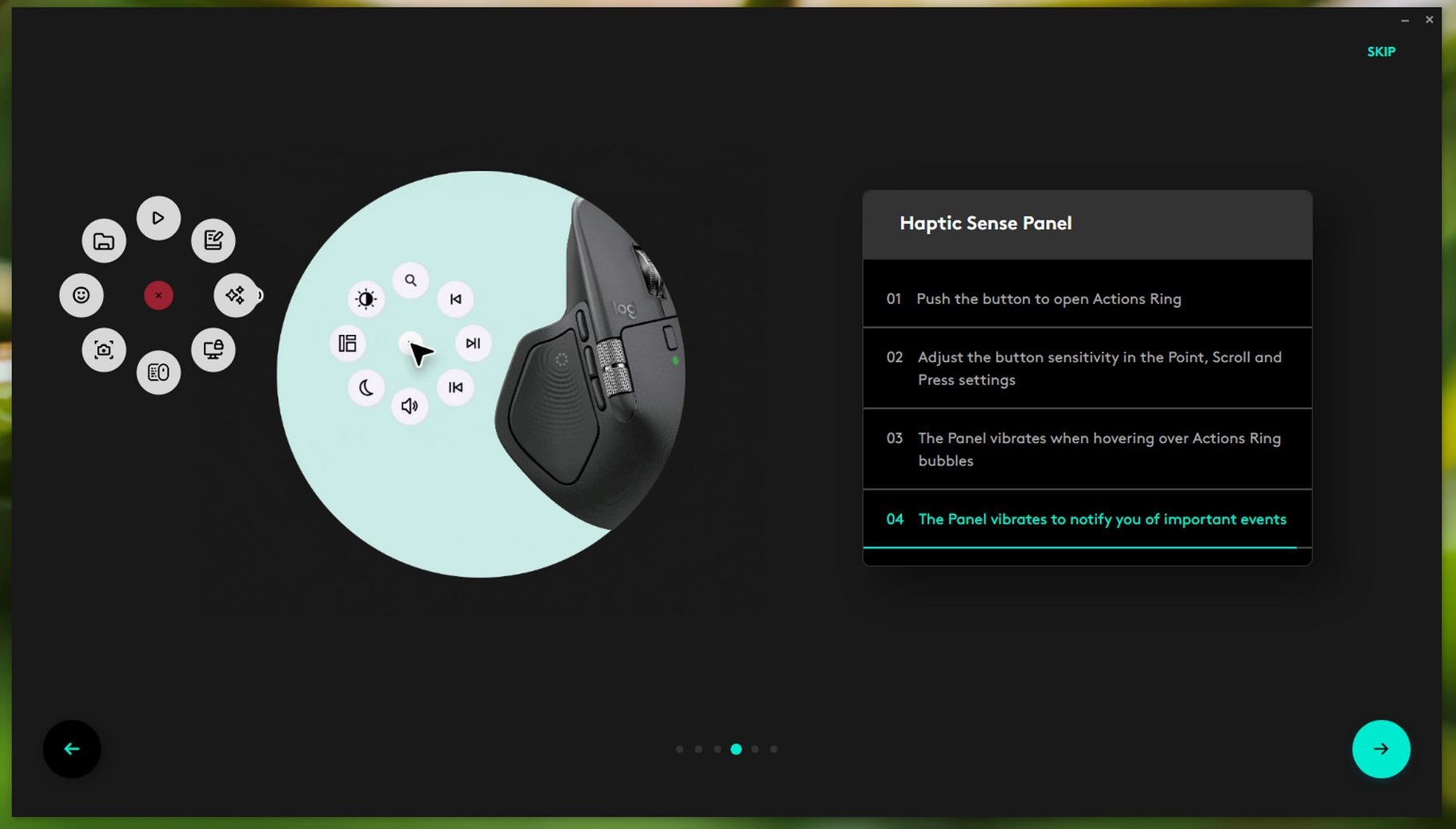 Se poate și dezactiva complet la nevoie. Am avut feedback haptic la apăsarea butonului pe care se odihnește degetul mare, numit Actions Ring cu referire la inelul de opțiuni pe care îl oferă la apăsare. Sunt implicate aici și shortcut-urile Actions Rings care economisesc 33% din timp, pentru că se pot accesa mai rapid tool-urile necesare direct de pe mouse. Logitech spune că se reduce semnificativ timpul pentru că nu mai stai să tot cauți prin meniuri tool-ul dorit. Se reduc și mișcările mouse-ului cu până la 63%.