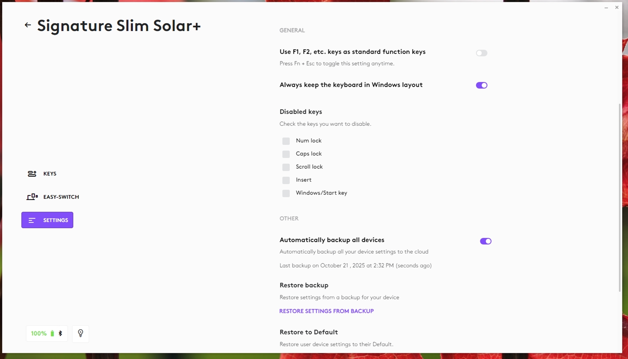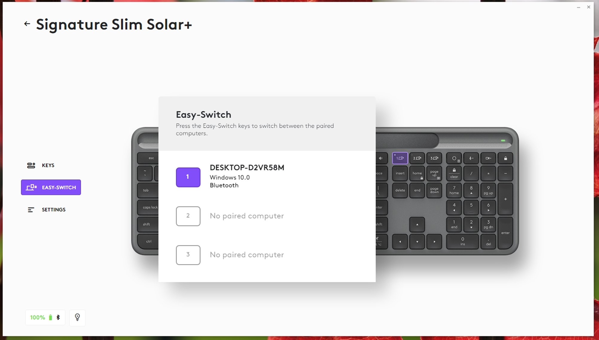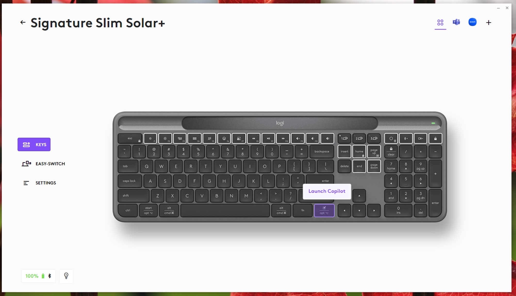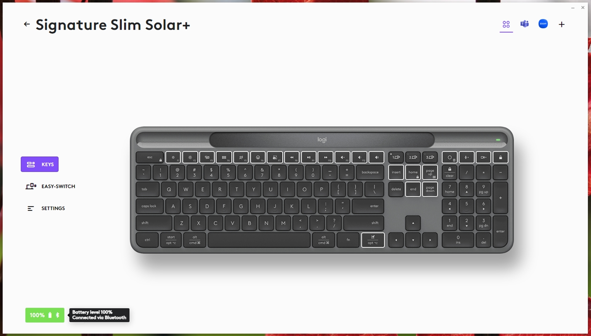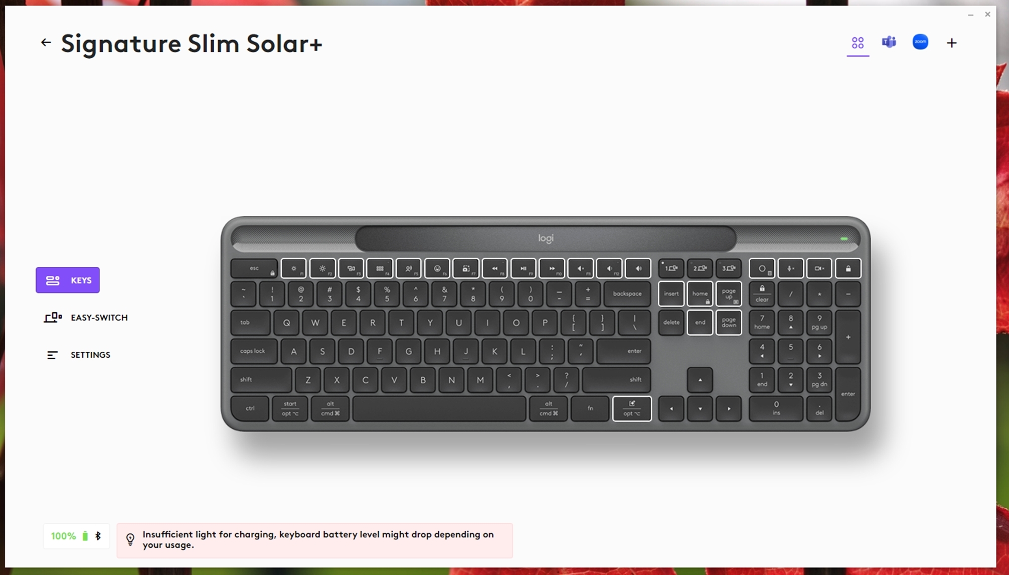 Tastatura Signature Slim Solar+ K980 oferă acces la o autonomie nelimitată și nu a fost nevoie să caut soarele prin casă, să o pun la geam pentru alimentare. Tastatura caută sursele de lumină, solară sau artificială și se hrănește pentru ca bateria să fie mereu încărcată. Într-o săptămână de utilizare procentul este tot la 100% și e așa de satisfying să știi că nu mai trebuie să încarci un dispozitiv. Gata și cu cablurile.