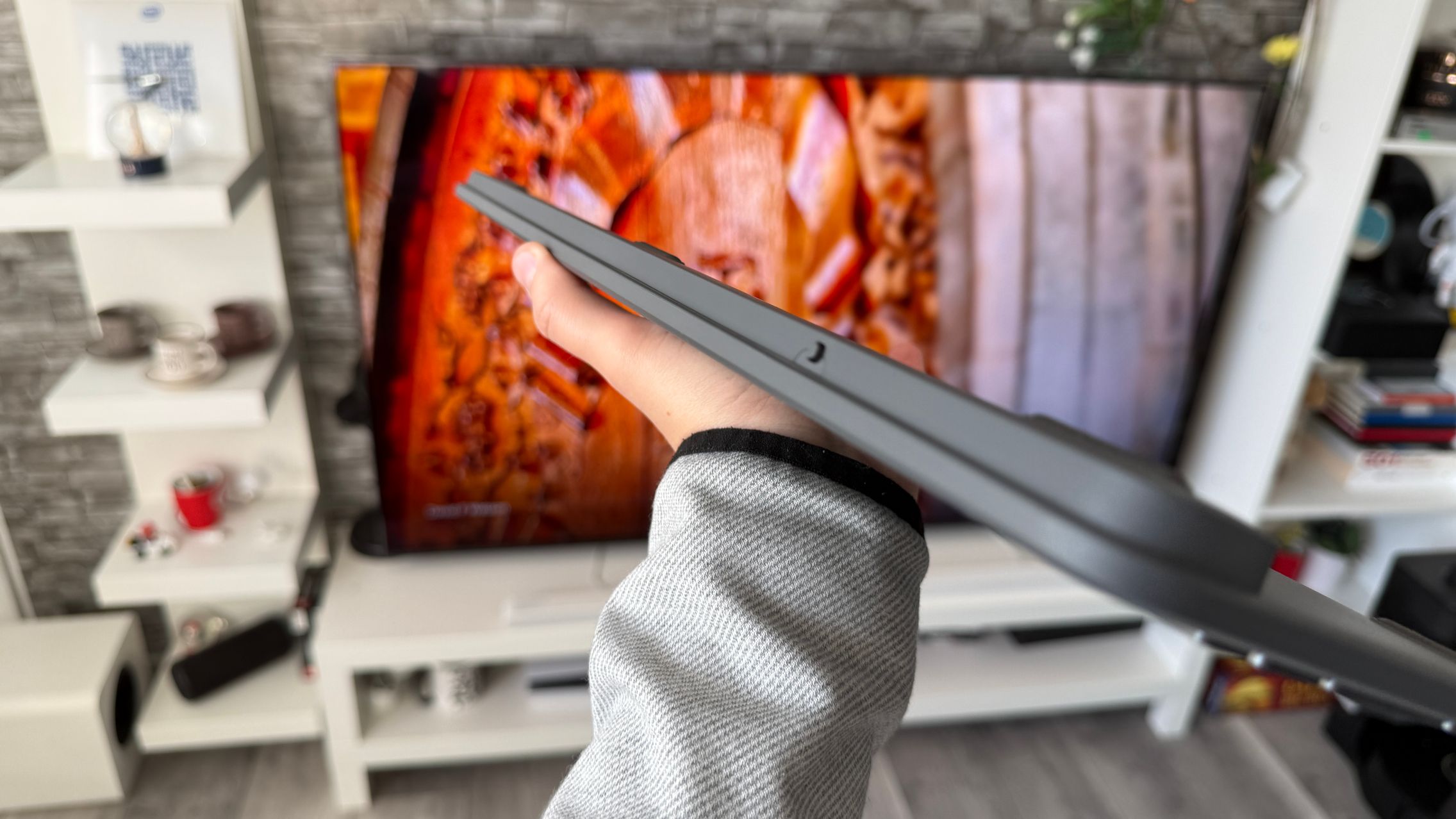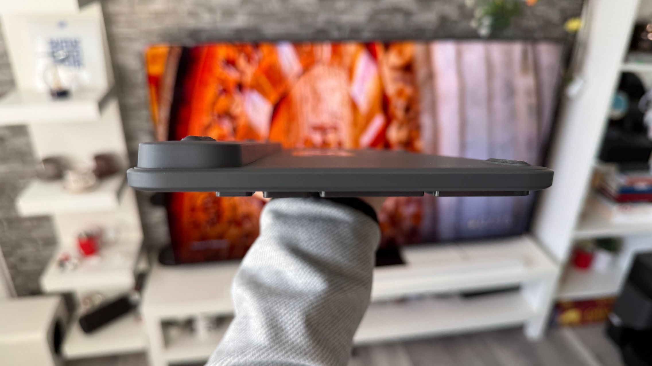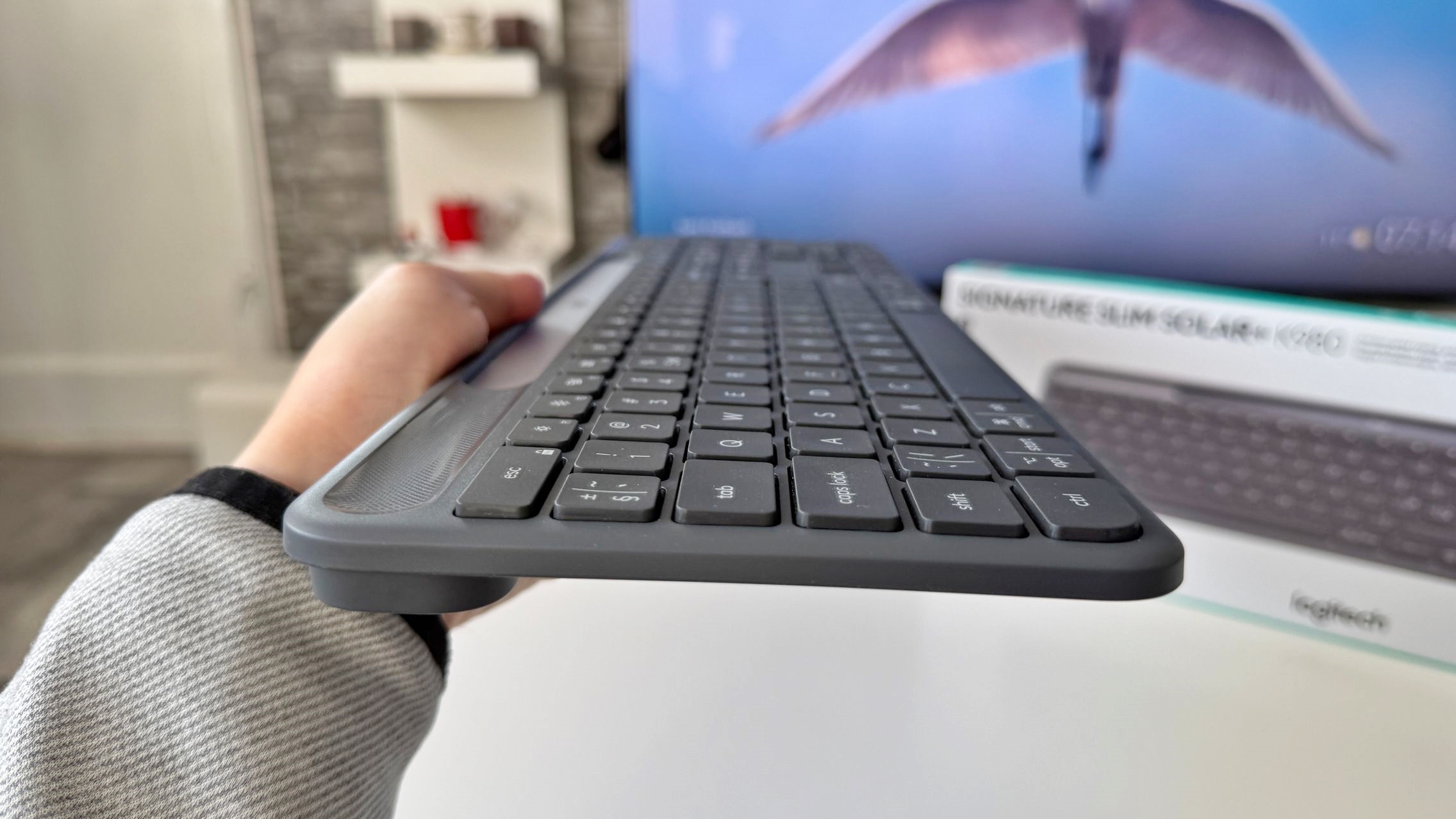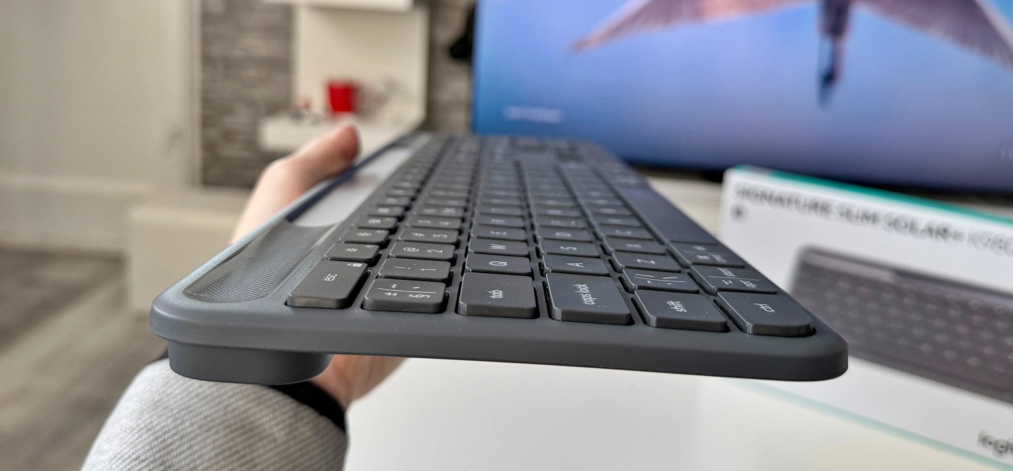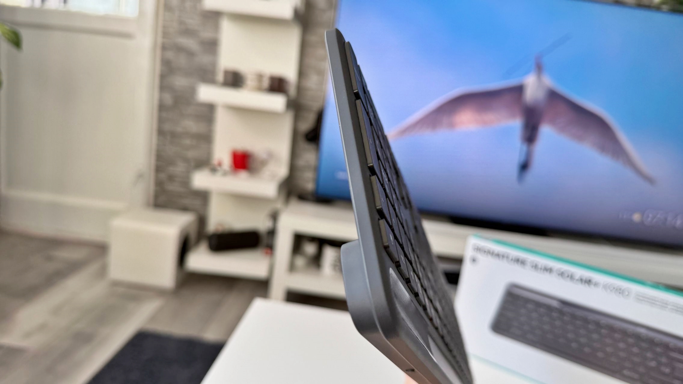 Ca dimensiuni, Logitech Signature Slim Solar+ 980 are o greutate de 700 grame și măsoară 430.8 mm lungime, 142.9 mm lățime și 20.2 mm înălțime. Componentele principale și bateria au fost integrată în zona inferioară care servește și pe post de kickstand, ridicând ușor tastatura. Mi-ar fi plăcut ceva mai sus ce-i drept, mai înclinat. Nu există nici palmrest aici.