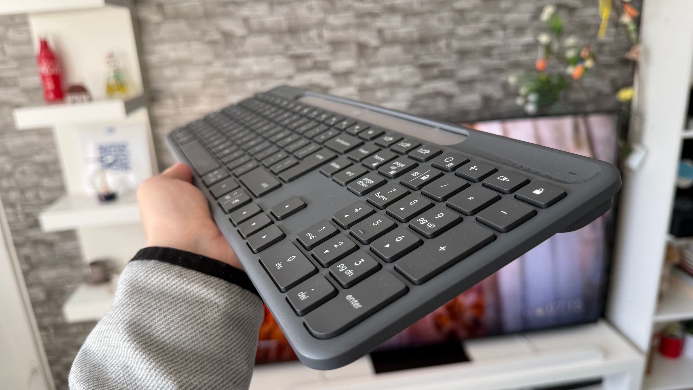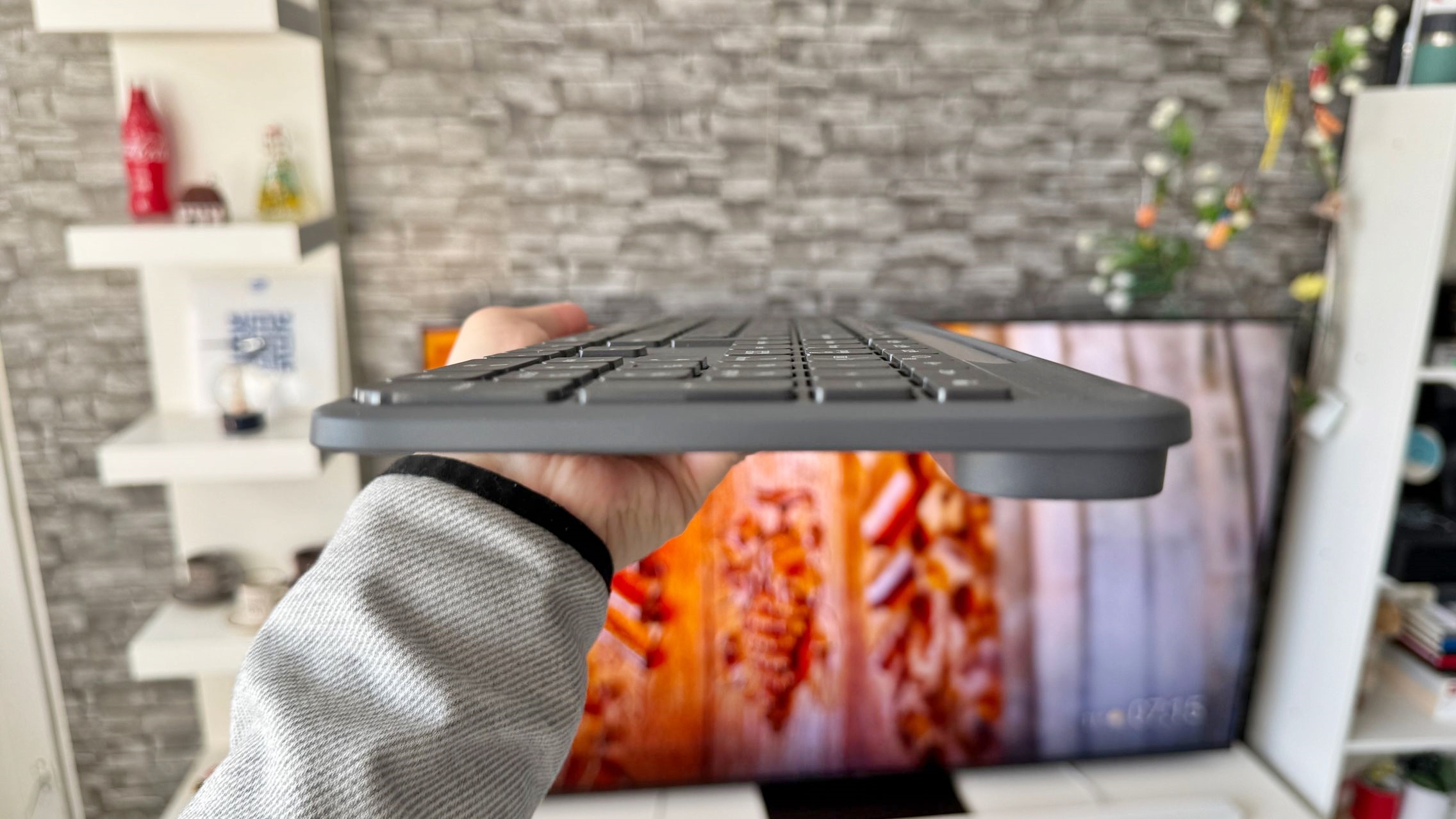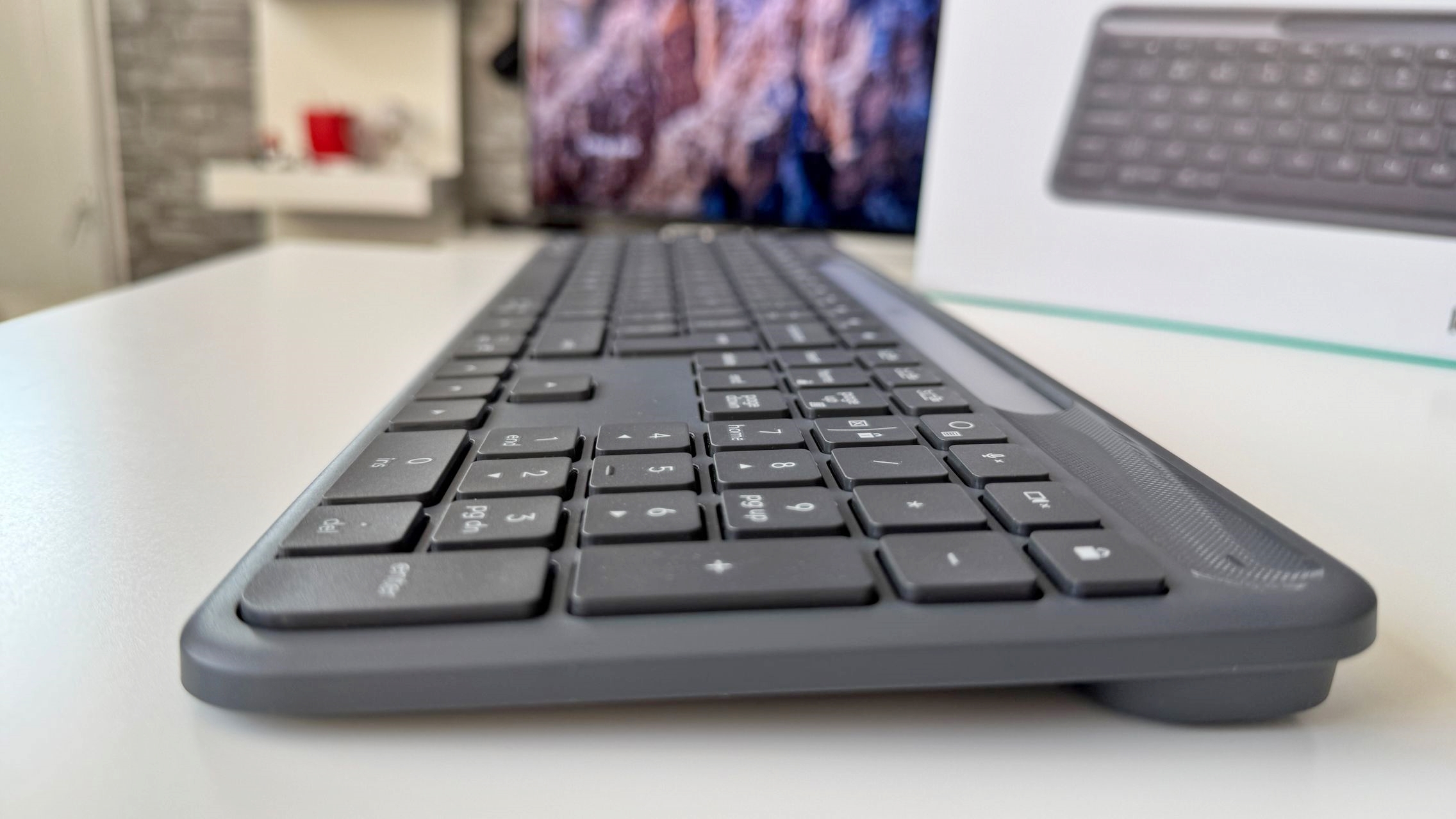 Din punct de vedere vizual tastatura arată minimalist. Are o profil foarte subțire și îmi place nuanța gri adoptată. Este o tastatură full size, adică are și zona NumPad în dreapta, ideală pentru munca office. Butoanele sunt bine spațiate și ce am remarcat din start este travelul scurt, ca de ultrabook. Am avut nevoie de ceva timp pentru familiarizare, dar e precizie la mijloc și finisajul mat texturat pentru fiecare tastă ajută la typing rapid.