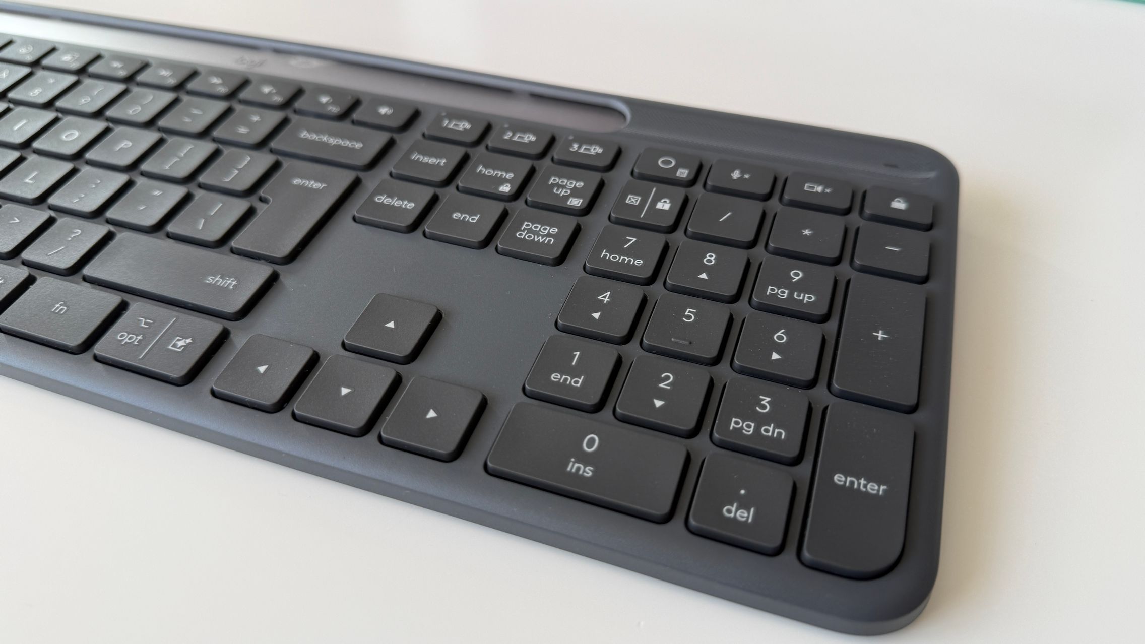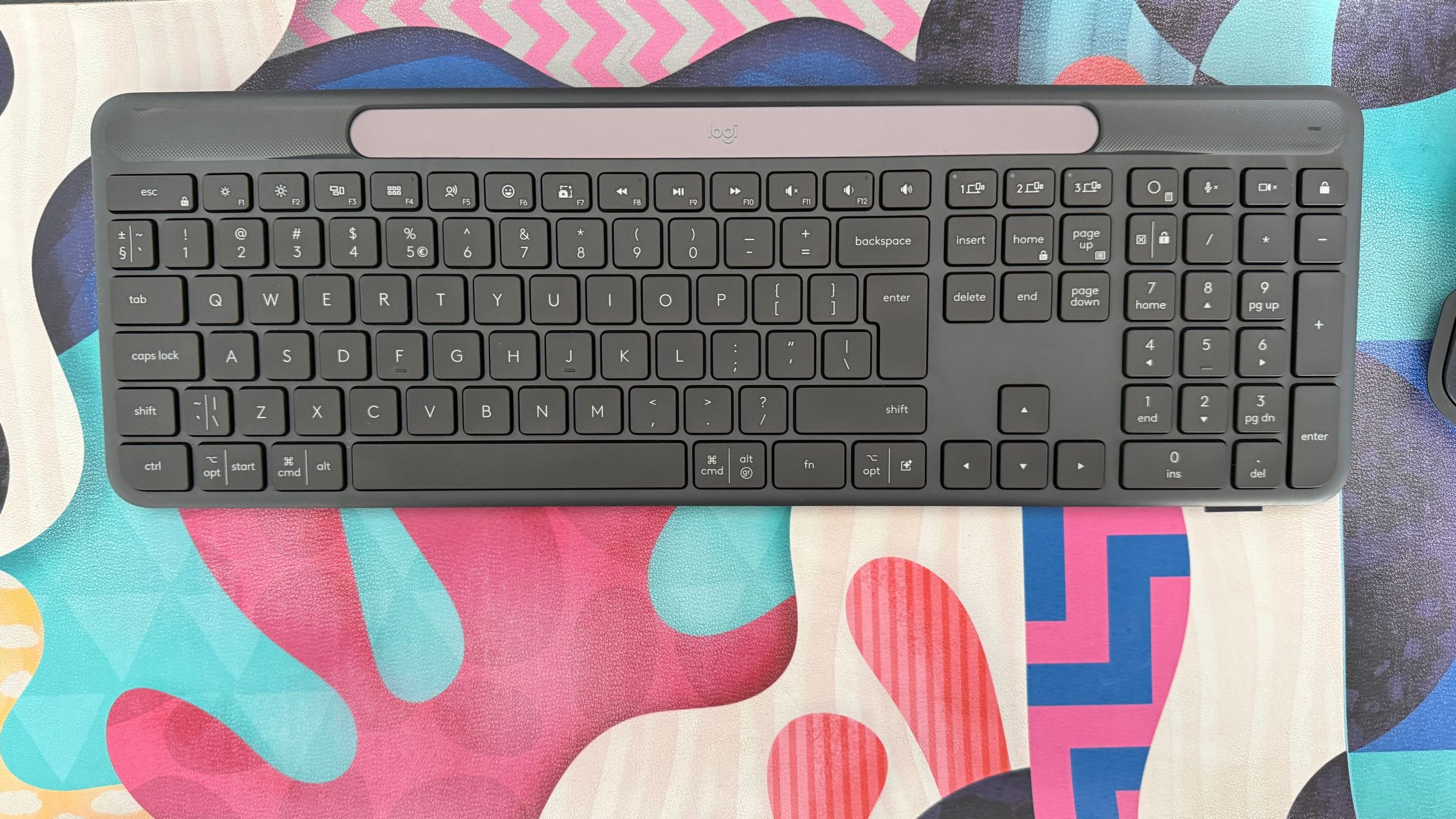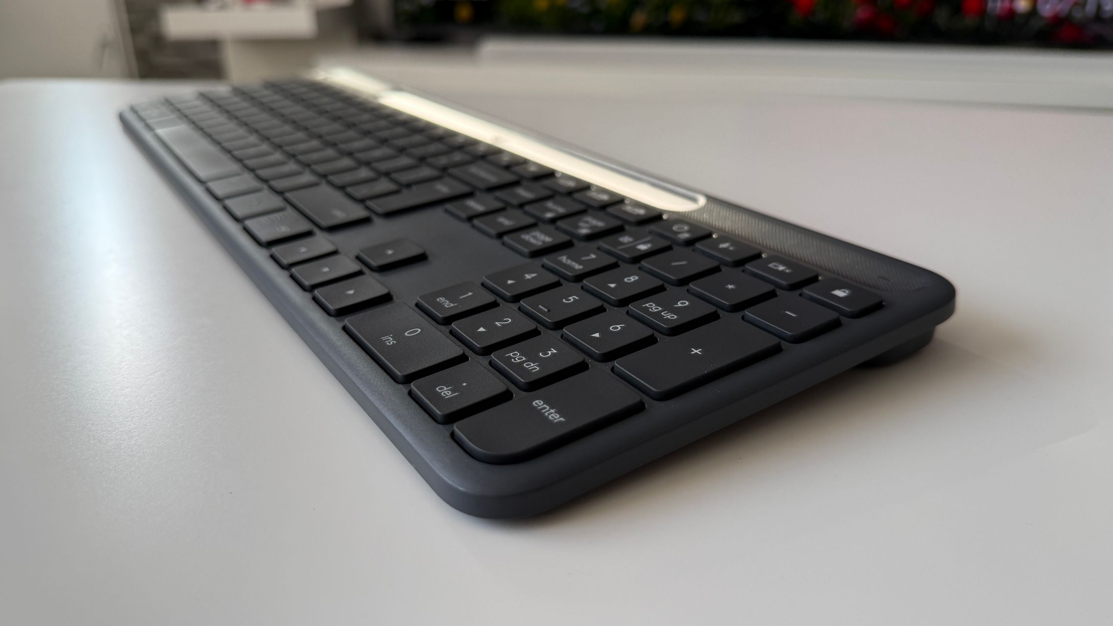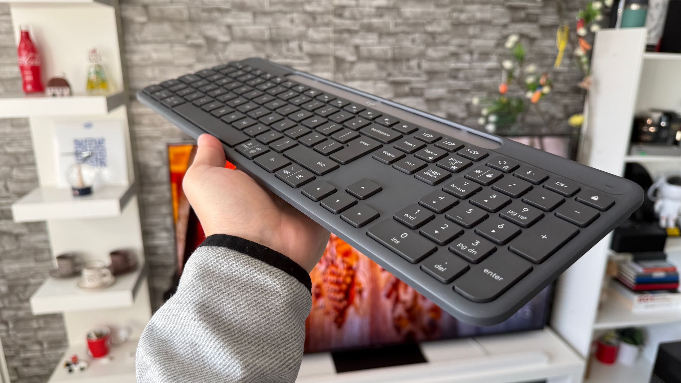 Din punct de vedere vizual tastatura arată minimalist. Are o profil foarte subțire și îmi place nuanța gri adoptată. Este o tastatură full size, adică are și zona NumPad în dreapta, ideală pentru munca office. Butoanele sunt bine spațiate și ce am remarcat din start este travelul scurt, ca de ultrabook. Am avut nevoie de ceva timp pentru familiarizare, dar e precizie la mijloc și finisajul mat texturat pentru fiecare tastă ajută la typing rapid.