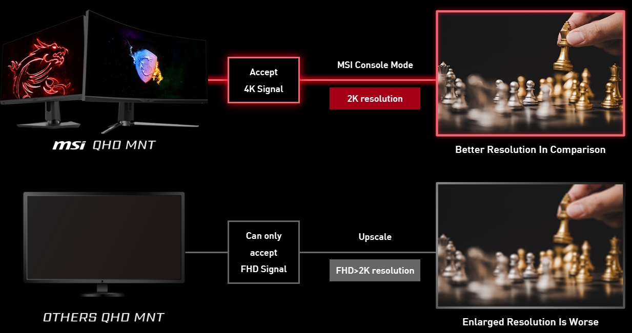 Așa cum am amintit și mai sus, monitorul de gaming MSI Optix MPG321QRF-QD vine cu un mod exclusiv numit Console Mode pentru console, care poate accepta automat semnal 4K pe un monitor QHD și simultan suportă și HDR. Avem și compatibilitate 120Hz pentru PlayStation sau Xbox. Dacă ești curios cum să faci setările aferente, găsești un link tutorial aici.
