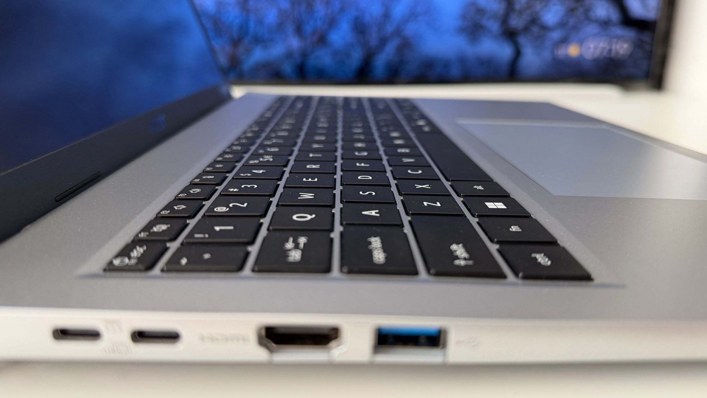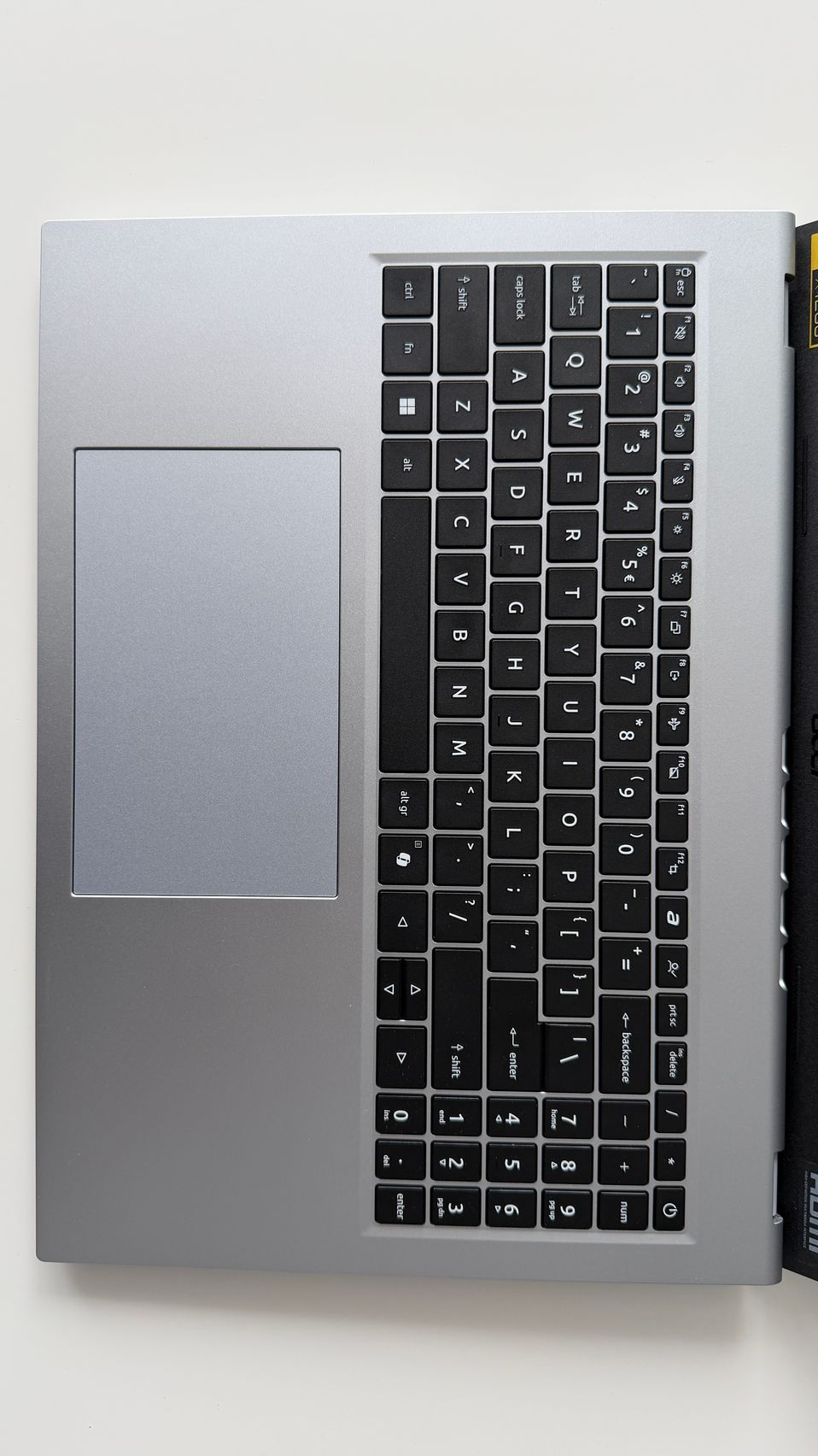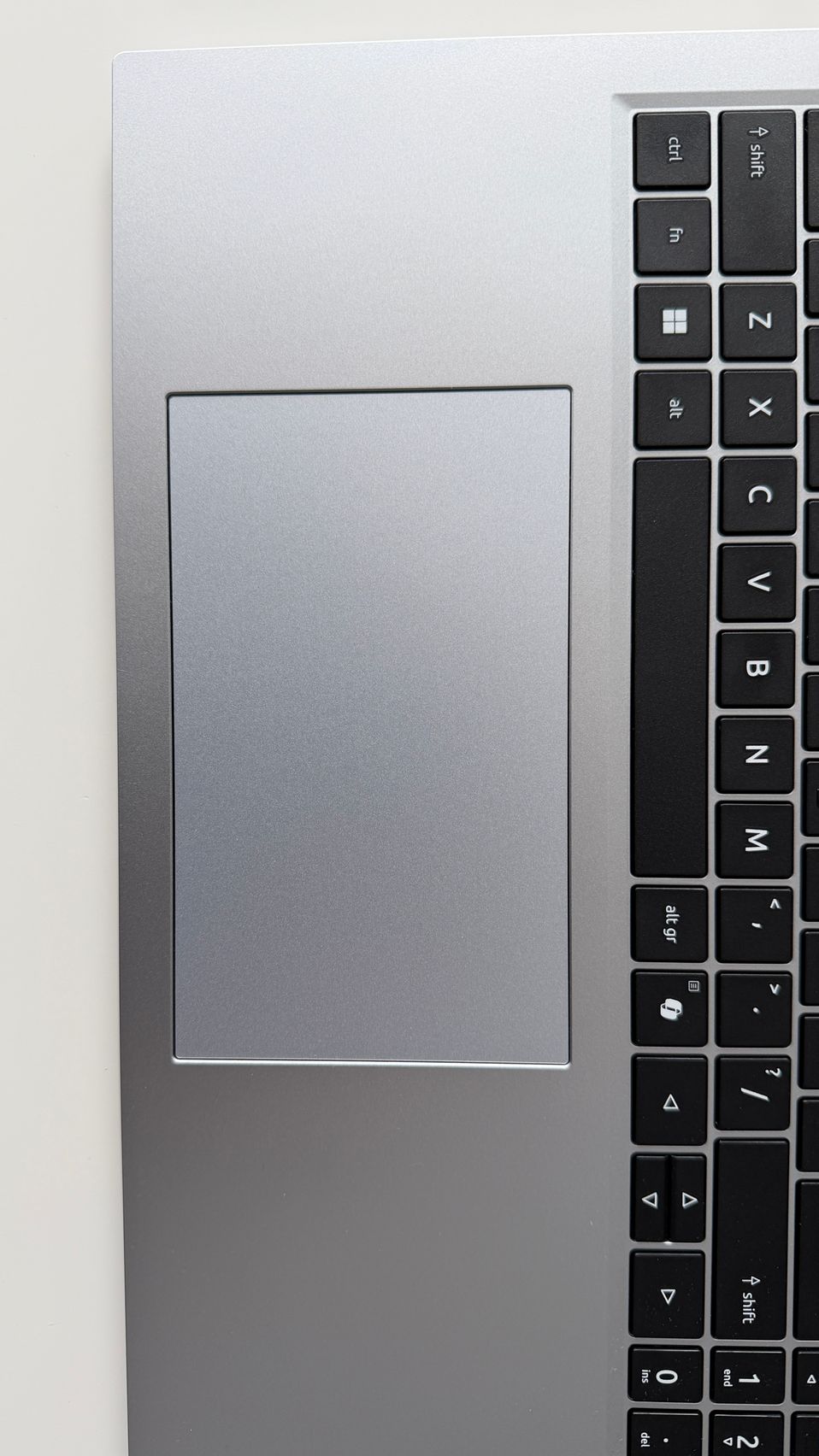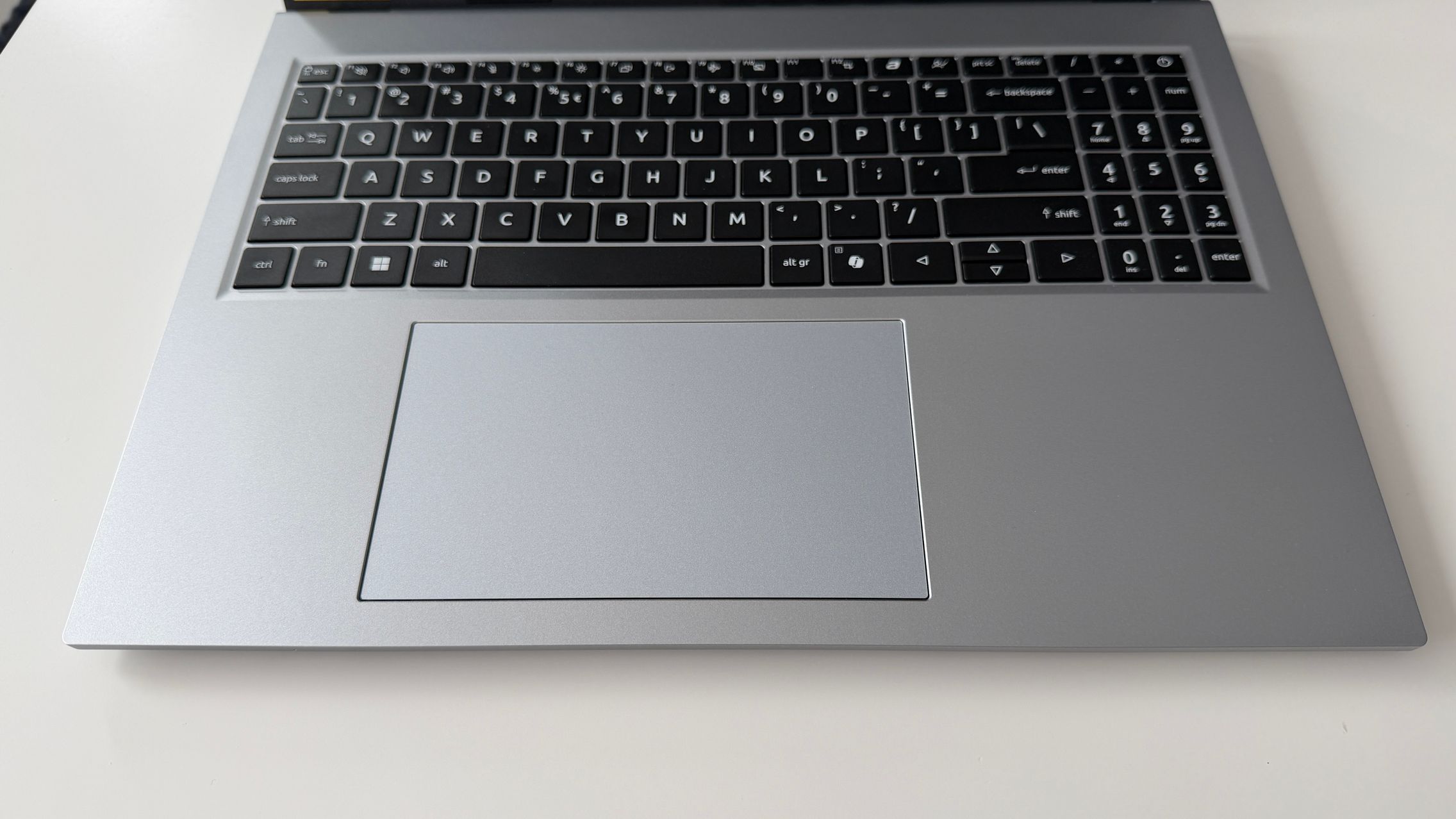 Îmi place cum se ridică acel capac, acționând ca un kickstand pentru tastatură și astfel am avut o experiență de typing înclinată, mai comodă. E un touchpad mare prezent aici, iar tastatura include și zona NumPad care e sinonimă cu productivitatea. E un design practic și curat, care funcționează și nici muchiile ecranului nu sunt groase cât să te distragă.