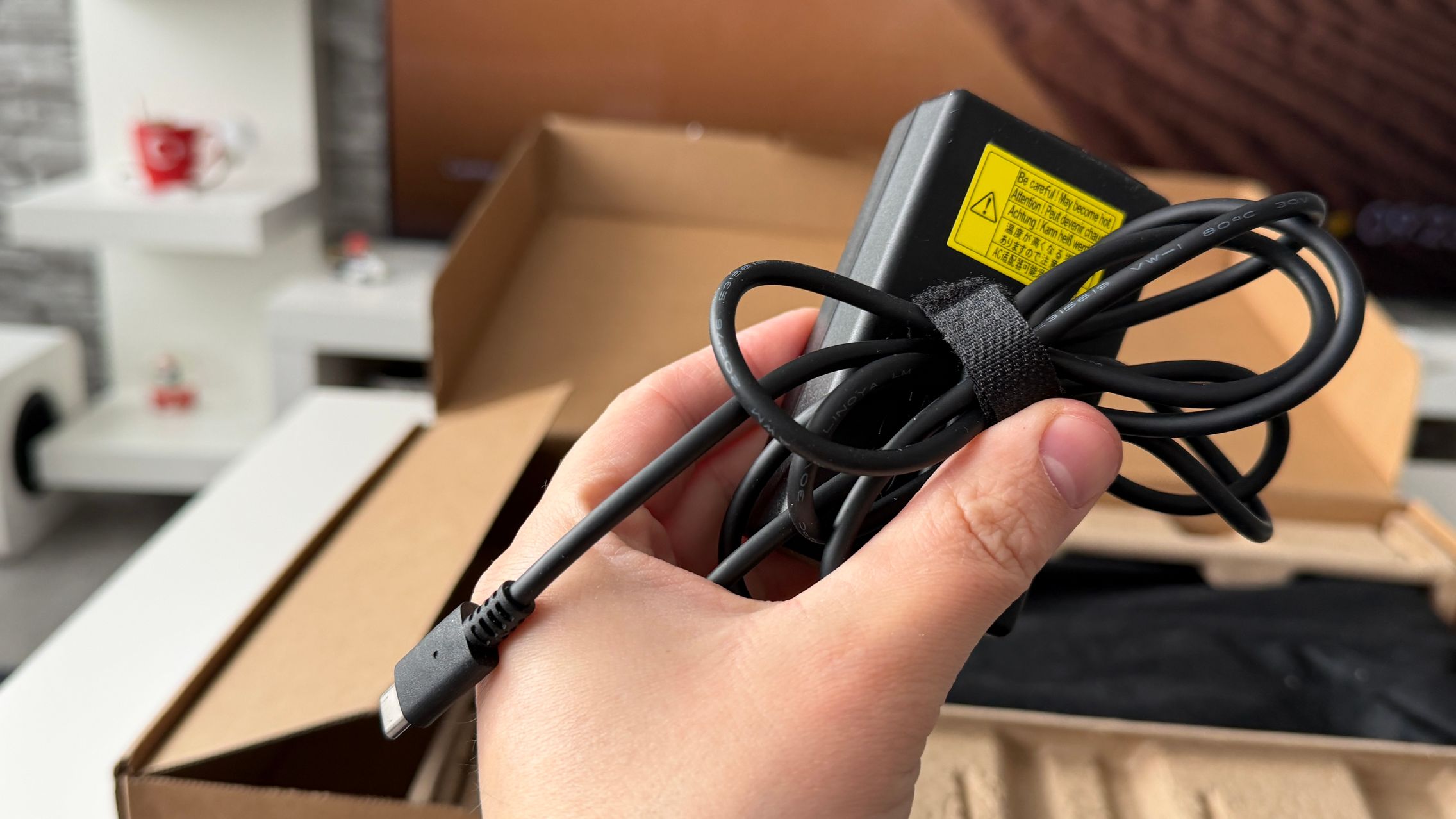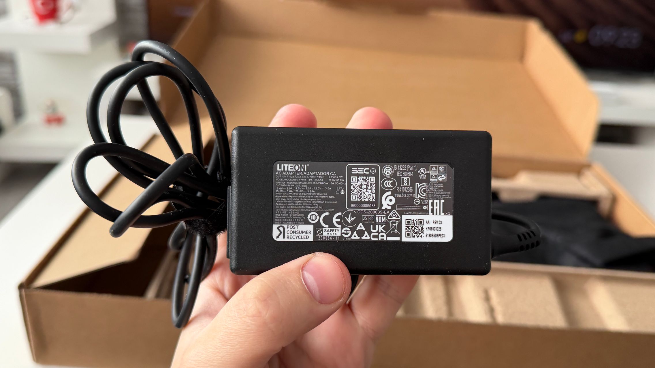 În cutia laptop-ului ACER Aspire Go 16 am găsit strictul necesar pentru un asemenea produs în 2026, adică adaptorul compus din două unități. Nu e baban ca la modelele de gaming și se poate transporta destul de ușor într-un ghiozdan la nevoie. Îmi place că laptop-ul este bine protejat la interior, așa că nu îți faci griji cu privire la transportul pe curier. Vine în formatul cutie în cutie.