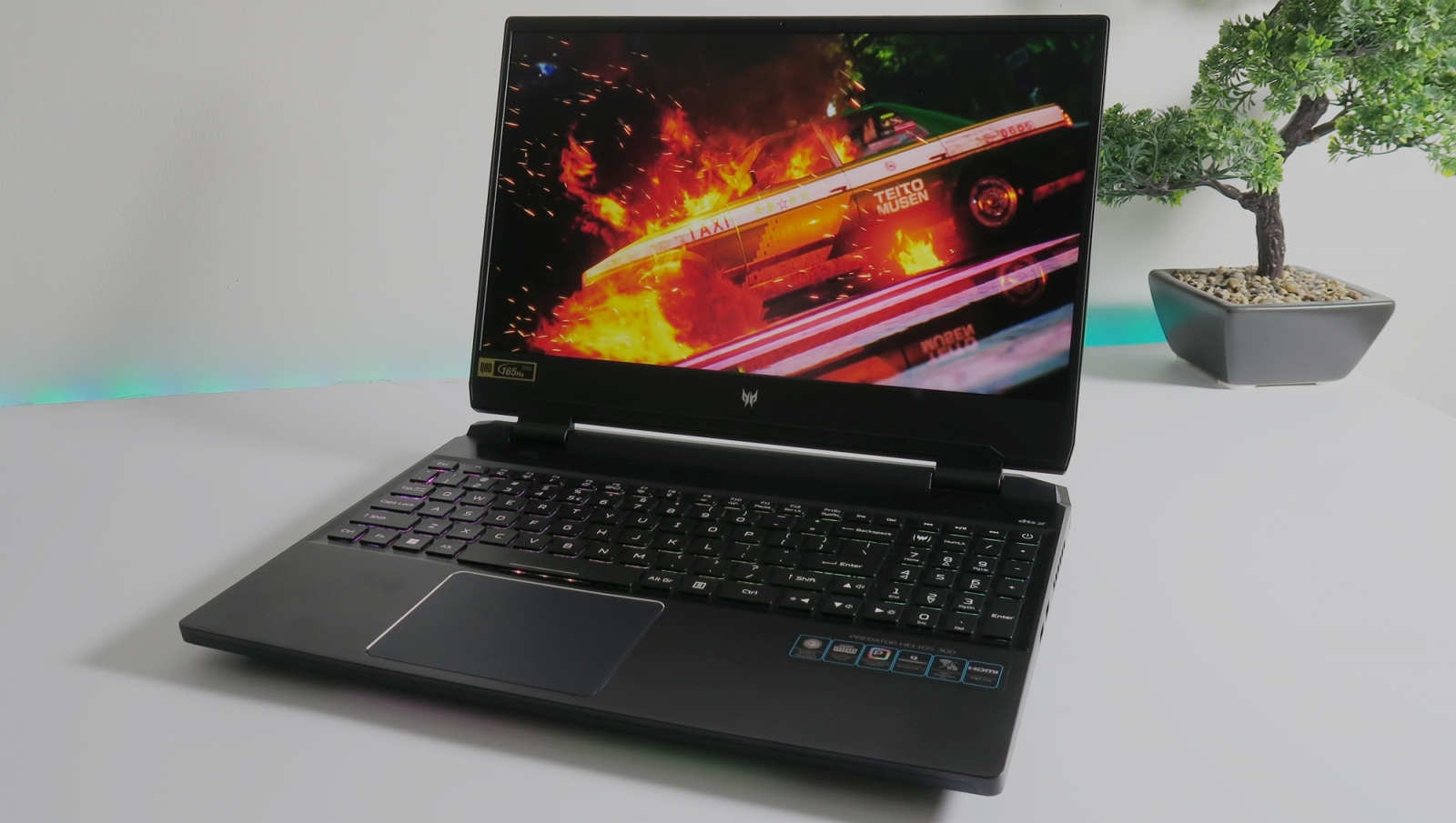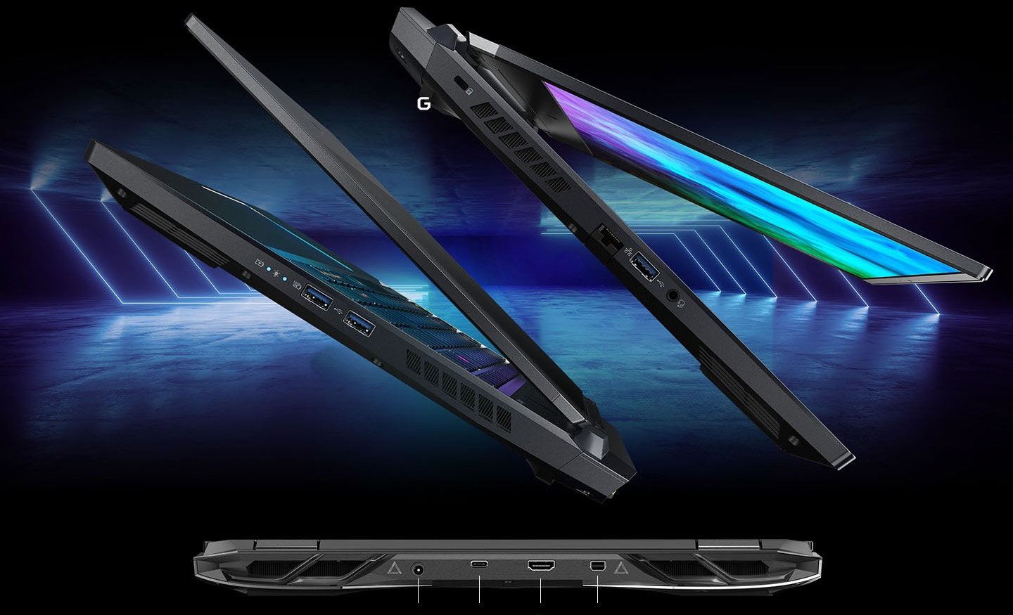 Revenind la design, în spate avem parte de un logo Predator iluminat, foarte atractiv, dar mai avem și o bară iluminată amplasată frontal, în partea de jos. Aceasta poate fi configurată după bunul plac și este integrată destul de subtil. O parte din porturi sunt amplasate lateral, dar avem câteva integrate în zona din spate precum HDMI, portul de alimentare și un port USB-C (Thunderbolt 4).