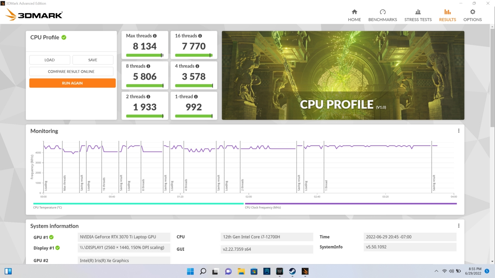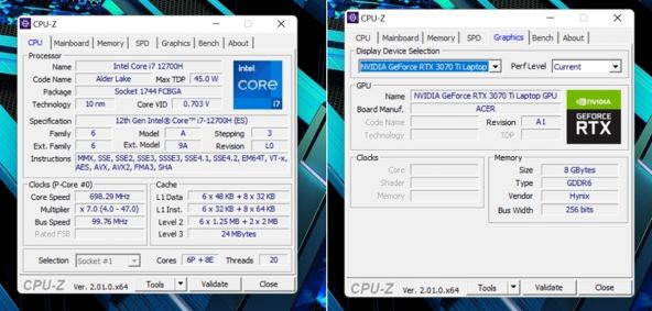 Acer Predator Helios 300 sosește în mai multe configurații, însă la mine a venit varianta ce implică un procesor Intel Core i7-12700H. Este un cipset fabricat pe un proces de litografiere de 10nm cu TDP maxim de 45W. Rulează la o frecvență de bază de 3.5GHz, dar intră în turbo până la 4.7GHz. Grafica este asigurată de o placă video NVIDIA GeForce RTX 3070 Ti, cu 8 GB de memorie GDDR6 și primim aici și 32 GB de memorie RAM de nouă generație, DDR5. Putem face și upgrade pentru a ajunge la 64 GB de memorie RAM.
