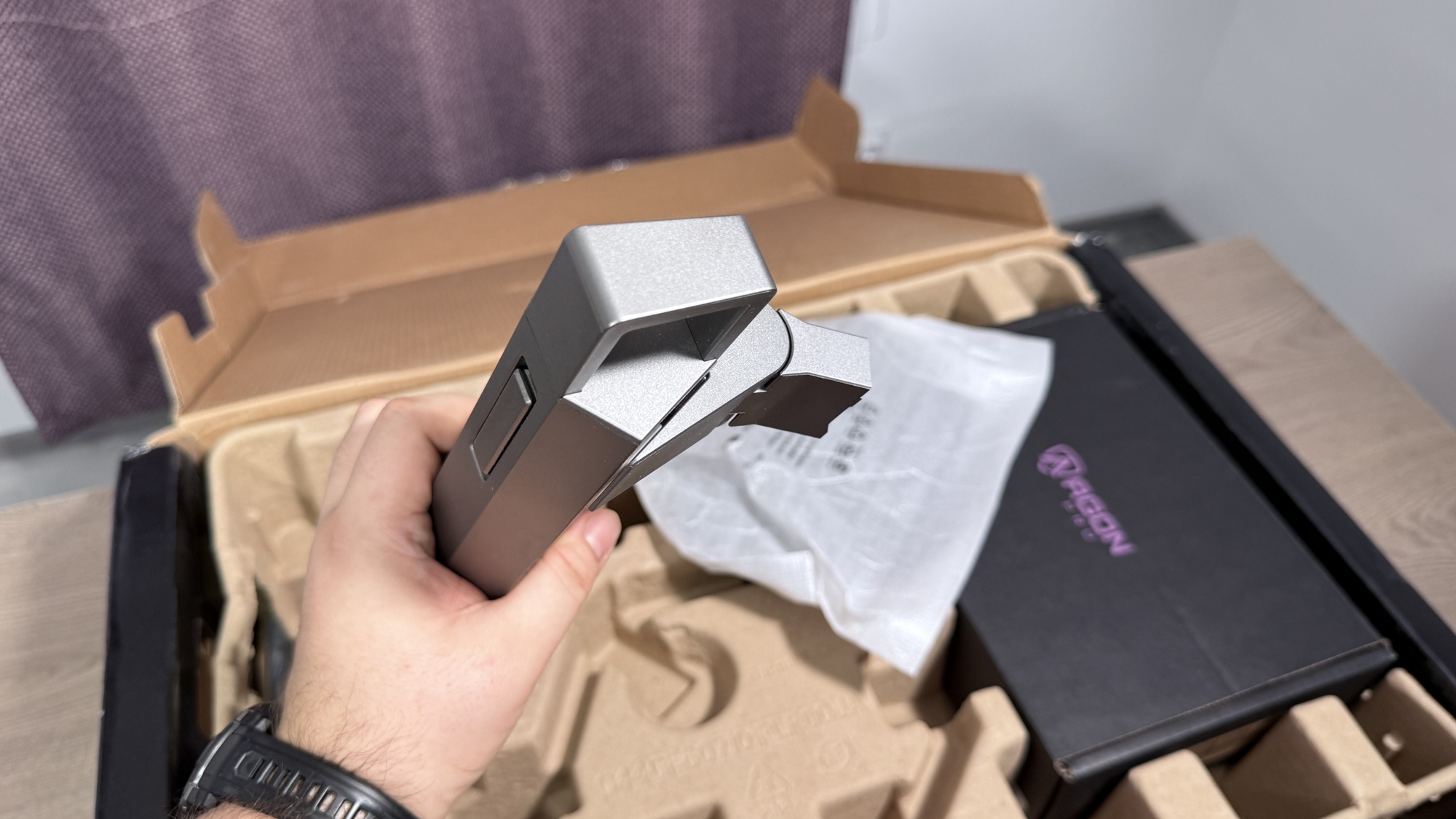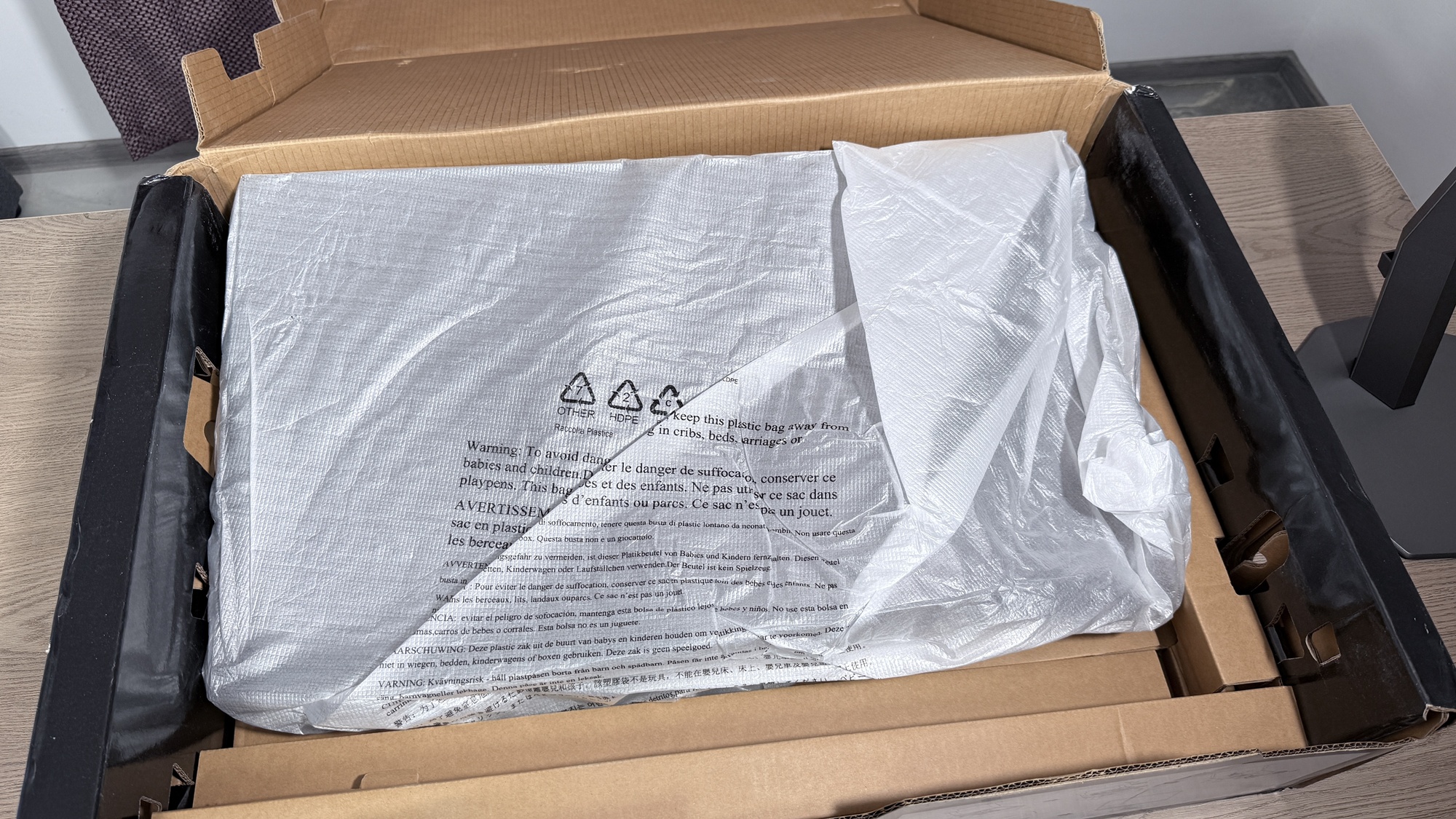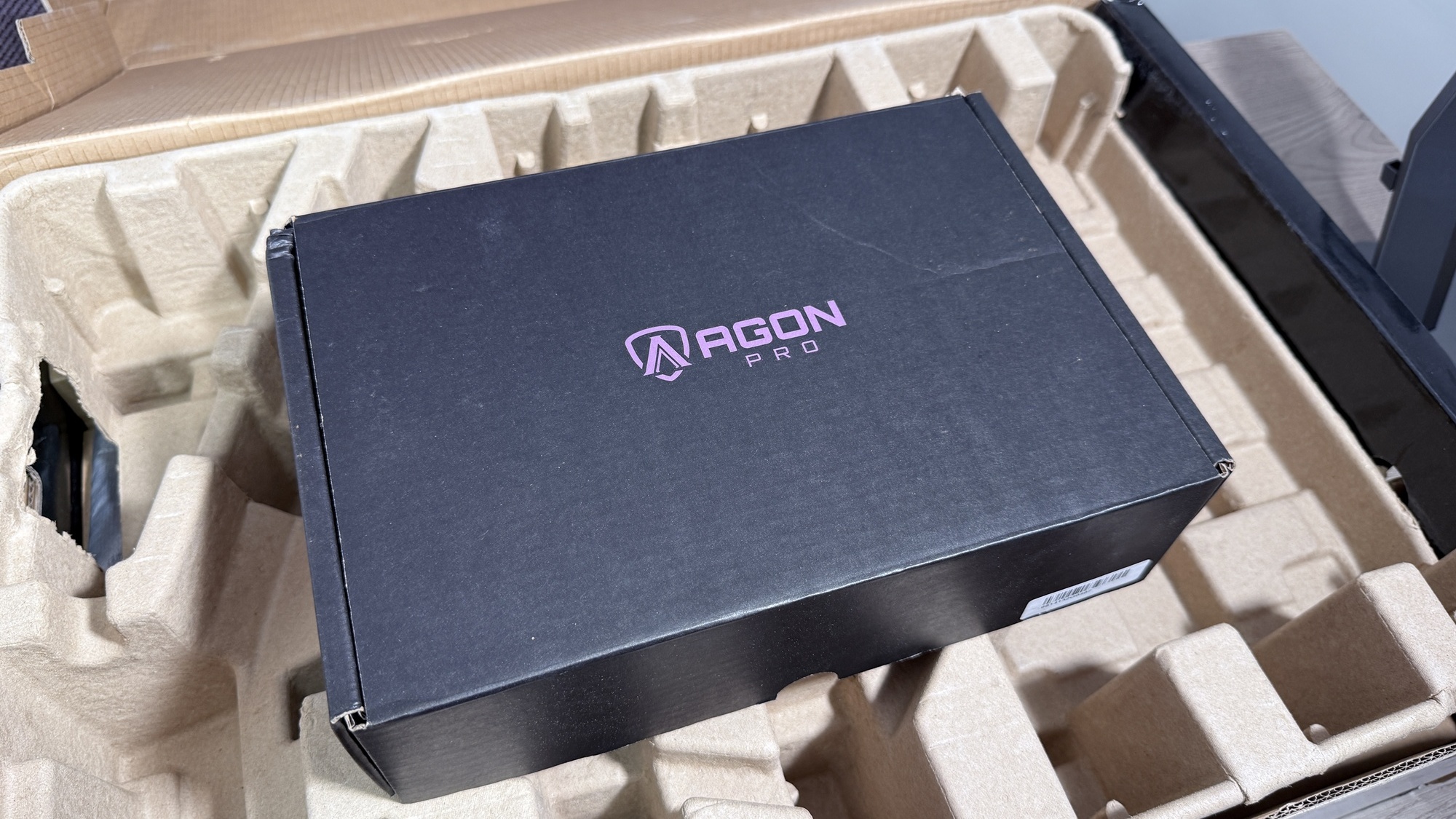 Cutia monitorului e mare, dar nu tocmai intimidantă. AOC a ambalat inteligent monitorul, aducând și cofraj pentru extra-protecție la transport. Avem accesorii protejate individual, cabluri HDMI, DisplayPort, dar și USB-B pentru hub și alimentare. În pachet găsim și un stand, dezvoltat alături de jucători profesioniști din lumea eSports.