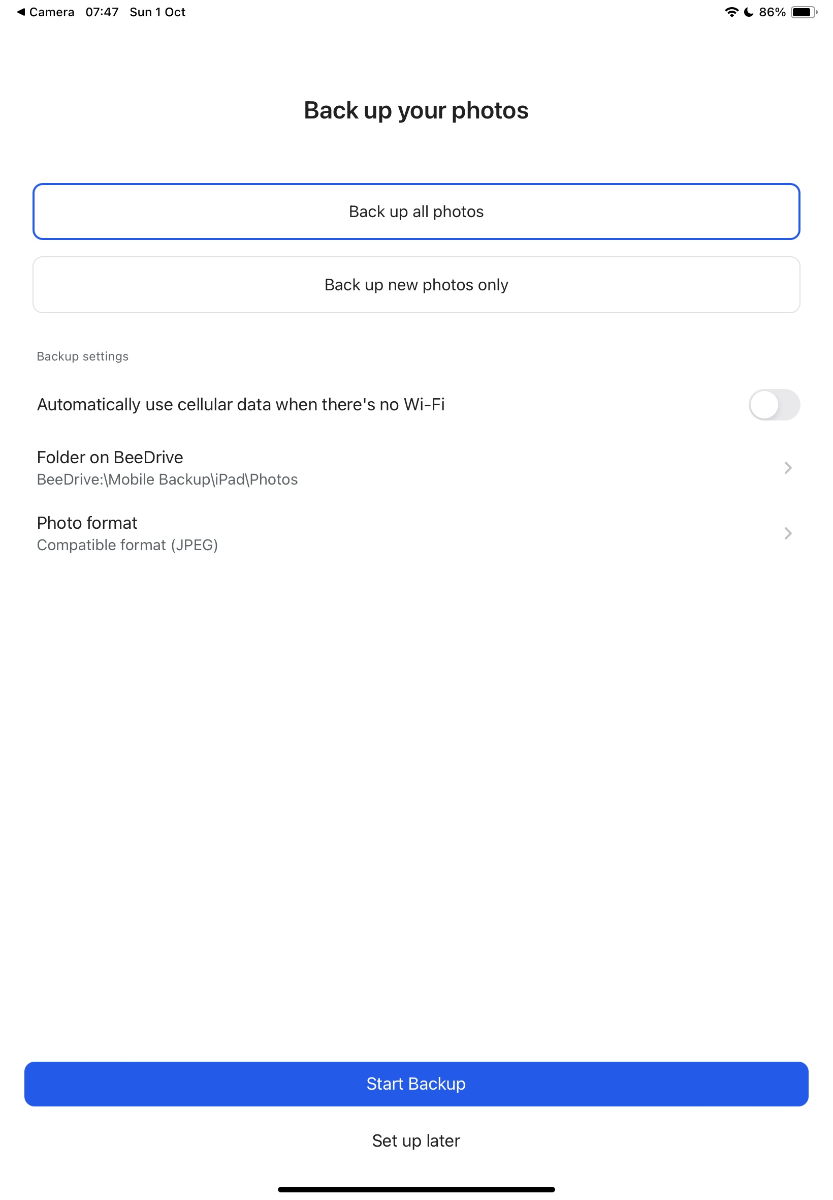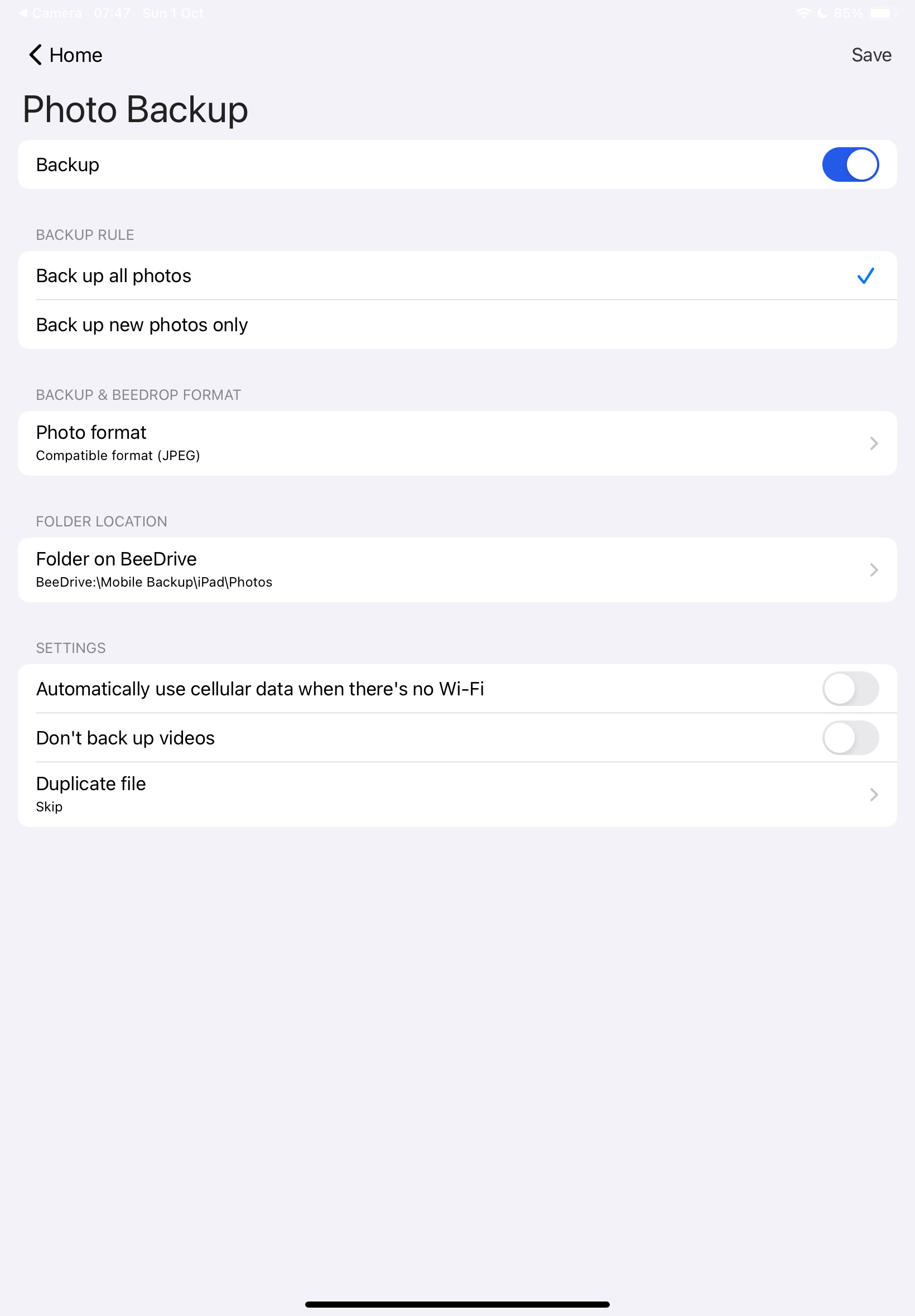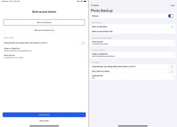Poți efectua o copie de rezervă a fotografiilor pe până la 5 dispozitive mobile utilizând aplicația BeeDrive Mobile. Mi-a plăcut că pe iOS există chiar posibilitatea de a face copii de rezervă a mediilor HEIF și HEVC în format JPEG. Astfel poți deschide fotografii realizate cu iPhone-ul chiar și pe device-uri care nu sunt de la Apple. Dacă ești curios de capacitatea de stocare, poți salva până la 833.000 de fotografii pe acest device compact.