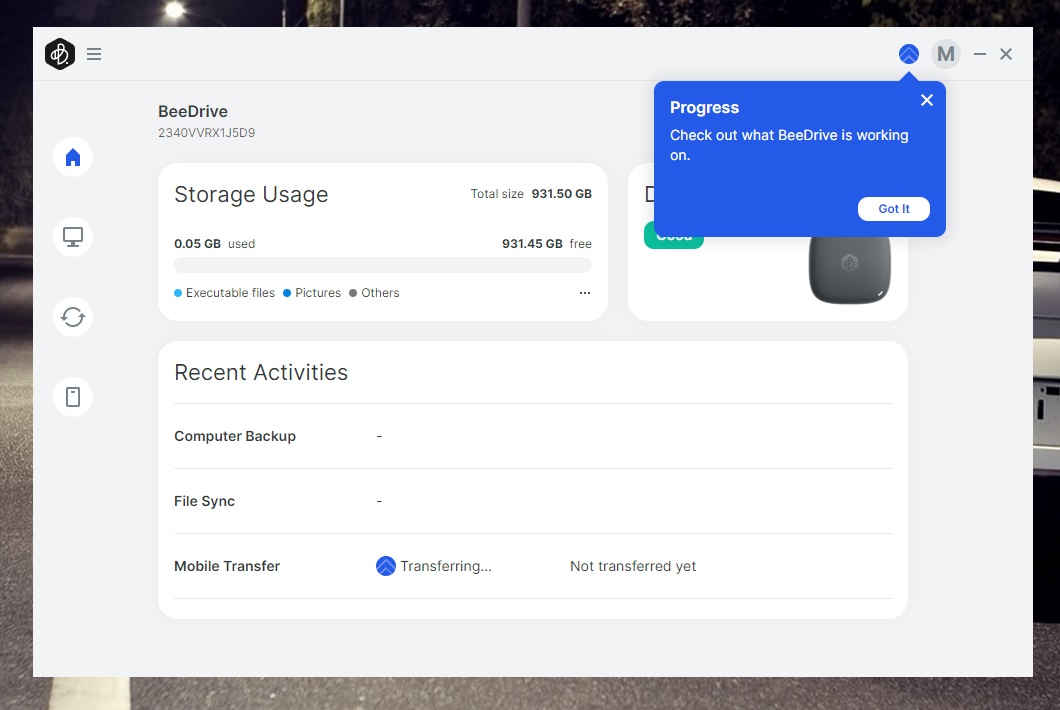 Totul decurge destul de ușor, dar vei avea nevoie de un PC pentru a folosi BeeDrive. Conectezi micul hub prin USB-C la laptopul / PC-ul tău, iar el va fi recunoscut drept SSD extern / card de memorie. Software-ul BeeDrive for Desktop e deja stocat pe dispozitiv și îl poți instala ușor.