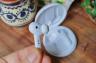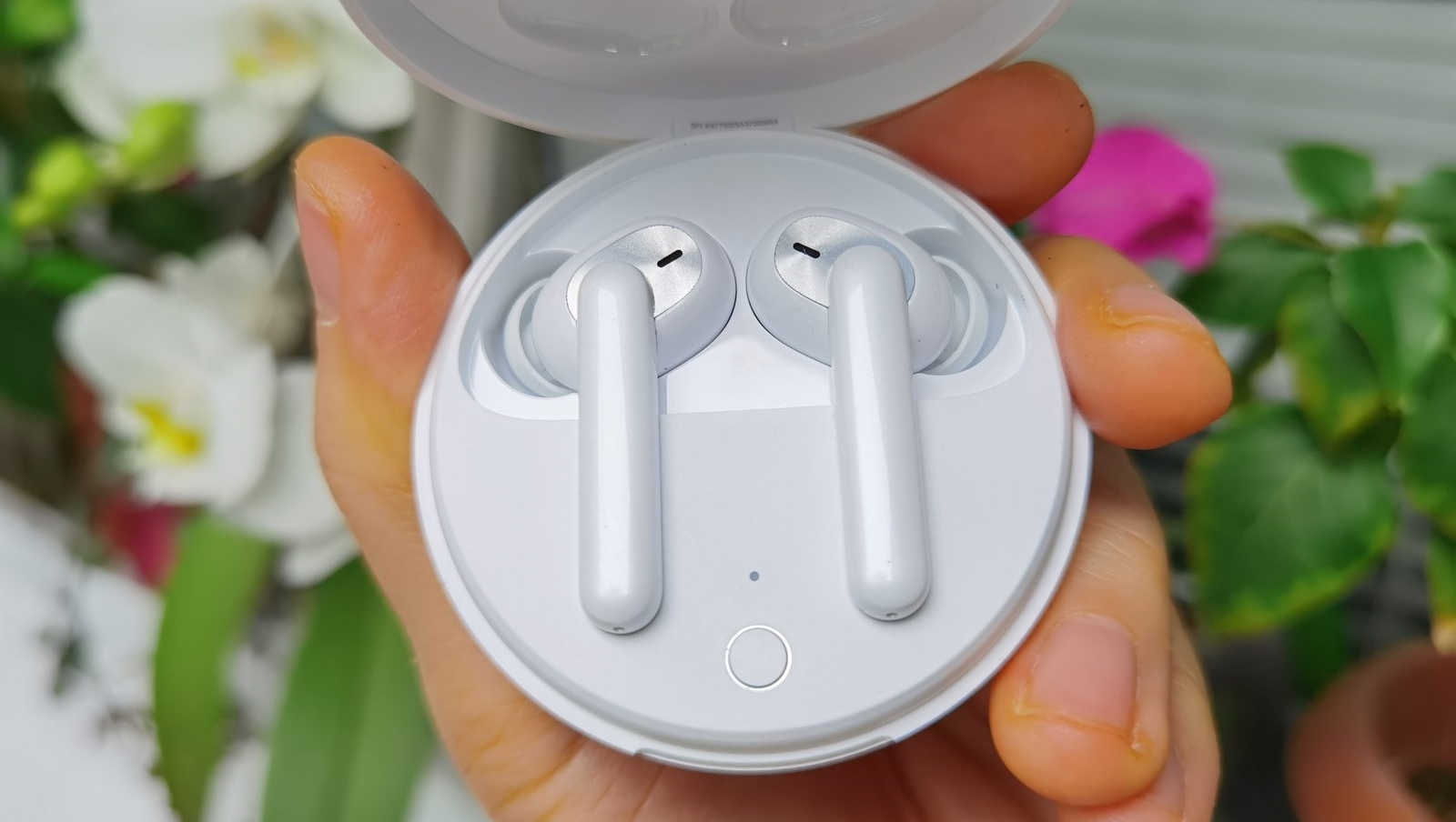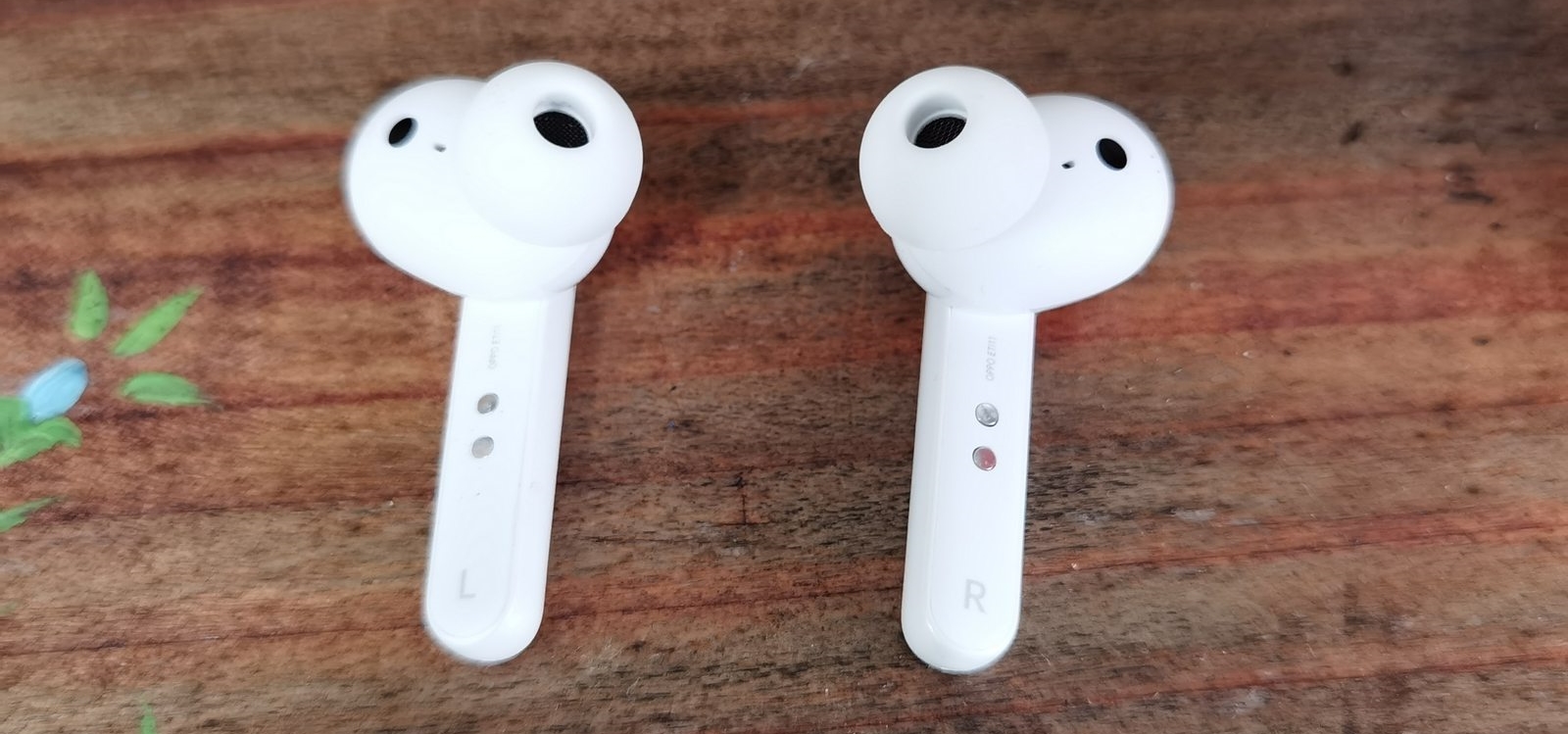 Căştile + cutia cântăresc 50 de grame, iar fiecare cască are doar câteva grame. Este realizată din plastic, are dop din silicon moale şi corp ergonomic. Ca design căştile aduc cu AirPods Pro şi stau comod în ureche. Nu cad nici la jogging, alergat pe eliptică sau flotări. Îmi place că acea parte alungită nu este exagerat de alungită, ca la alte produse rivale.