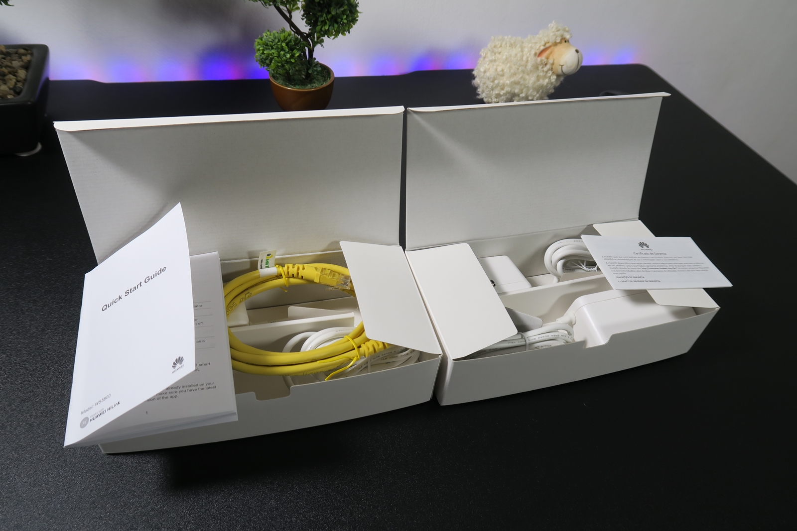 Huawei a reușit să ofere o experiență de unboxing premium și elegantă. Cutia este albă, simplă și se deschide prin glisare de jos în sus. Înauntru regăsim cele trei unități Mesh și alte două cutii mai mici care conțin trei adaptoare de rețea, manual de utilizare, garanție și un cablu Ethernet-Ethernet pe care îl vom utiliza la configurarea rețelei.