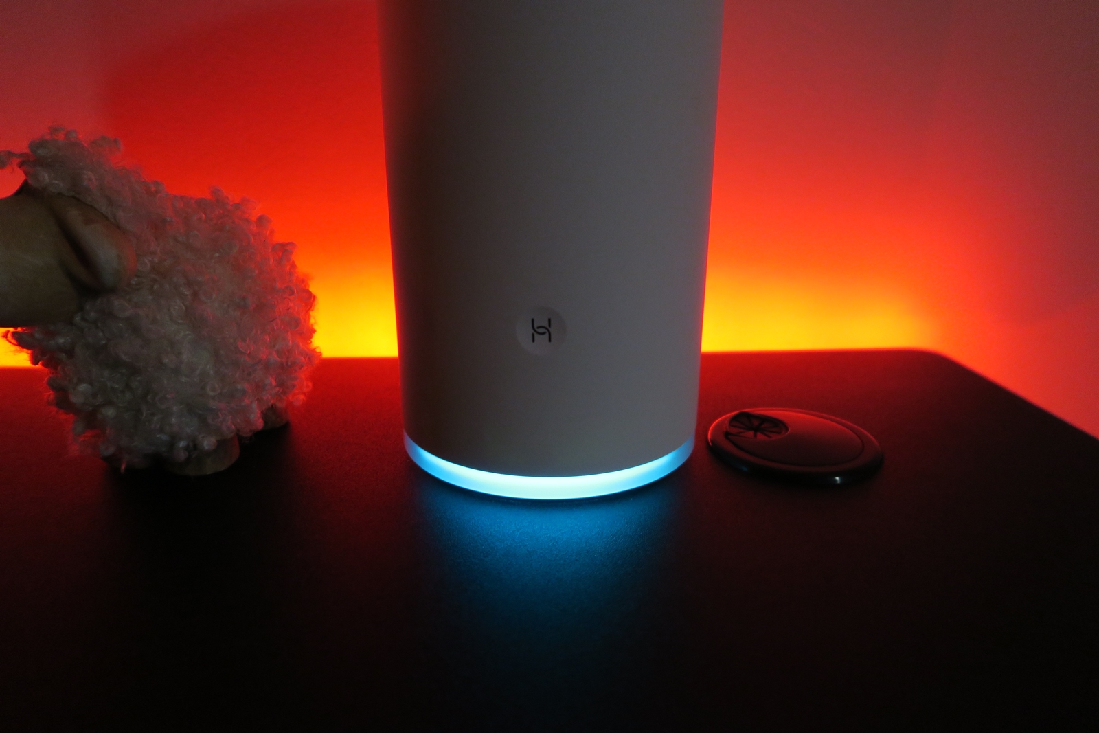 Cât despre design, routerele adoptă o formă cilindrică și sunt realizate din plastic mat, alb, foarte plăcut la atingere. În partea inferioară prezintă un indicator luminos sub formă de bandă care ne va indica starea rețelei prin diferite culori. În partea din spate fiecare unitate Huawei Mesh prezintă un buton power, un buton reset, portul de alimentare, un port WAN Gigabit și două porturi LAN. La bază apar informații despre SSID și o serie de guri de ventilație pe fiecare unitate Mesh.