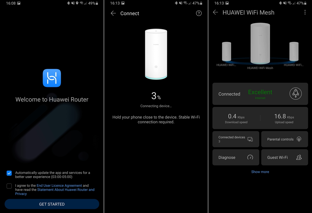 Dispozitivele ies în evidență prin faptul că putem conecta smartphone-uri foarte facil, prin intermediul HuaweiShare. În partea superioară se află tag-ul NFC iar atingându-l cu telefonul mobil ne vom conecta fără a fi nevoie să introducem parola. Odată conectați la rețea, terminalele noastre vor prelua semnal automat de la cel mai apropiat router din sistem, cel care asigură cea mai bună conexiune întrucât Huawei a inclus aici tehnologii de roaming și band steering. Bifăm și controlul parental și posibilitatea de a crea o rețea pentru oaspeți direct din aplicația mobilă.