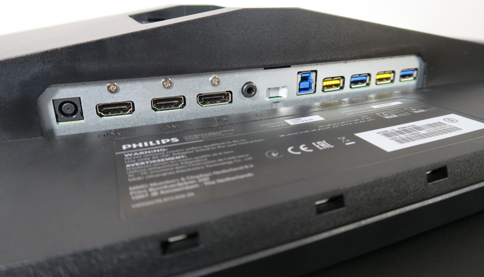 Nici pe partea de conectivitate nu stăm rău. Porturile sunt poziționate în spate, iar suportul prezintă un locaș pe unde putem scoate cablurile pentru un cable management mai bun. Avem aici două porturi HDMI 2.0 și unul DisplayPort + un port USB-B și patru porturi USB Type A 3.2. Mai regăsim aici și un jack de 3.5 mm pentru căști/boxe. De remarcat că porturile USB colorate în galben pot fi folosite pentru încărcarea altor dispozitive rapid.