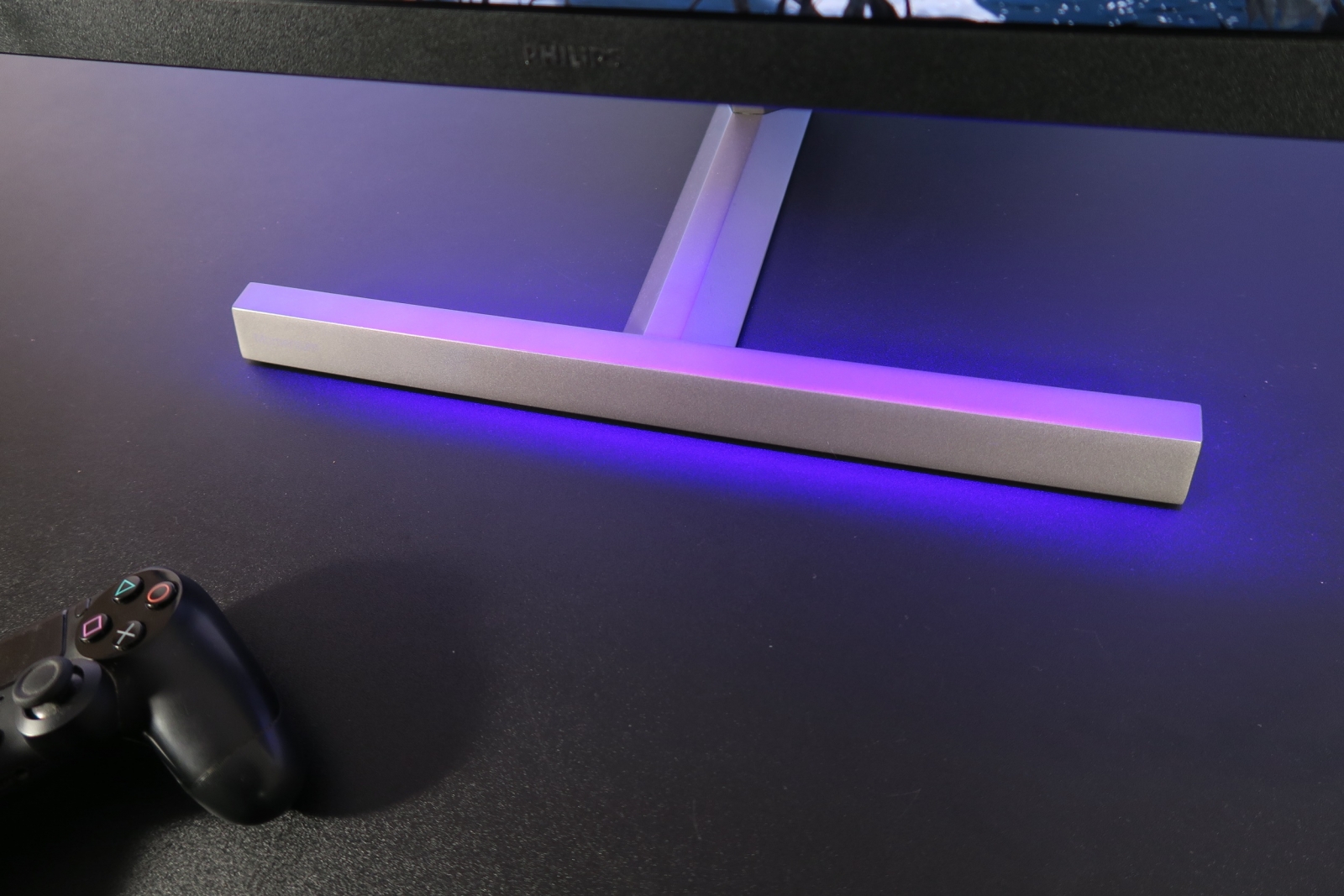 LED-urile Ambiglow din spate sunt impresionante și atât gamerii, cât și cinefilii le vor aprecia enorm. Deși standard partea de jos nu luminează, eu am activat-o și este utilă și în cazul tastării în timpul nopții. De asemenea, în timpul gamingului oferă o senzație de imersivitate. Eu obișnuiesc să stau cu geamul deschis mult timp, iar razele soarelui bat uneori chiar în ecran. Monitorul este foarte luminos, iar stratul Anti-Glare chiar are efect în timpul zilei.