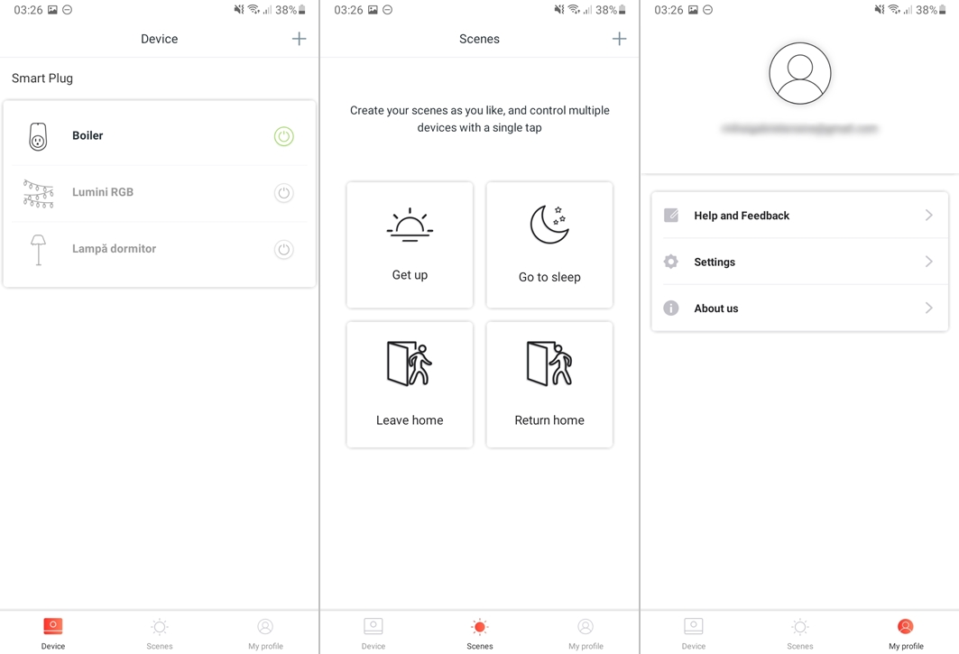 Revenind totuși la aplicație, aceasta are un design simplu, minimalist și este deosebit de intuitivă. Pe ecranul principal ne vor apărea dispozitivele conectate, iar în partea de jos mai regăsim două tab-uri. Unul este folosit pentru crearea și setarea unor scenarii, iar ultimul tab este dedicat setărilor pentru utilizator și suportului tehnic. Revenim totuși la tab-ul de scenarii, întrucât acesta este destul de complex, dar ușor de înțeles după câteva minute. Dacă aveți mai multe dispozitive de tip Smart Home compatibile Beli, acestea pot acționa simultan conform cu programul creat: Get up, Go to sleep, Leave Home sau Return Home.