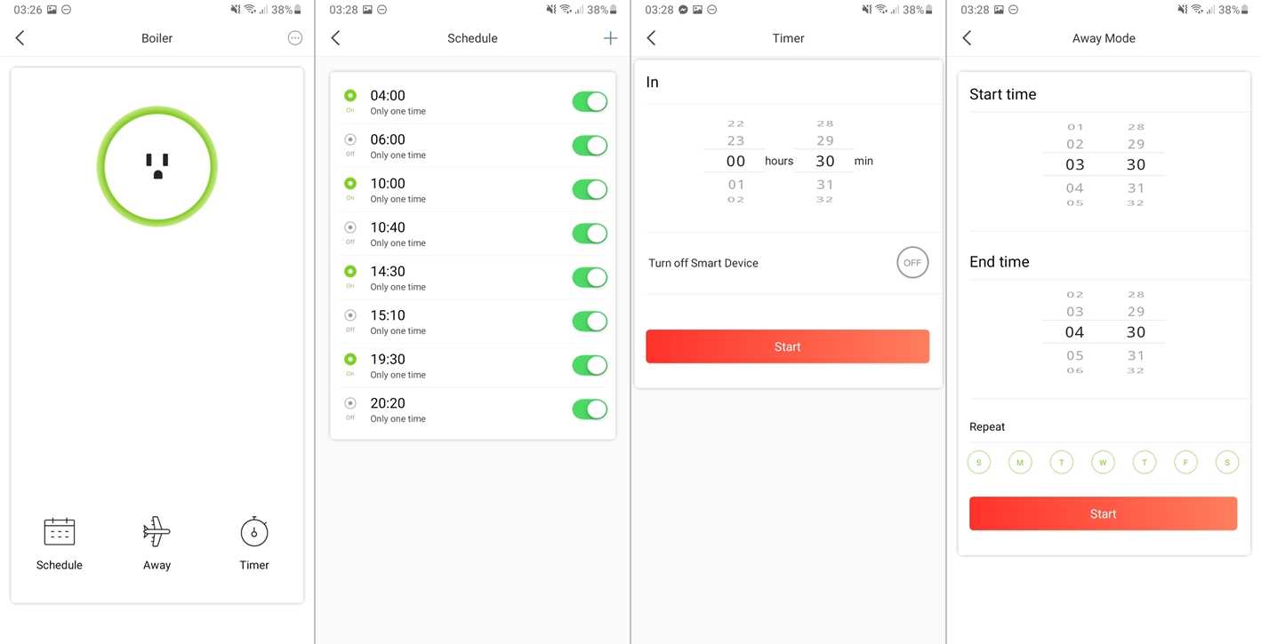 De asemenea, tot din aplicație avem posibilitatea de a crea programe sau a seta un timer pentru a stinge sau porni priza. Este foarte util în cazul copiilor. Puteți astfel seta ca lampa de veghe să se stingă peste câteva ore. Totodată, dacă nu aveți un router WiFi care să permită programarea, puteți seta ca acesta să se închidă după ora de culcare și să pornească dimineața devreme. Avem aici și un mod“Away” pentru momentele în care nimeni nu este acasă. Acest mod funcționează cel mai bine dacă aveți mai multe prize și corpuri de iluminat conectate la acestea, în diferite încăperi. Dispozitivele vor porni simultan, în mod aleatoriu, simulând prezența cuiva în casă. Este practic o metodă foarte eficientă și ieftină pentru a vă proteja locuința.