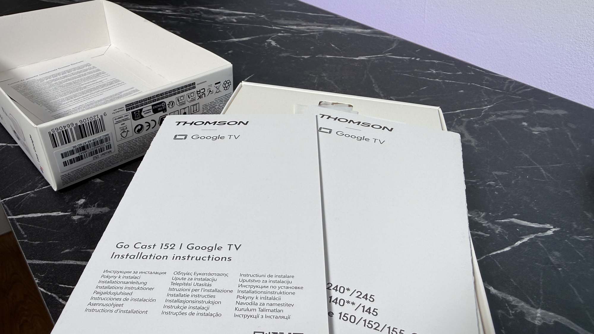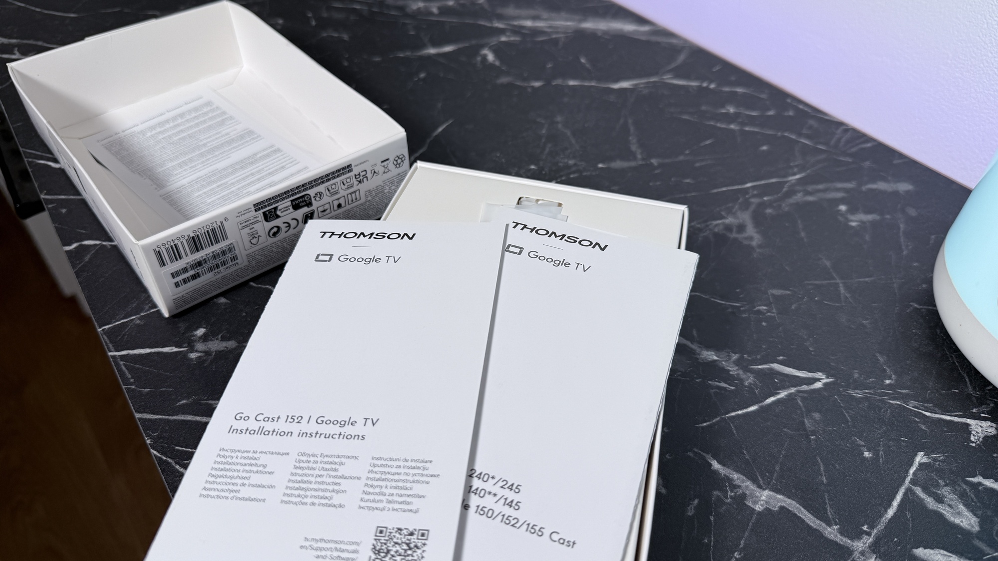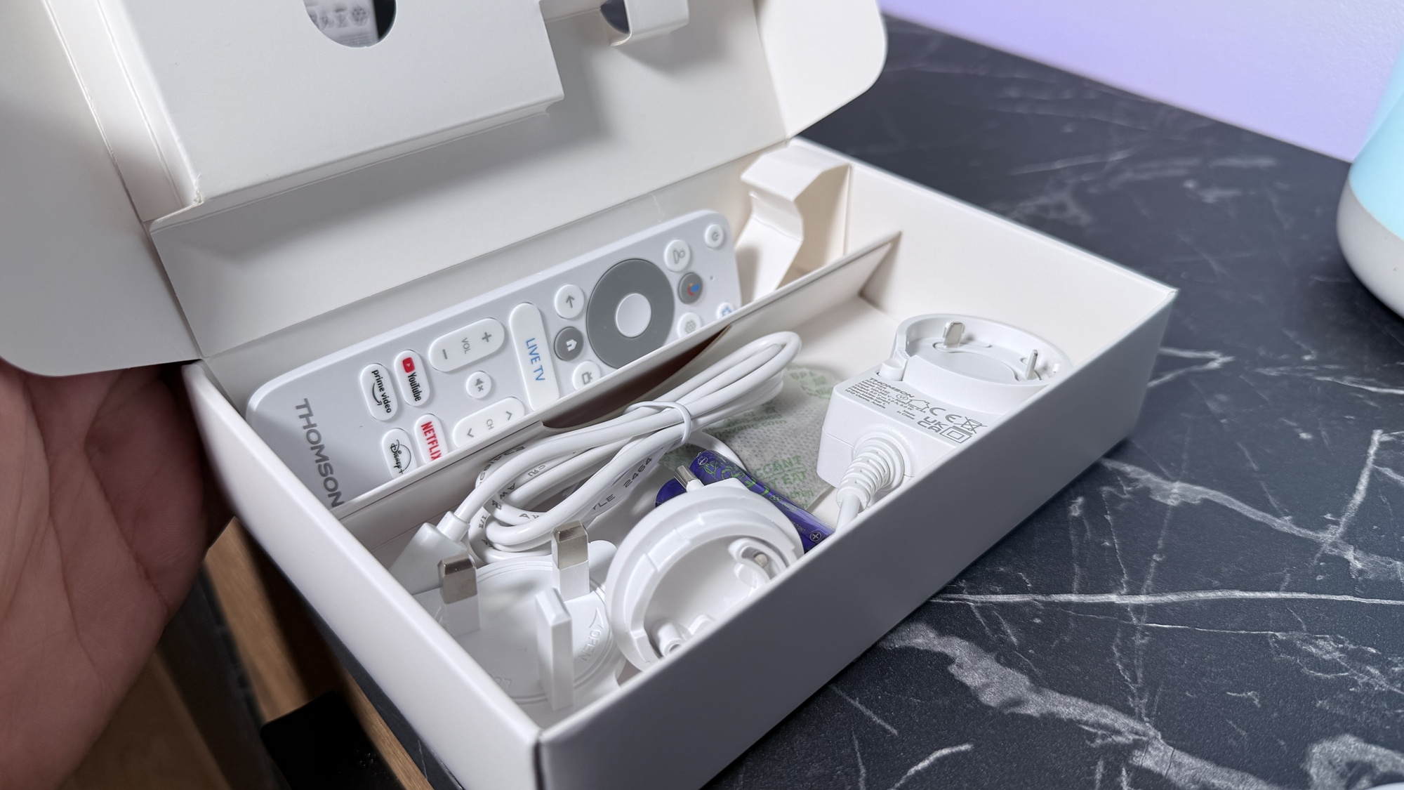 Avem de-a face cu o cutie de mici dimensiuni, similară cu a predecesorului, de culoare albă, care include câteva informații cu privire la dispozitiv. Thomson Google TV Go Cast 152 (4K) se află în interior, alături de instrucțiuni de instalare, ghid de pornire rapidă, telecomandă și alimentator cu adaptoare de UK și România. E tare bună ideea, mai ales că e un gadget compact ce poate fi transportat în vacanță, pentru a avea conținutul preferat la hotel / pensiune, în concediu.