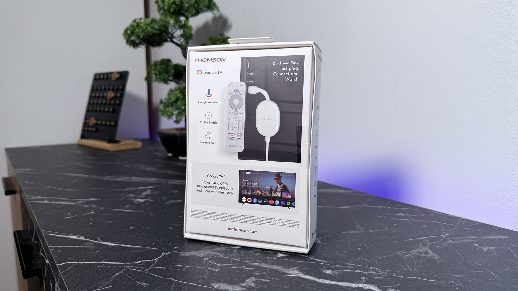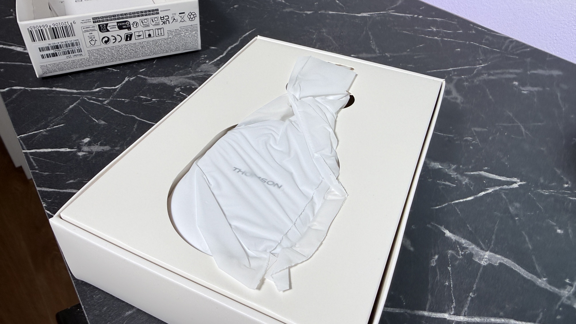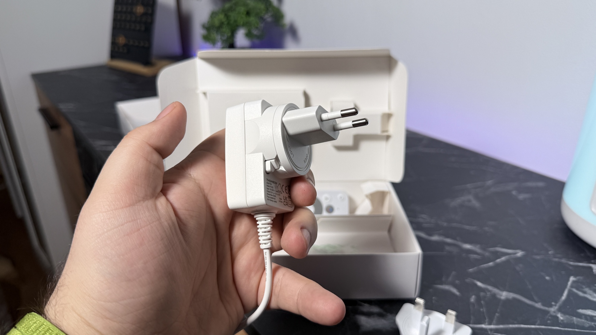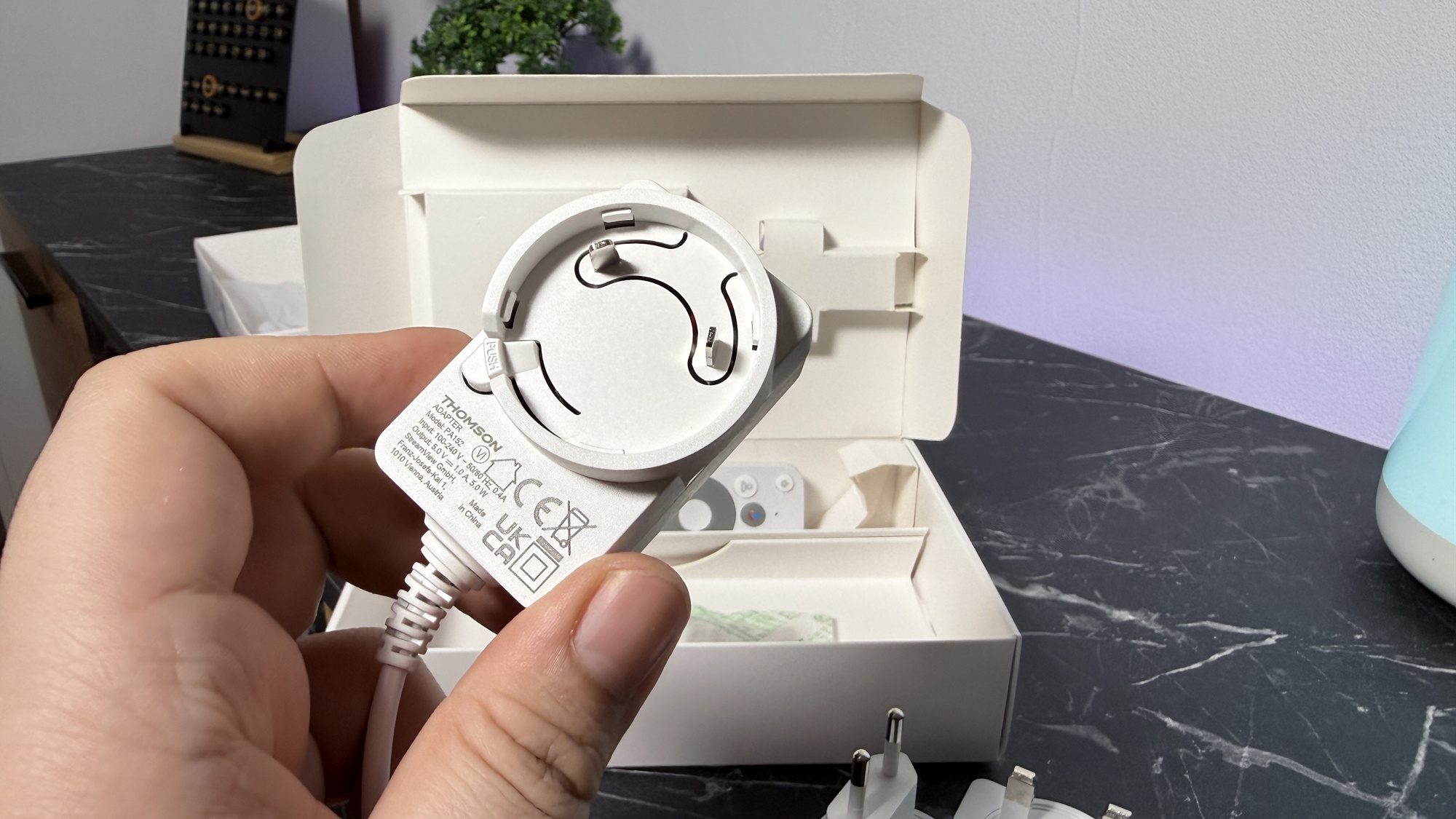 Avem de-a face cu o cutie de mici dimensiuni, similară cu a predecesorului, de culoare albă, care include câteva informații cu privire la dispozitiv. Thomson Google TV Go Cast 152 (4K) se află în interior, alături de instrucțiuni de instalare, ghid de pornire rapidă, telecomandă și alimentator cu adaptoare de UK și România. E tare bună ideea, mai ales că e un gadget compact ce poate fi transportat în vacanță, pentru a avea conținutul preferat la hotel / pensiune, în concediu.