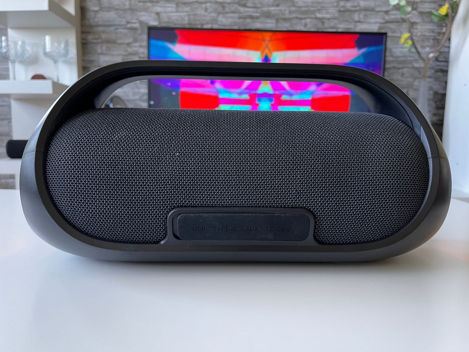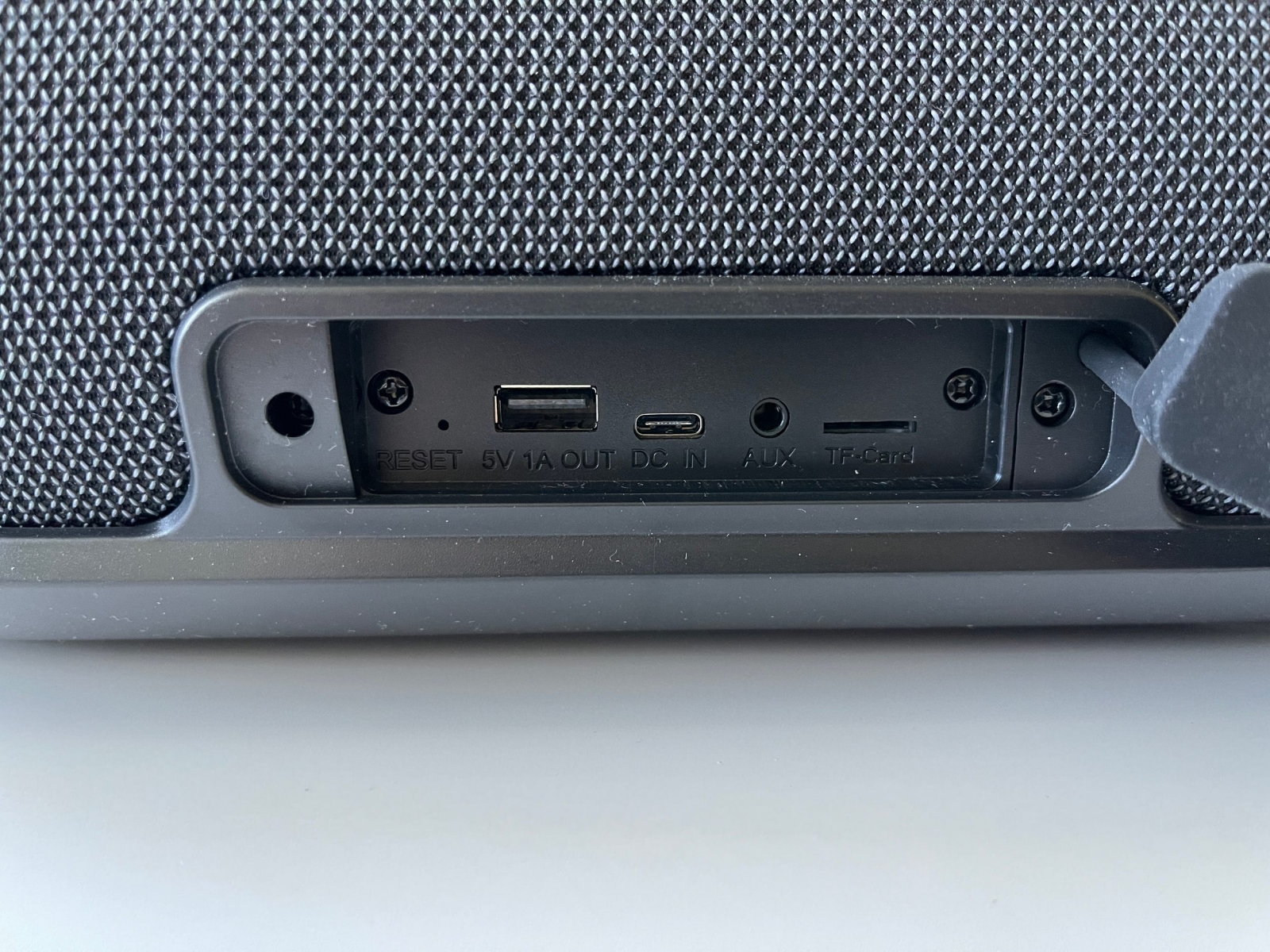 Avantajul e că boxa se încarcă cu USB-C, ceea ce îi oferă două avantaje: în primul rând, se încarcă mai repede (dacă o lăsați peste noapte, a doua zi are bateria full), iar, în al doilea rând, aveți acces ușor la o astfel de mufă, fiind foarte comună. Dacă discutăm despre porturi, aici avem o mufă USB-C, o mufă USB-A, un port jack, slot pentru card TF, U-disk și un port aux-in, astfel că avem o varietate mare de moduri în care putem reda muzica la boxă.