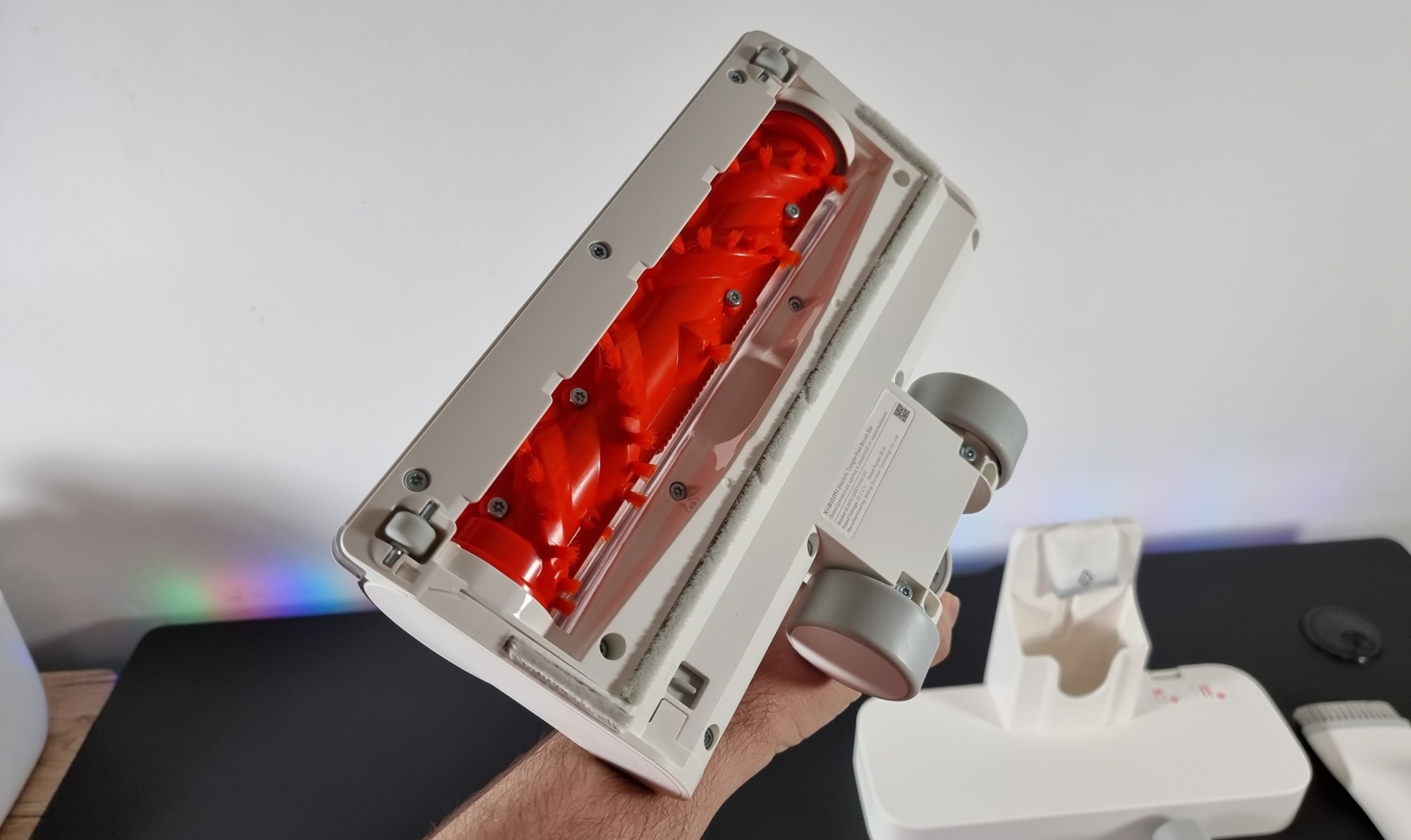 Din câte puteți observa, e păstrat designul minimalist în cazul tuturor accesoriilor. Tubul alungit e fabricat din aluminiu, însă majoritatea accesoriilor sunt fabricate din plastic. Peria principală și peria cu role sunt accesorii smart, electrice. Cea principală aduce o turbină rotativă cu perii. Are și un rol, evident, aceasta reușind să nu se încurce în firele de păr provenite de la animale. Cealaltă perie electrică are dimensiuni mai mici și este folosită împotriva acarienilor.