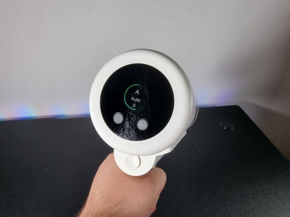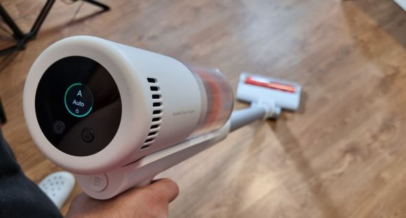 Primim un display TFT color care afișează modurile de operare, un buton pentru schimbarea acestor moduri, dar și un buton prin care accesăm modul continuu de curățare. Acesta din urmă ne permite să luăm degetul arătător de pe „trăgaciul” din față, întrucât în mod normal, aspiratorul e activ doar când îl ținem apăsat.