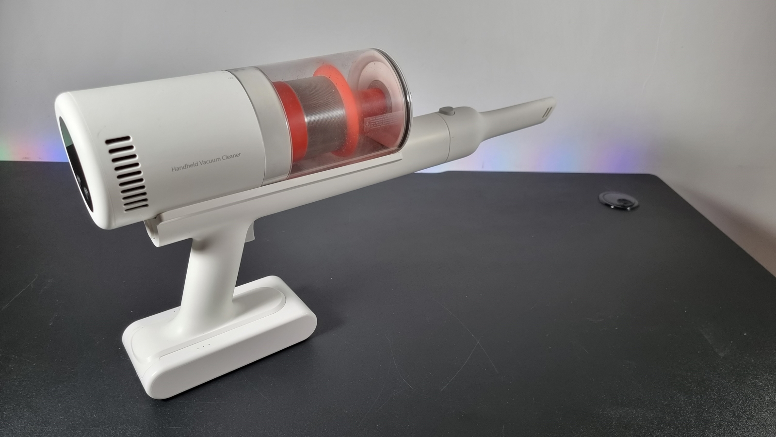 Aspiratorul aduce și o stație de andocare. Suportul pentru depozitare și încărcare trebuie atașat de un perete însă, folosind accesoriile din pachet. Îmi place faptul că recipientul de colectare e acum amplasat orizontal. Astfel, dacă cumva apeși din greșeală pe butonul care îl acționează, murdăria nu va ajunge pe podea.