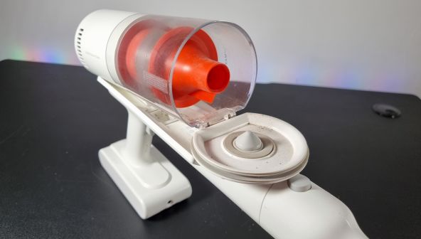 Puțin mai jos de această zonă există și un buton de evacuare a prafului. Odată apăsat, compartimentul de colectare se ridică ușor din poziția sa, iar fanta de ieșire este deschisă. Astfel, golești compartimentul fără ați murdări mâinile. Designul facilitează și descărcarea electrostatică, prevenind praful să se lipească de compartimentul de depozitare.